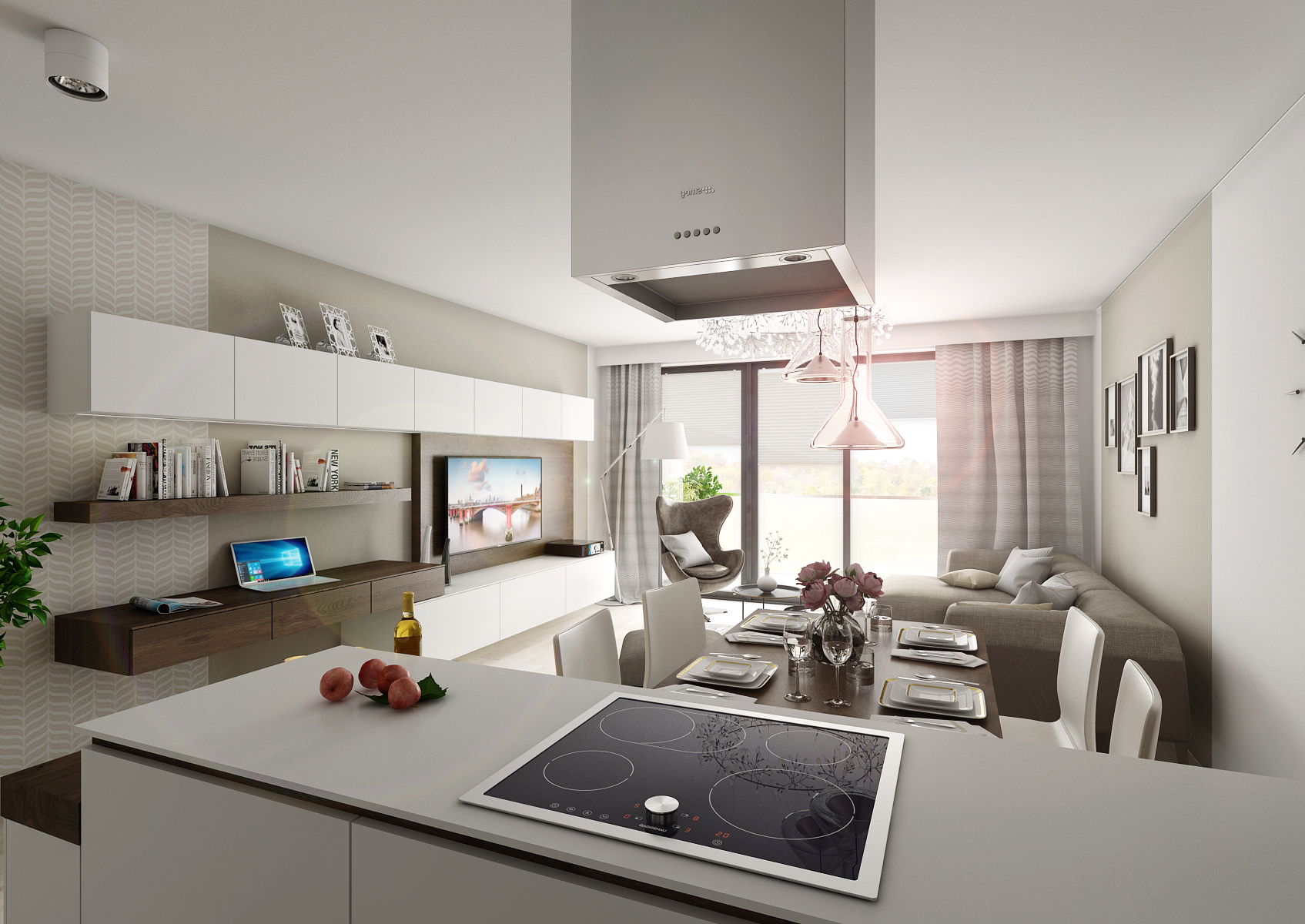 3D Visualization 360' - 2kk new building Pilsen. Interior design of a model apartment for a developer in neutral natural shades.