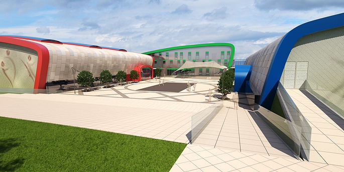 The design includes 2 multifunctional sports halls together with a hotel part for accommodation of athletes and visitors and provision of operational needs of the complex. Thanks to landscaping reconstructions during construction, there is also space for outdoor sports, such as tennis courts and a futsal playground. The emerging park is surrounded by an in-line track accessible to the public. The whole complex is connected to the existing roads by a system of level bridges and sidewalks.
