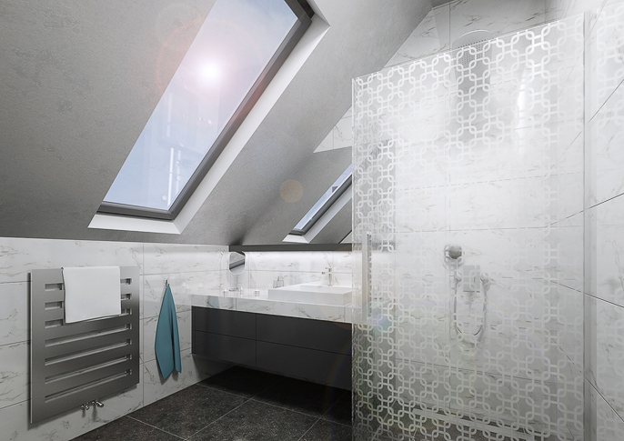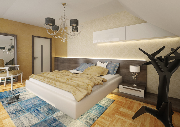 Modernly furnished apartment in a minimalist style with wenge veneer on the furniture elements. The interior is light and allows very comfortable use. A concrete trowel on the stairs, walls and kitchen unit then connects the individual parts of the apartment. The bedroom is again designed in a minimalist style, spiced up with a touch of Baroque. A clever combination of styles then creates an interesting overall effect. The design of the bathroom is based on the overall concept of the apartment, the sandblasted glass screen of the shower helps to visually divide the unfavorable layout of the bathroom.