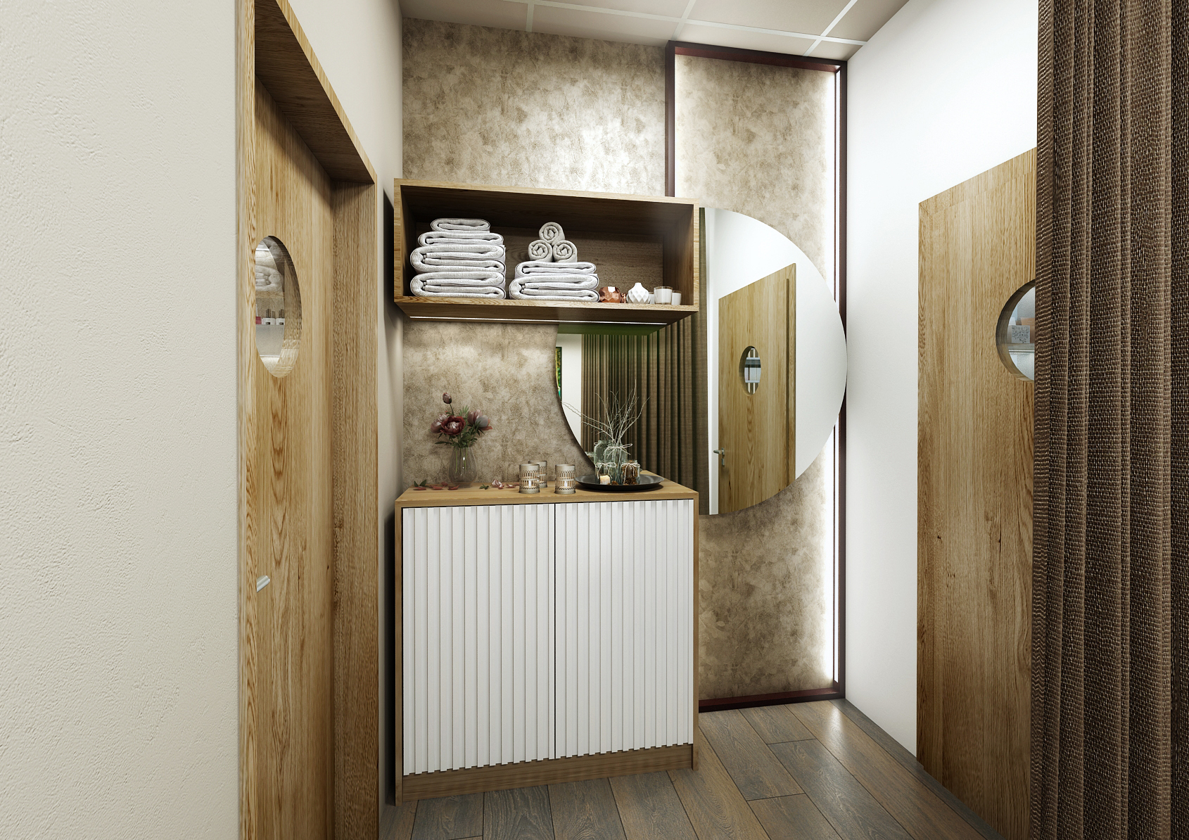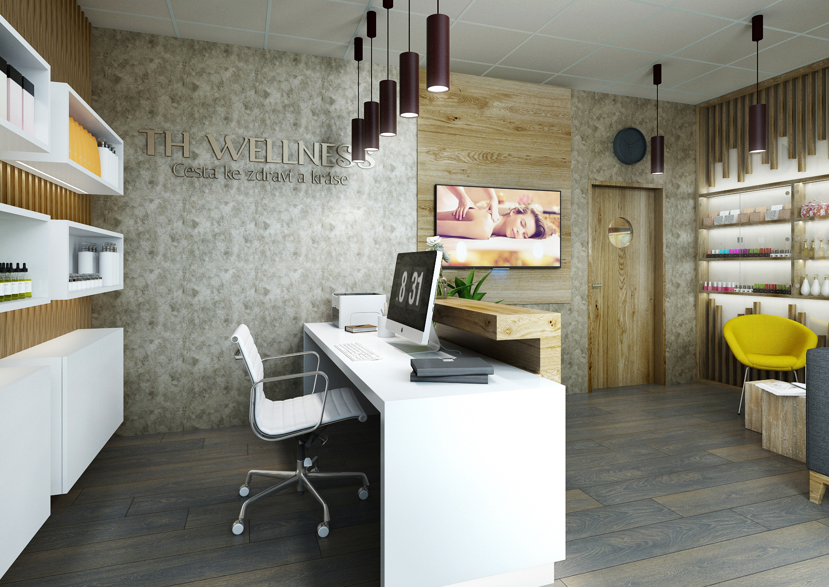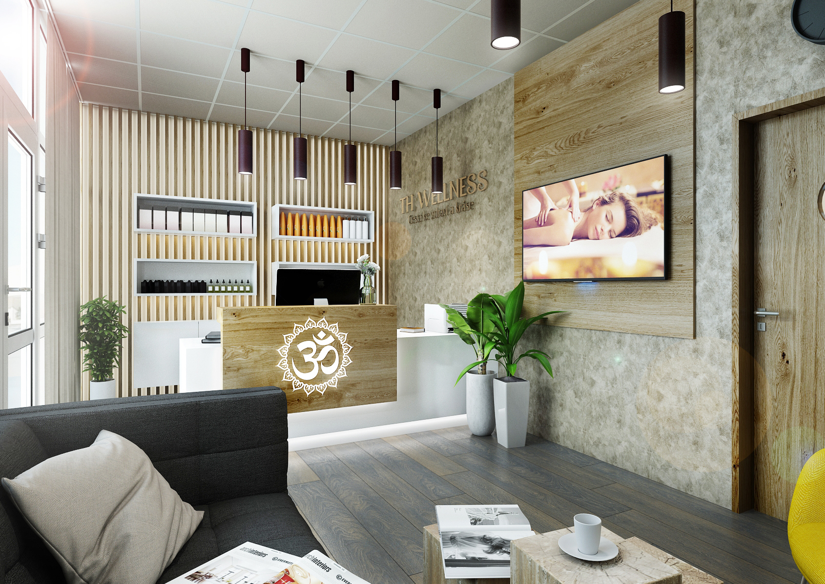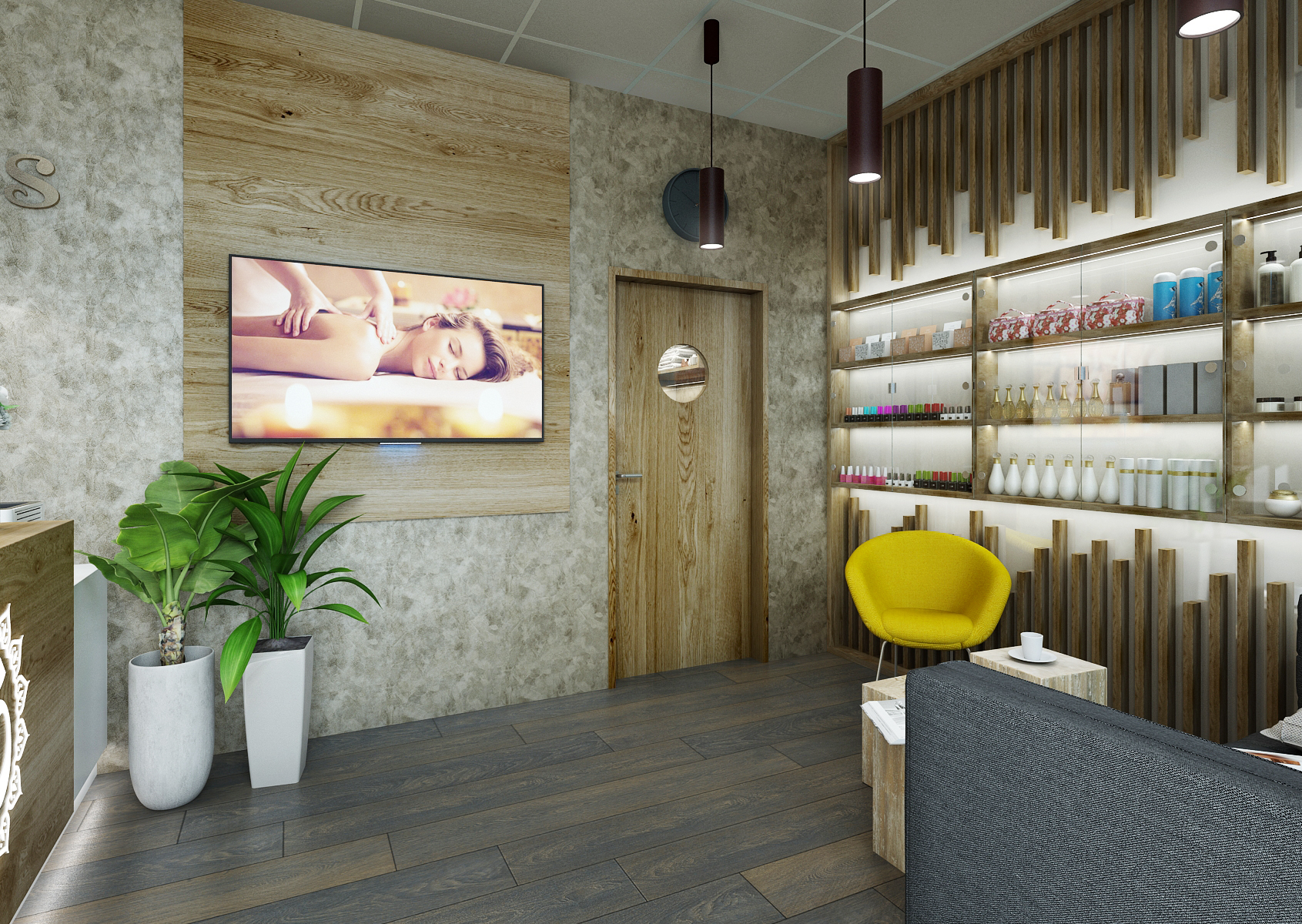 The interior of the wellness massage studio in Brno is tuned to earthy tones, which are complemented by wall panels in light wood decor and a structured concrete screed on the walls.