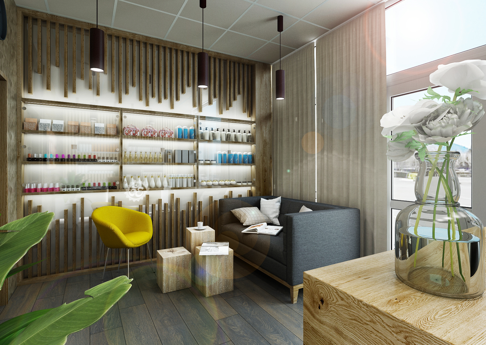 The reception of the wellness center welcomes visitors with an interesting design of exhibition shelves, which are variegated with slats of various lengths, thanks to which they form a nice decoration. There are also several places to sit comfortably.