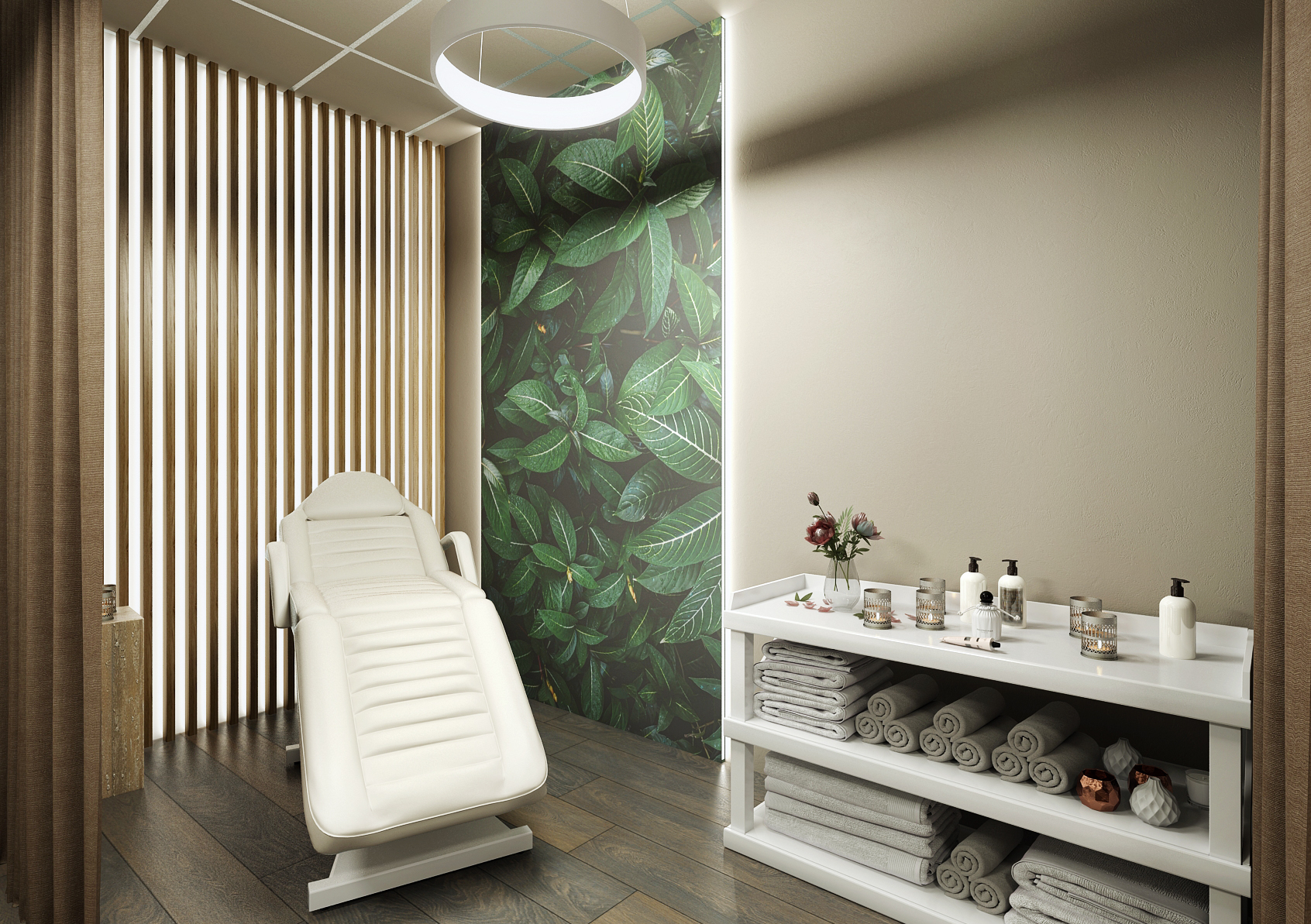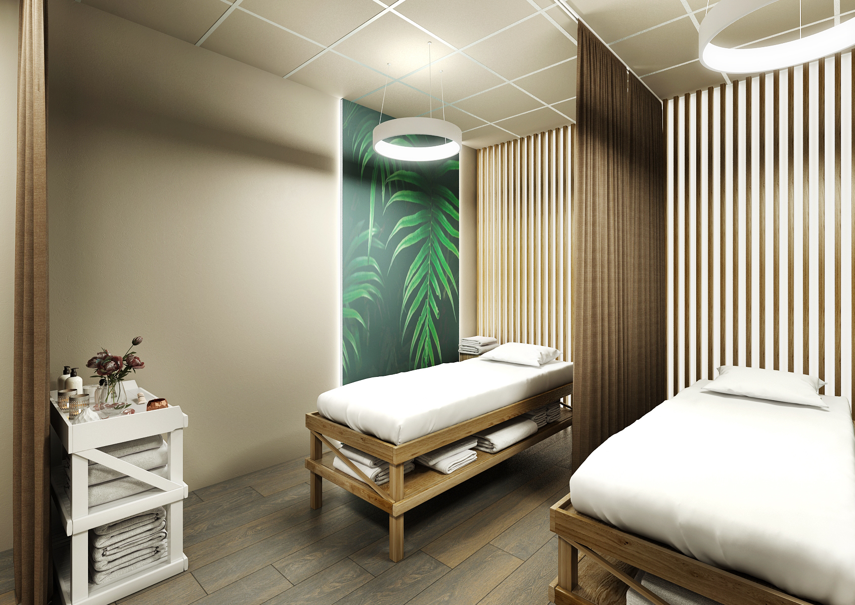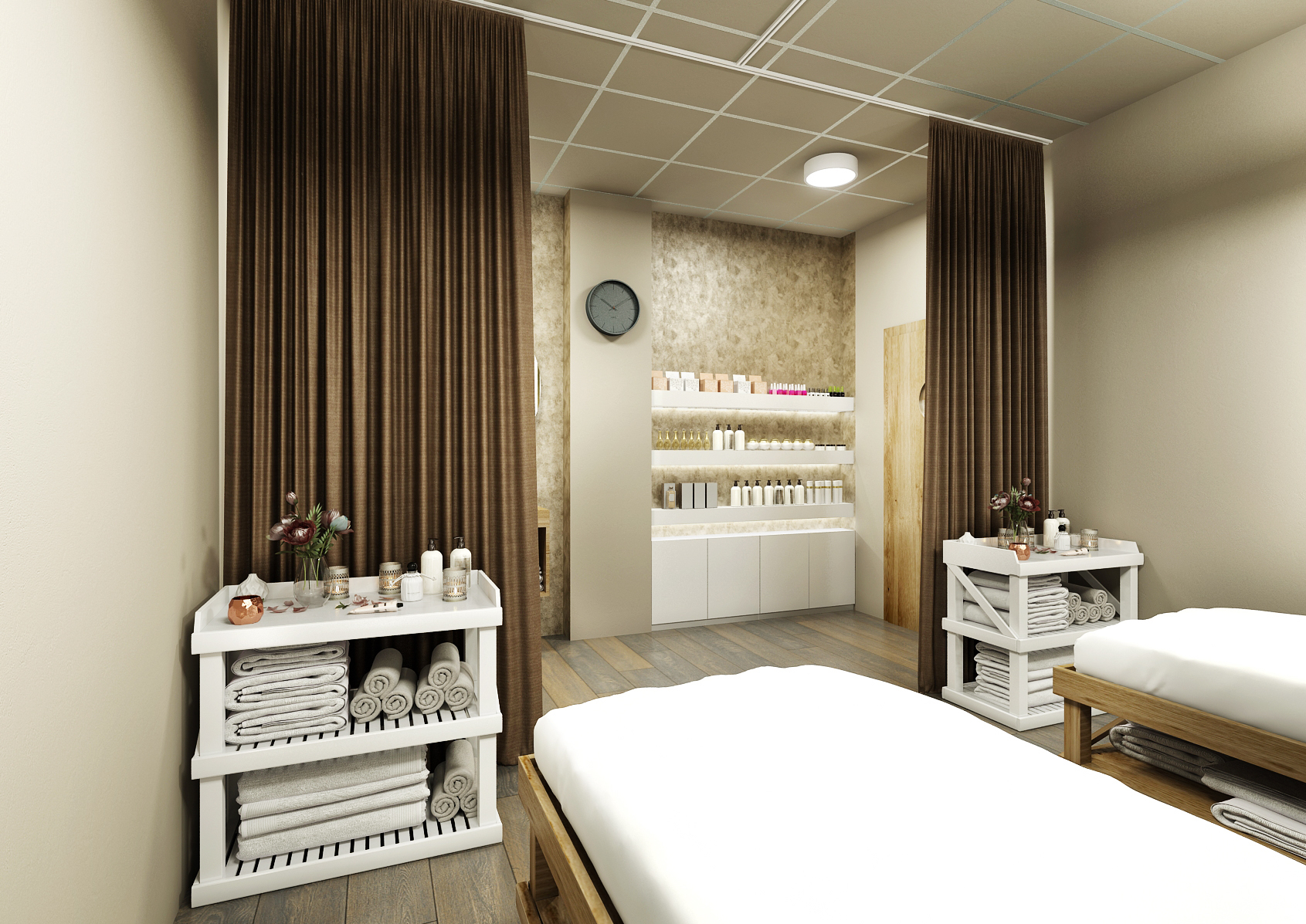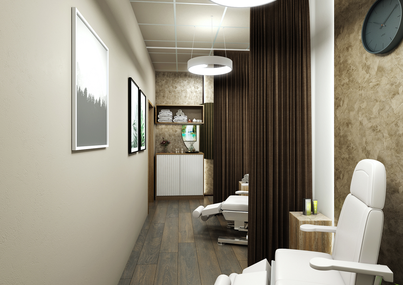 The other spaces are again equipped and harmonized in the same colors, which again include a concrete screed in brown and dark brown accessories matching the solid dark floor. Massage chairs and suspended ceiling lighting are in white.