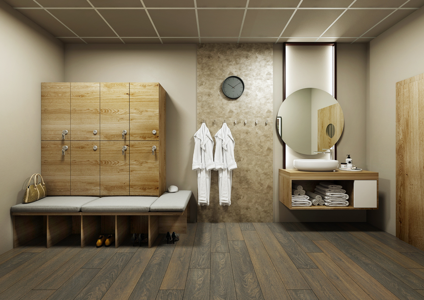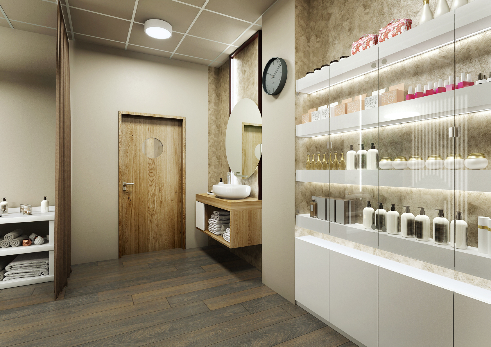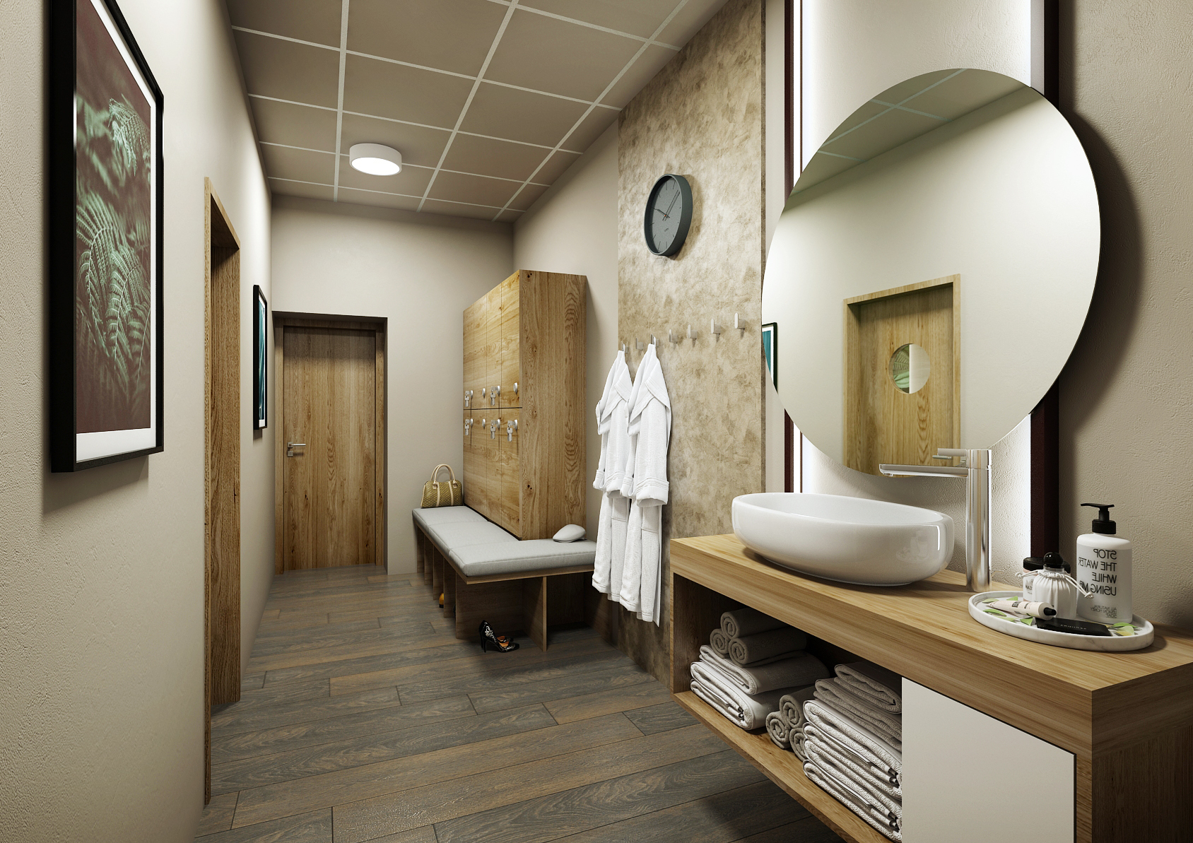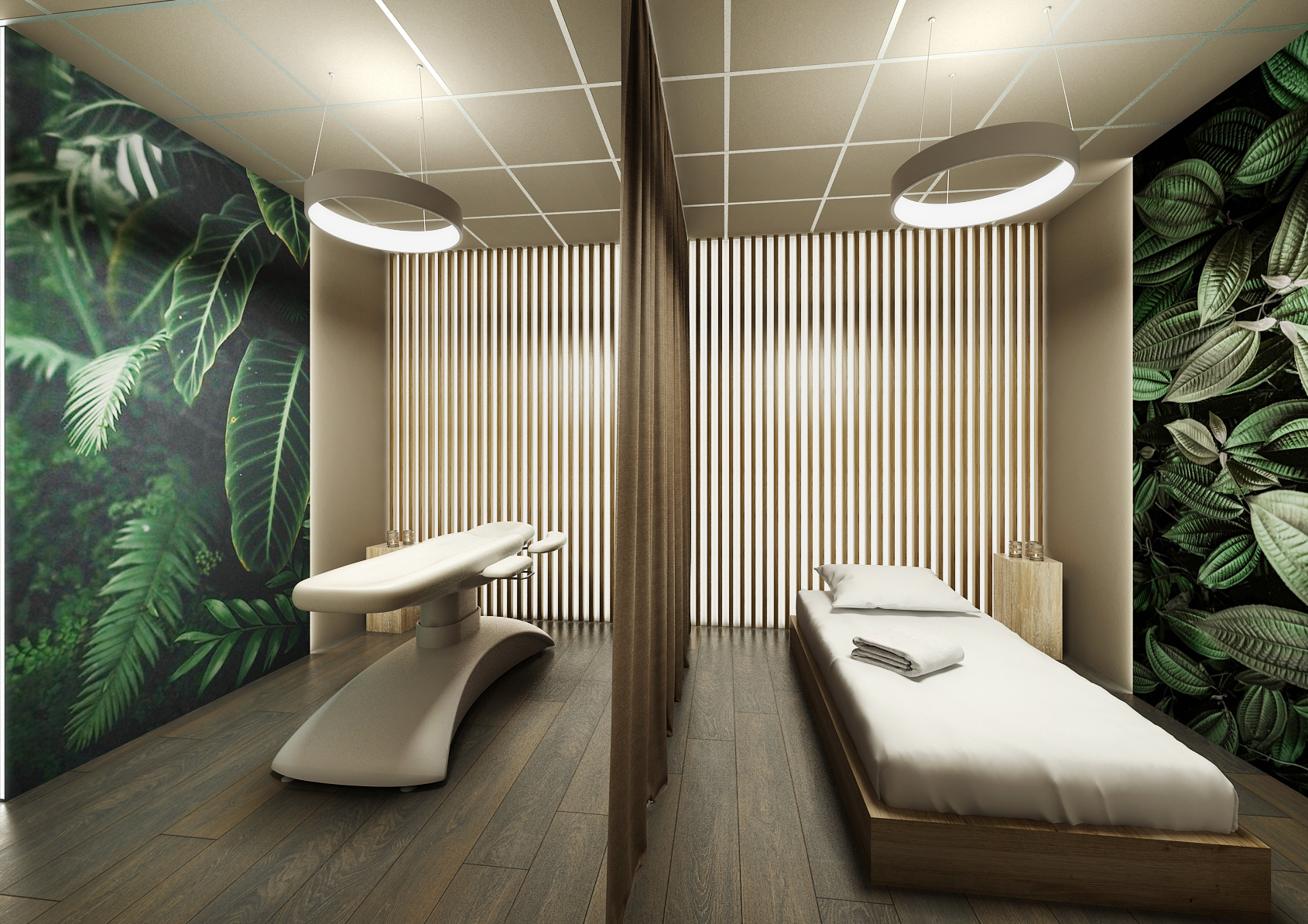 The other spaces are again equipped and harmonized in the same colors, which again include a concrete screed in brown and dark brown accessories matching the solid dark floor. Massage chairs and suspended ceiling lighting are in white.