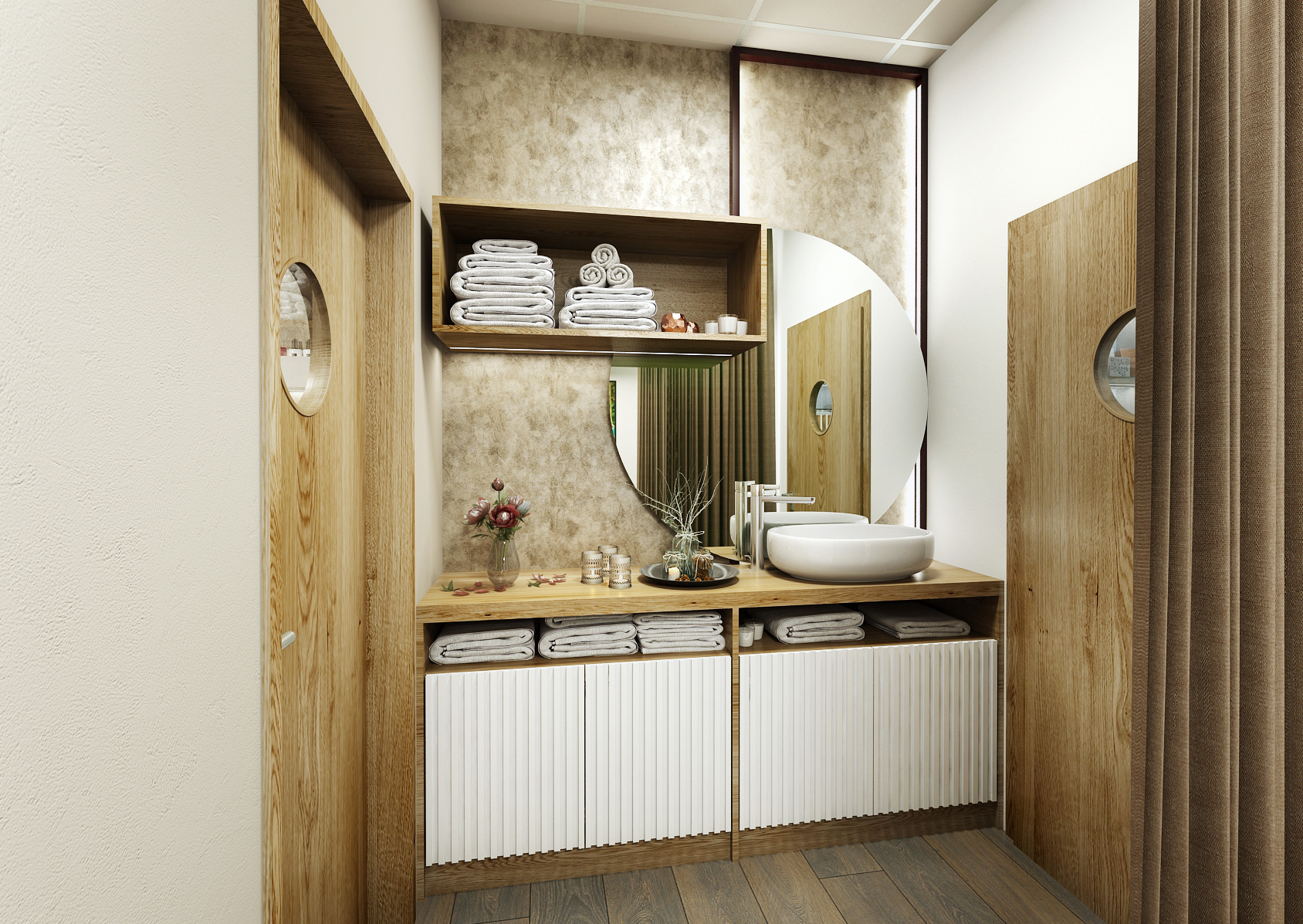In other sections, ambient lighting is used, which shines through the wall with a lamella panel, and instead of a decorative trowel, wallpaper with natural motifs and beige paintings are used.