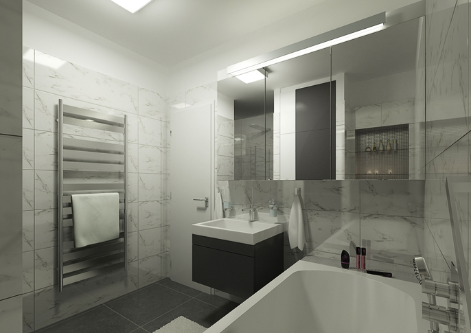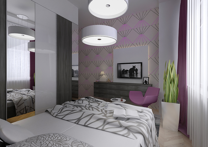 Hotel room is coordinated in light colors. You can find the combination of white a gray. The space is brighten up wth purple decorations and dark gray-brown furniture. Glasses doors of the wardrobe optically enlargen the room. An interesting element is a light pattern wallpaper, which looks elegant in combination with backlit wall behind a chest of drawers.The bahroom looks minimalist. White marble cladding brightens up the room and the large mirror widens it.