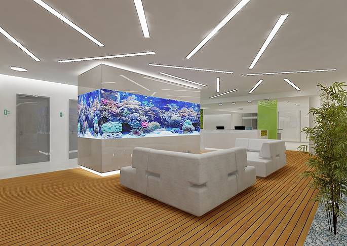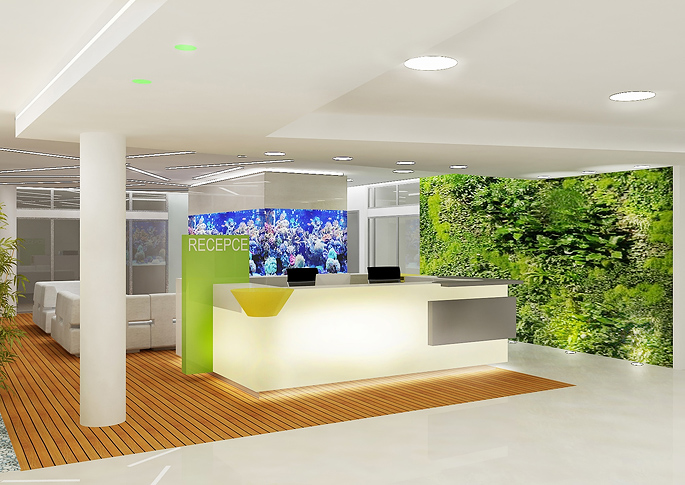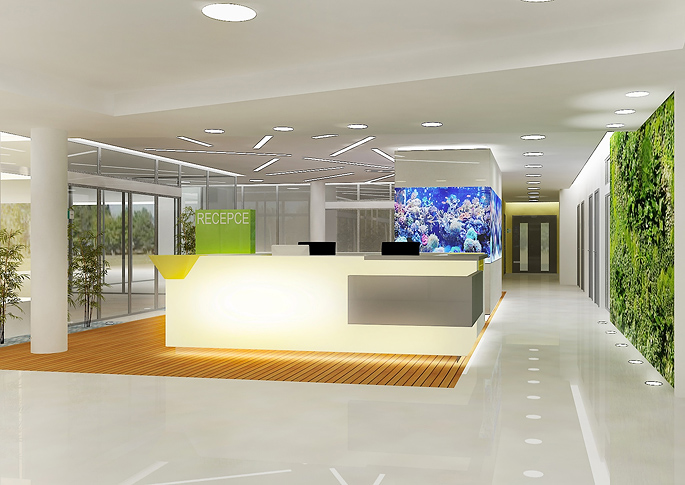 Design of the reception of BioVendor Laboratory medicine a.s.. The entrance areas, the lobby and the main foyer of the company is designed as an open space with a sea aquarium. The proposals for BioVendor also included the design of a dining room and dining areas for employees, a multimédia konference hall, classrooms, meeting rooms, corridors of administrative building and an office. The project was subsequently implemented by several companies and the design management of the project was provided by Ing. Milan Vrbík.