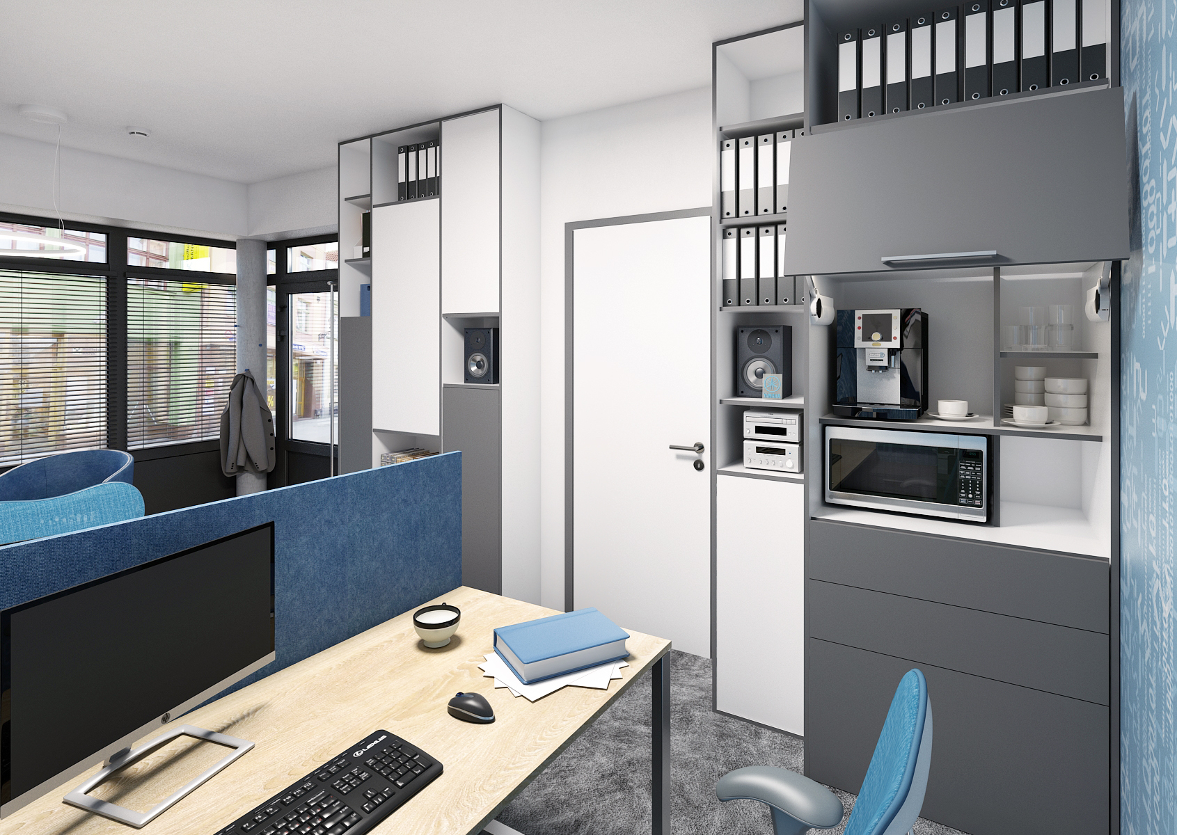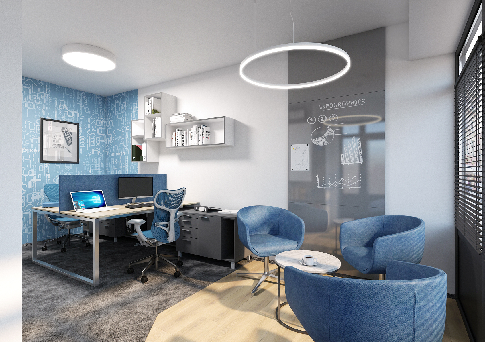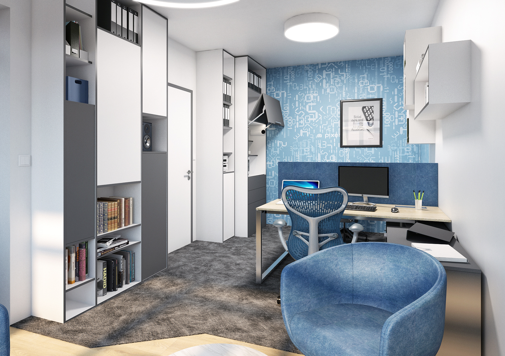 In an interior that is toned in blue, whether it is patterned wallpaper or furniture elements. Blue is combined with gray and white. It is an ergonomic office workplace where the space in a smaller office is fully utilized. Ergonomic wheelchairs are seated at a table that does not lack a separator. The separator provides privacy and prevents interfering elements from spreading between the two workspaces.