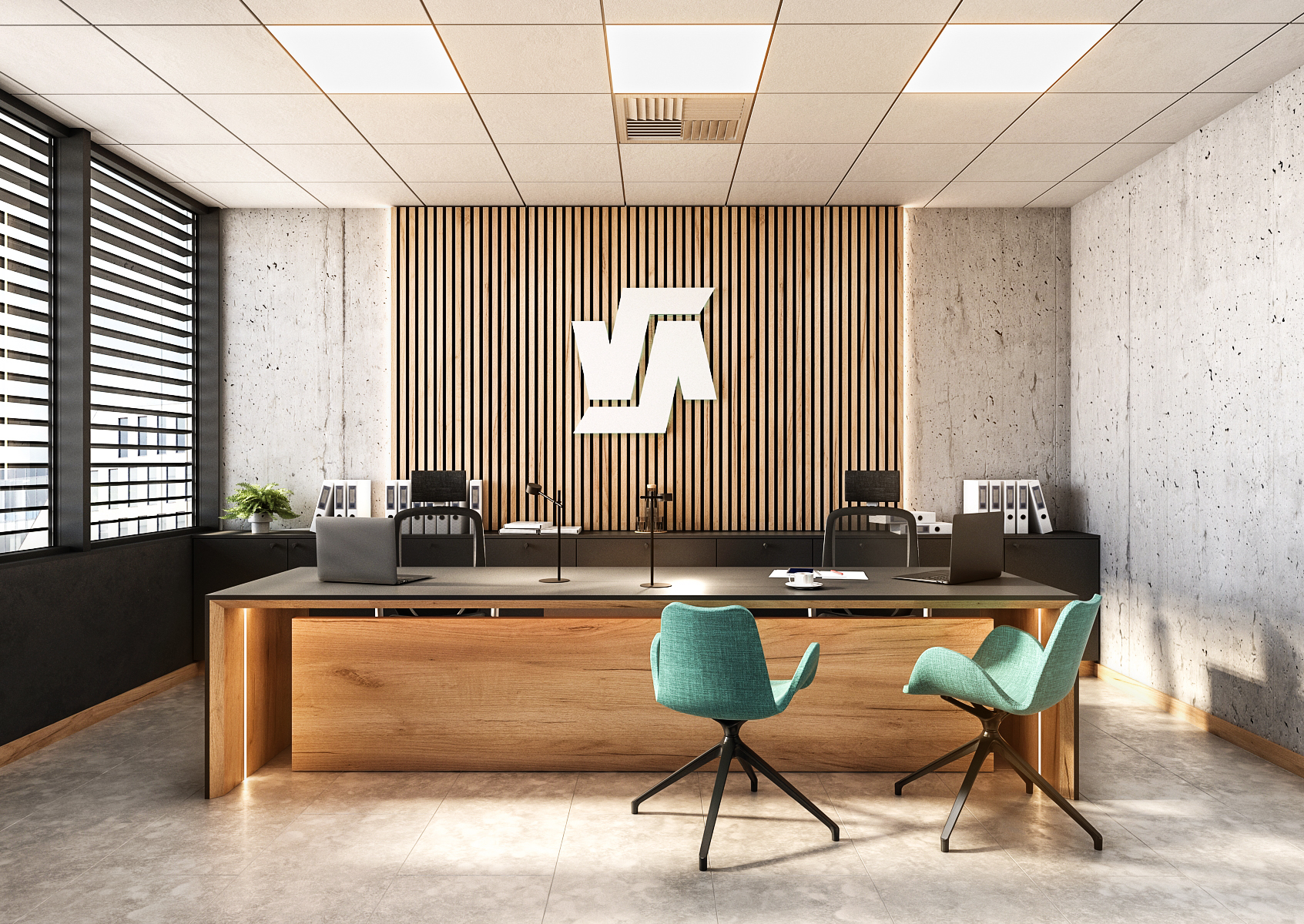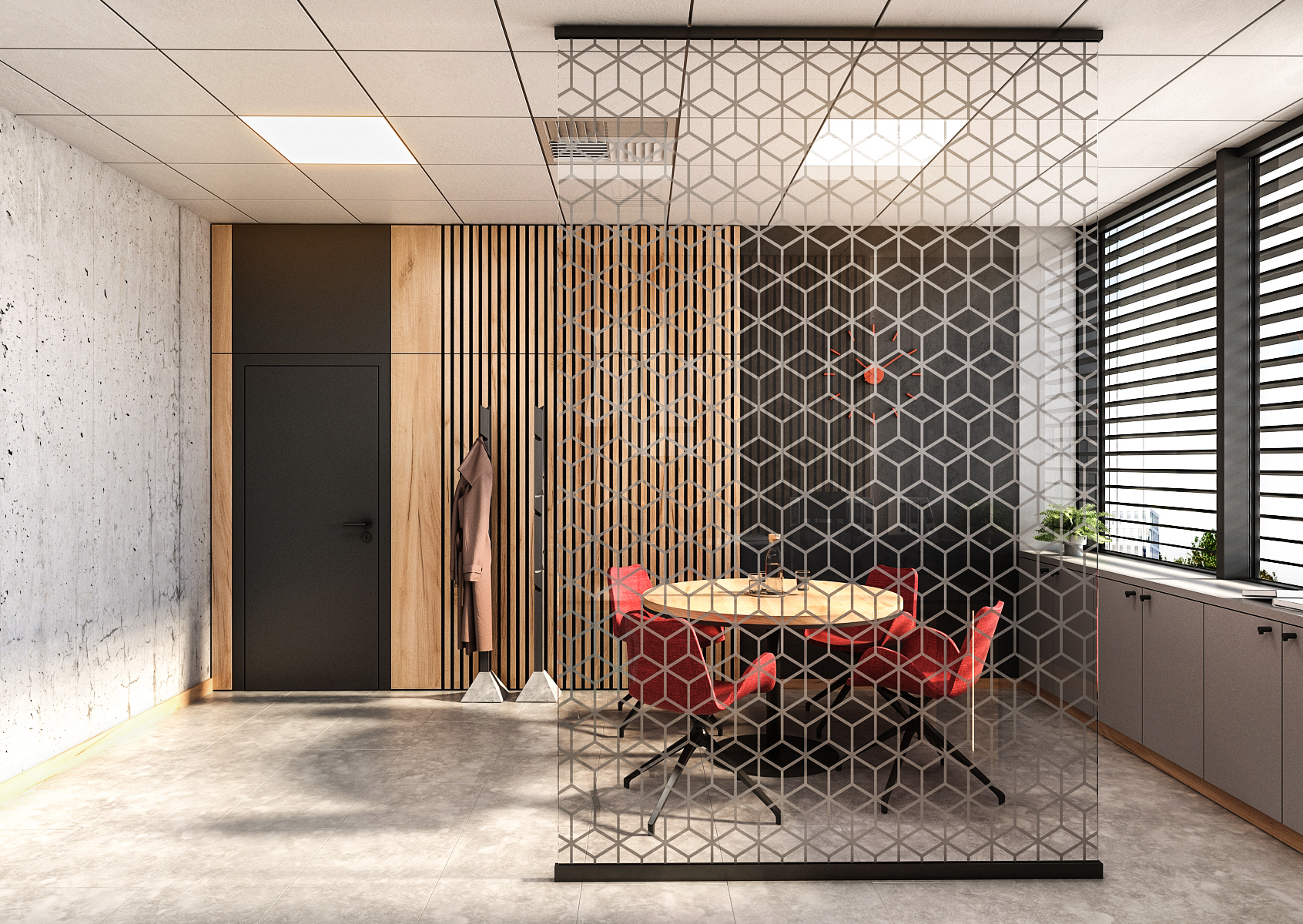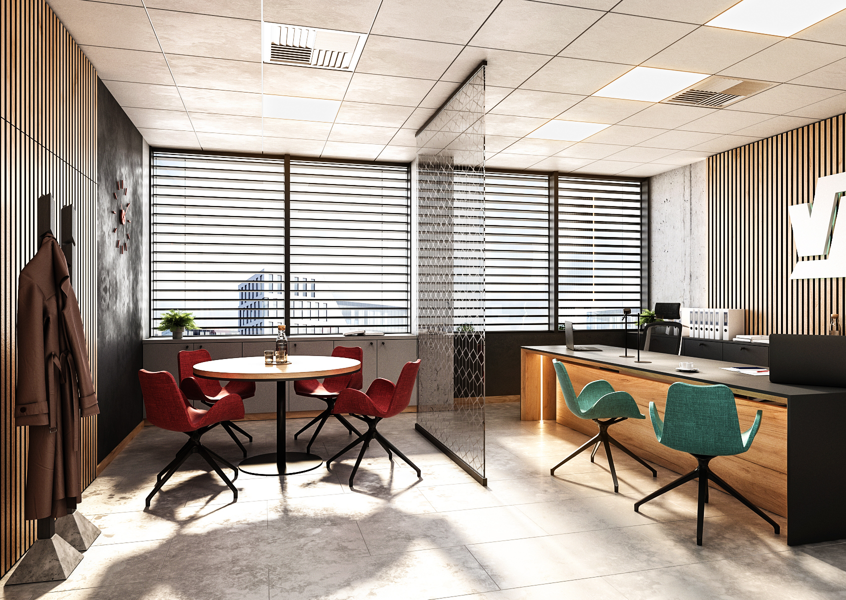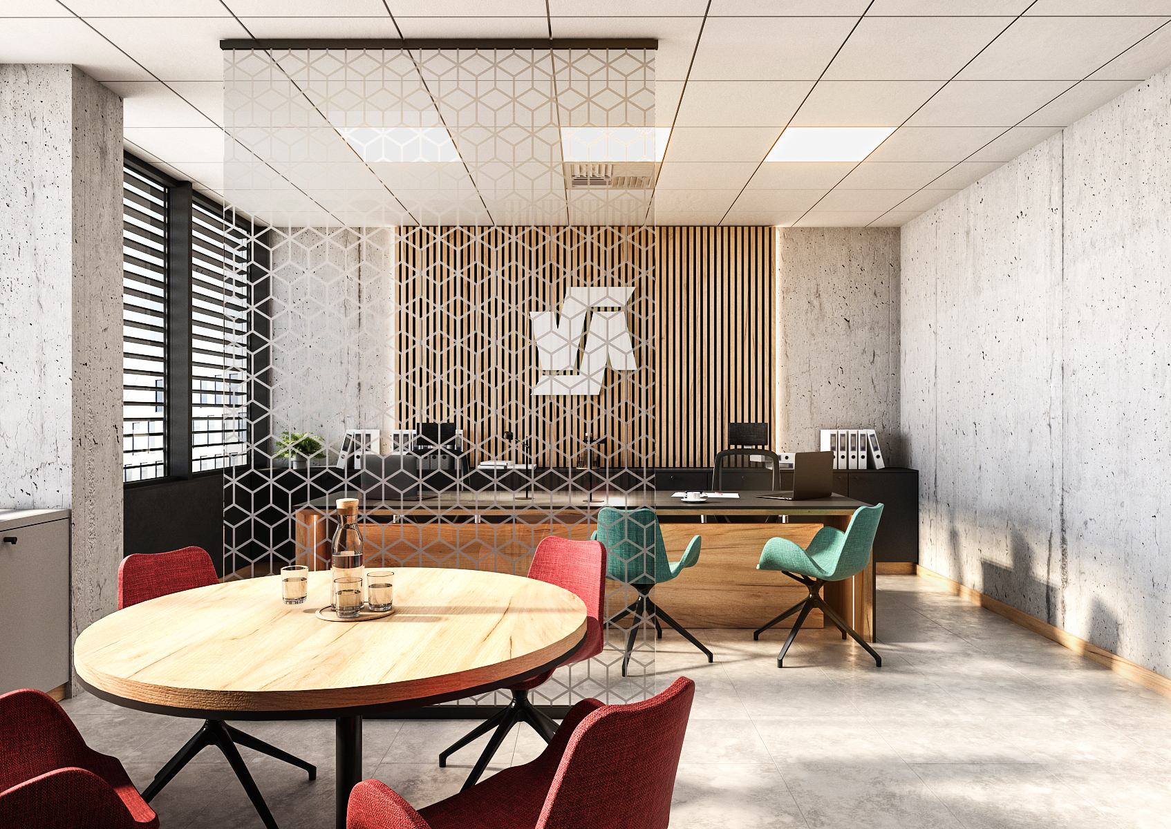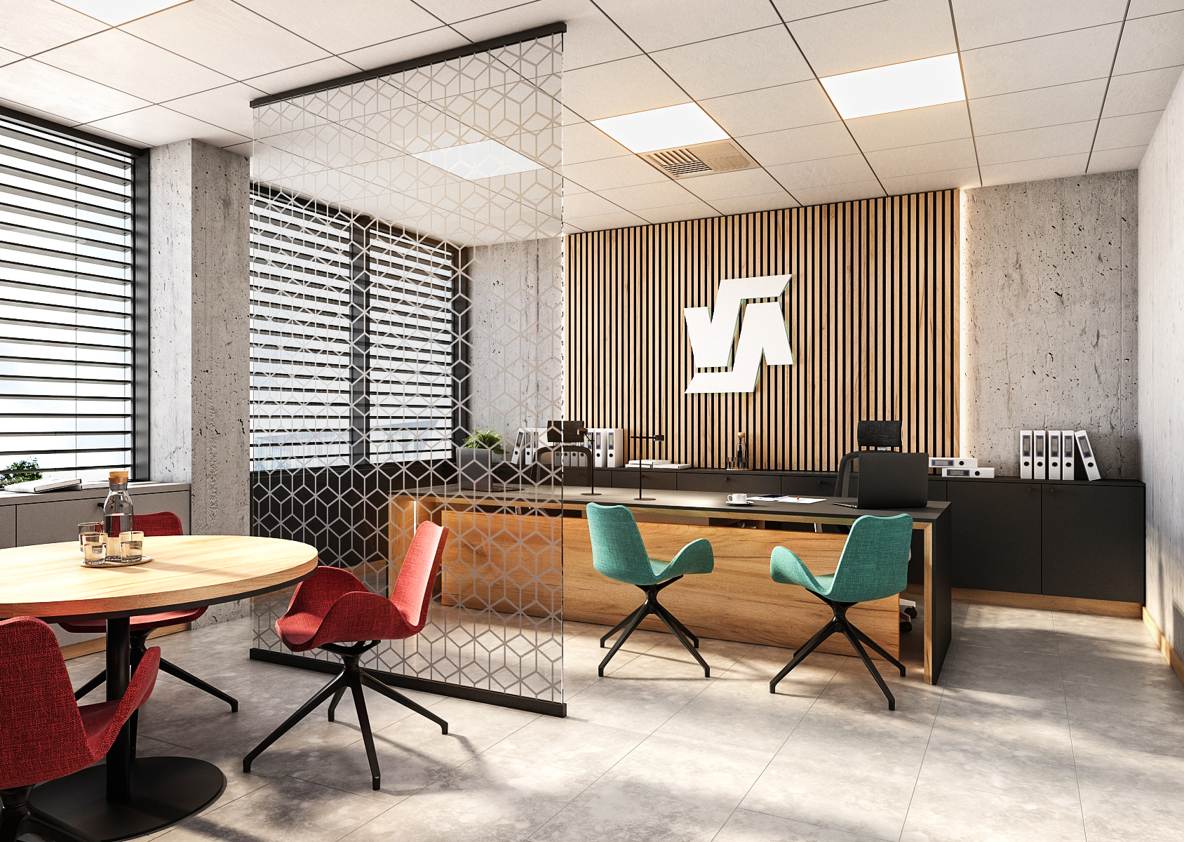 The headquarters with seating is a spacious room with concrete walls and large-format paving, divided into two parts. The first part at the entrance consists of a round table with armchairs in red, which is separated from the second part of the room by a glass divider with patterns. The armchairs at the work table are turquoise for a change. Both colors represent the Staves company.