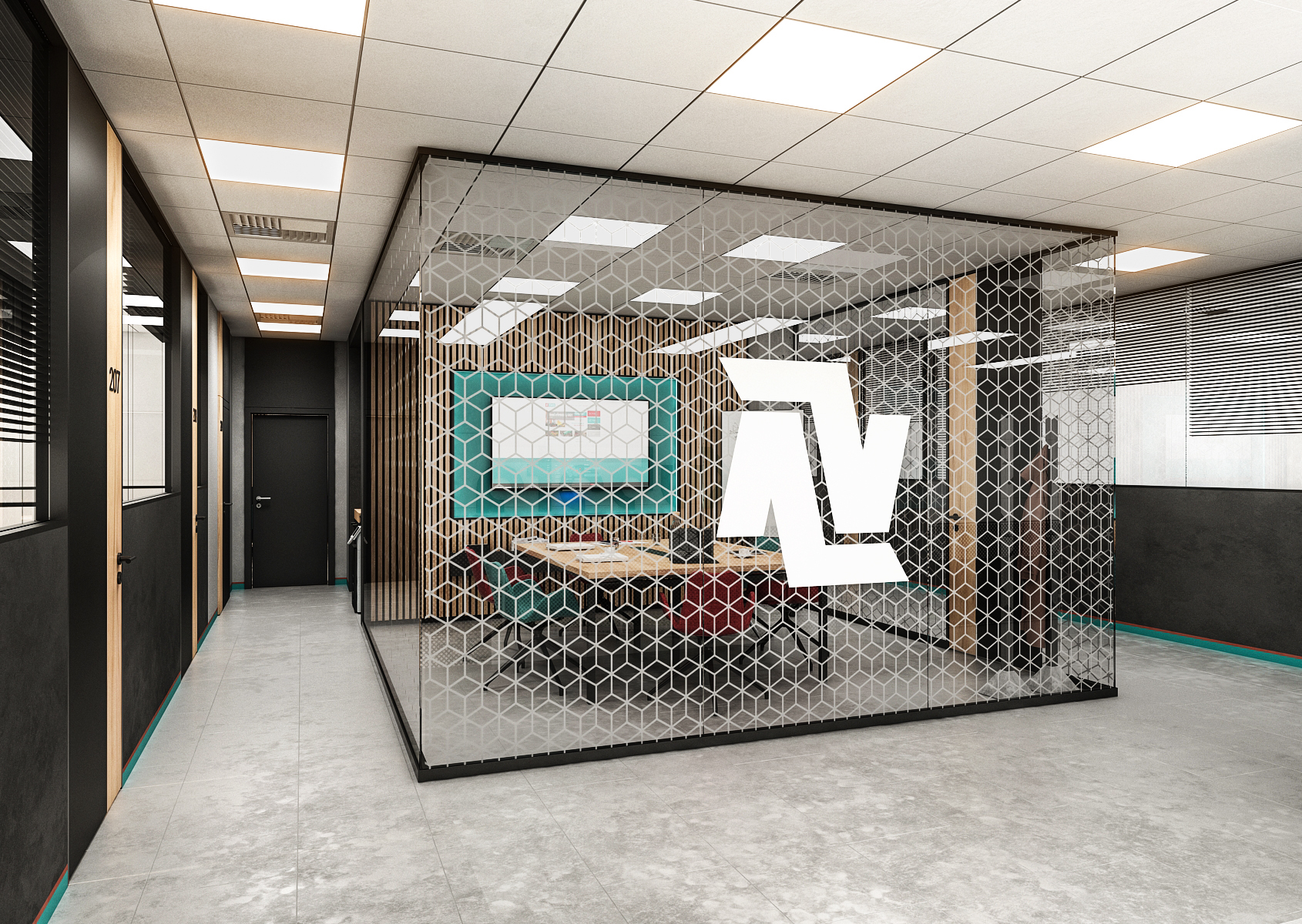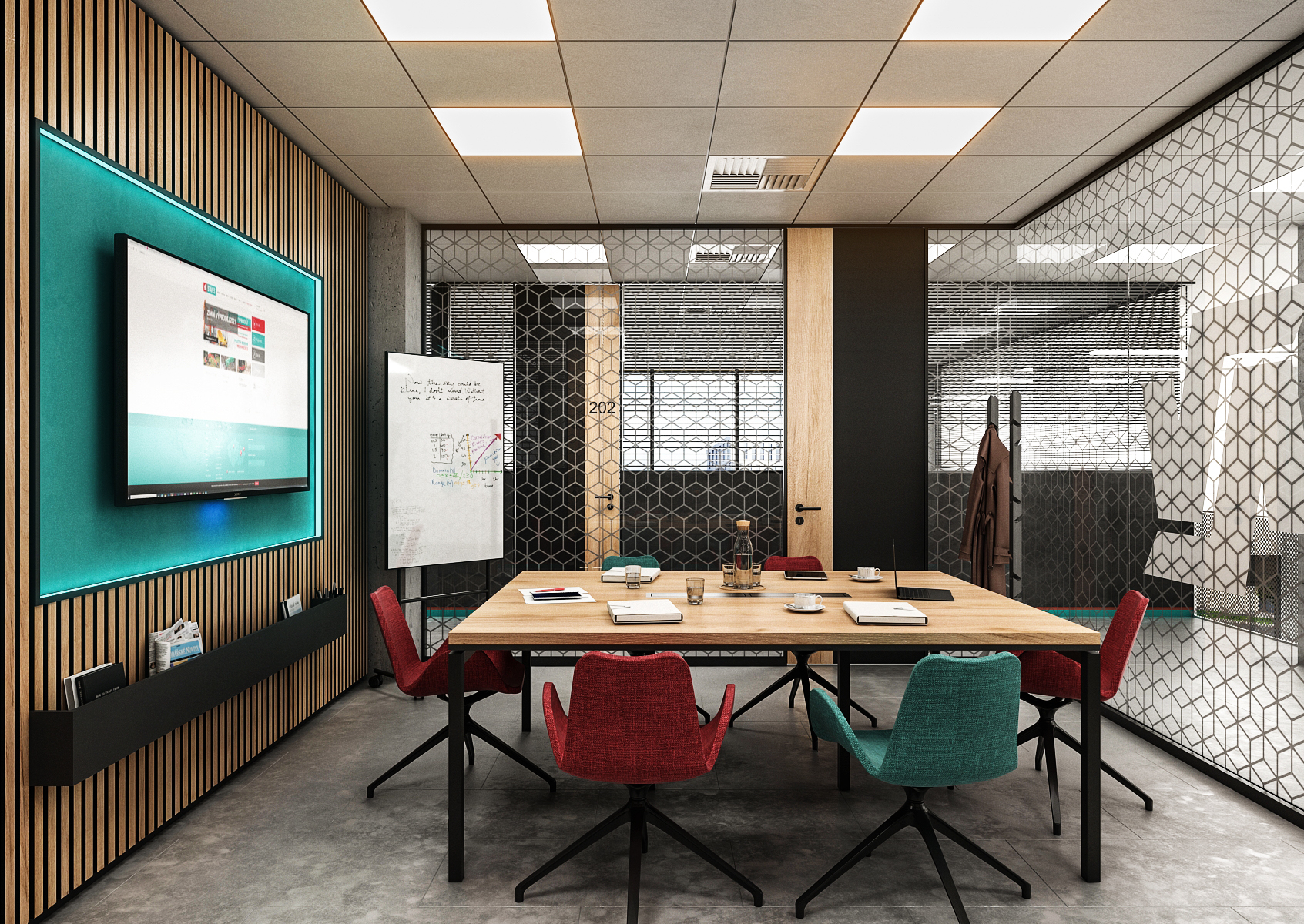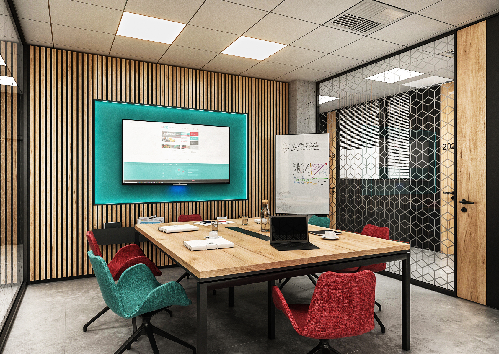 The meeting room uses acoustic lamella tiles and patterned glass dividers with a logo on them. The armchairs at the meeting table are again in the colors of the company, as is the background behind the television.