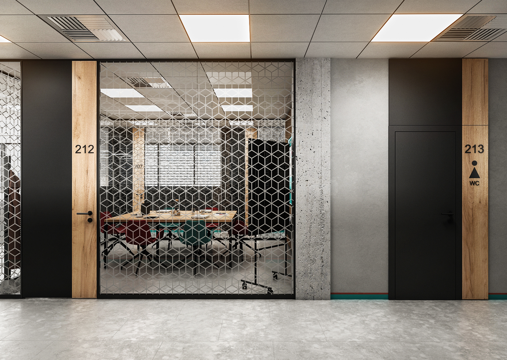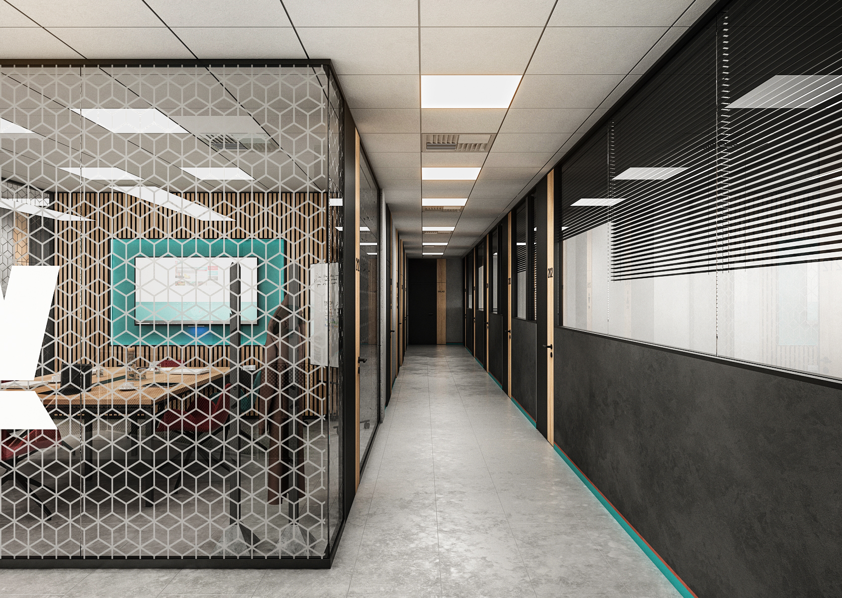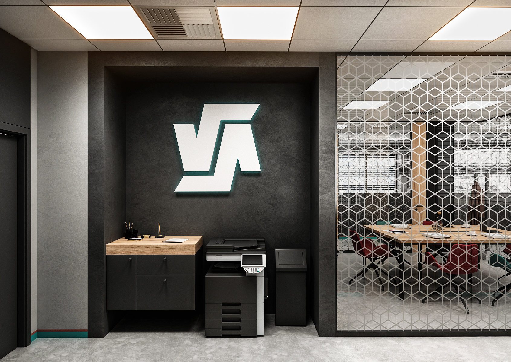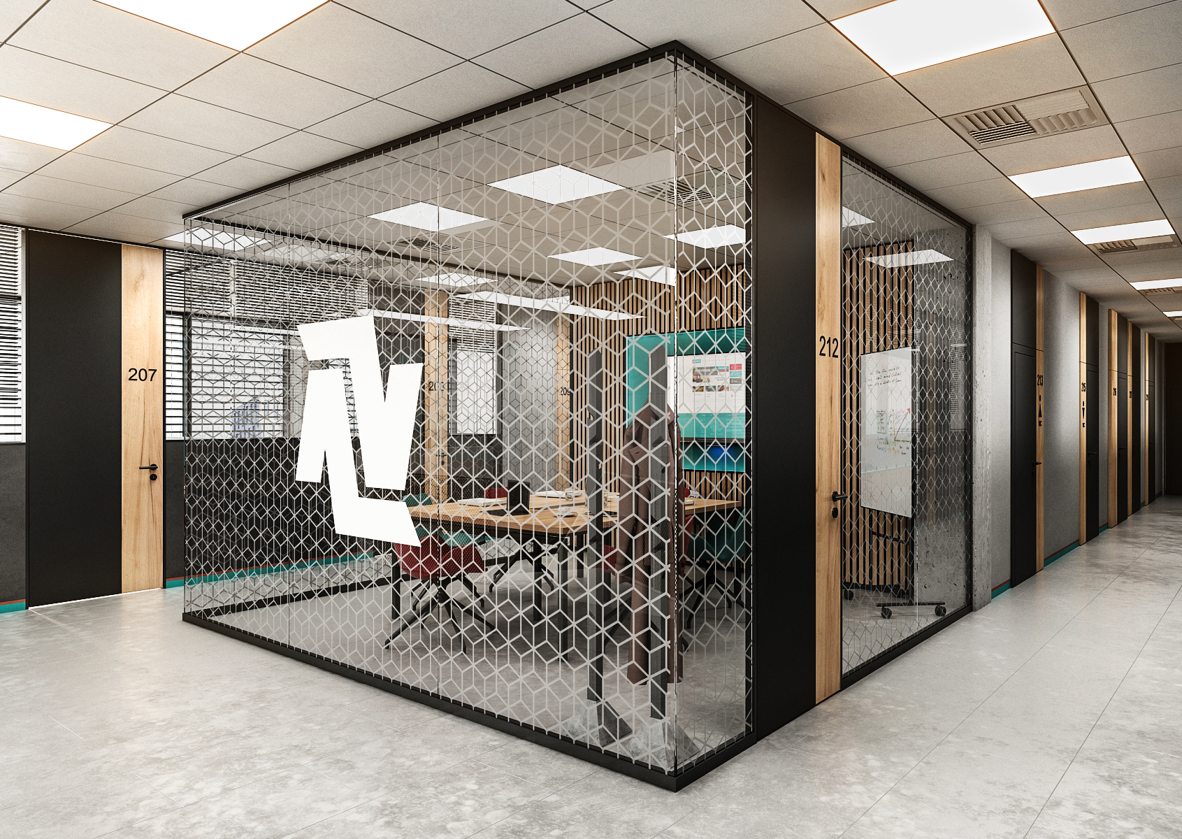 The meeting room uses acoustic lamella tiles and patterned glass dividers with a logo on them. The armchairs at the meeting table are again in the colors of the company, as is the background behind the television.