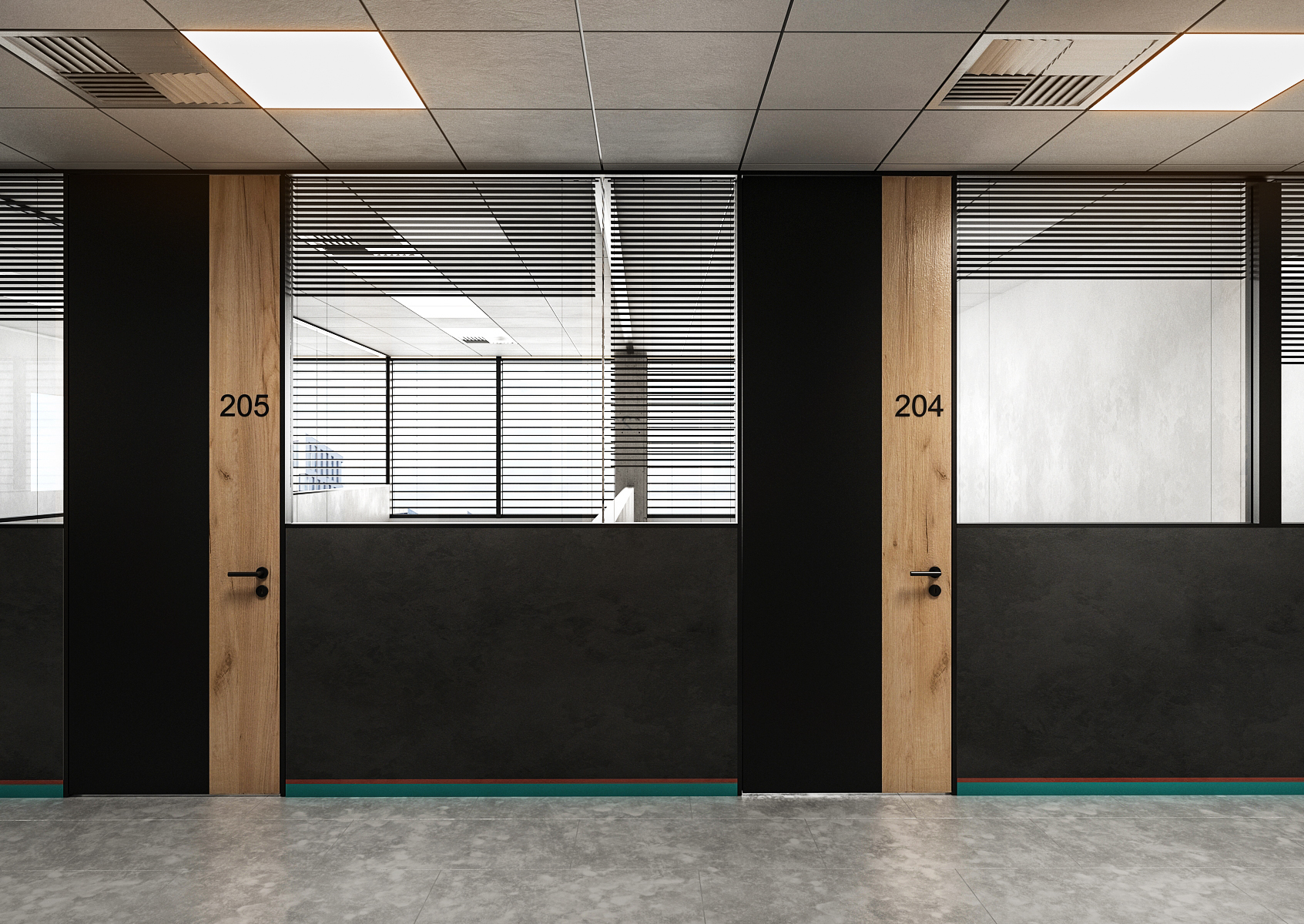 Corridors are decorated in matte black in combination with natural oak, concrete and large-format paving. A door with room numbers stretches from the floor to the ceiling, and in addition to the logo, a niche with a black squeegee houses a desk with stationery and a printer.