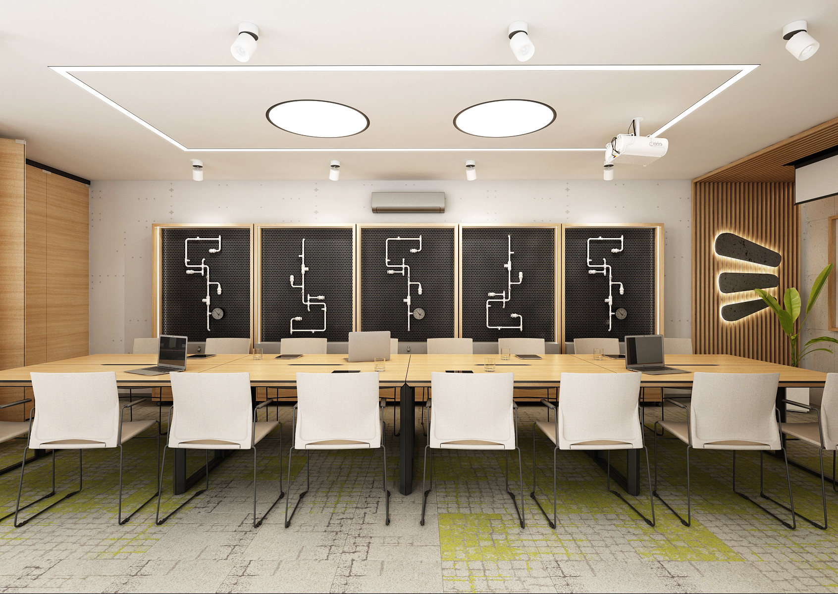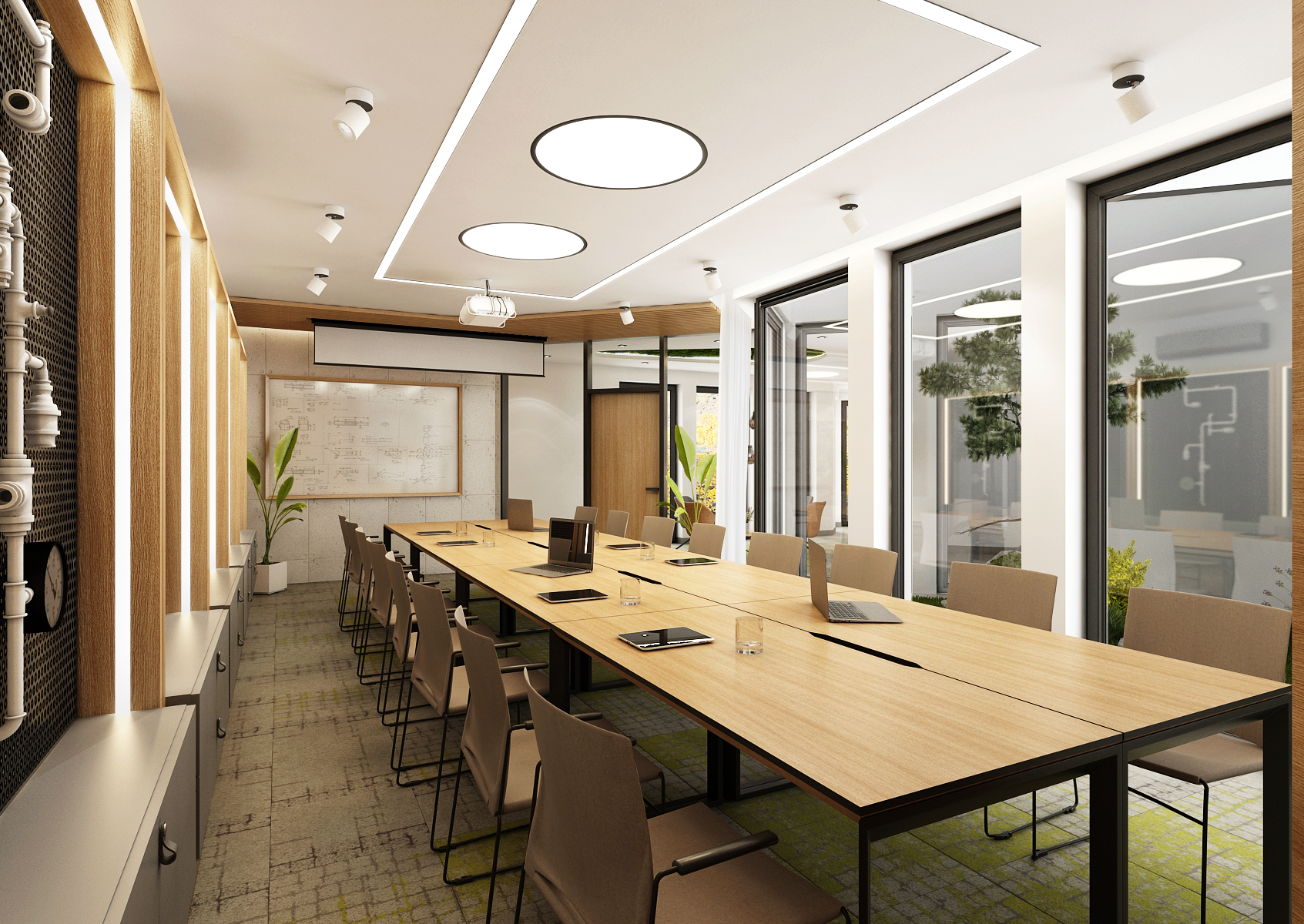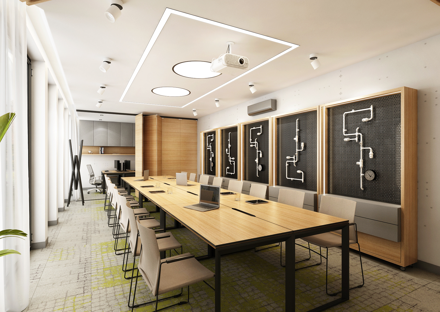 The spacious training room is equipped with a large table with many chairs located in the center of the room. Behind the sliding doors in oak decor is a separate office with two workstations. An interesting feature is the racks on wheels with exposed piping on perforated panels.