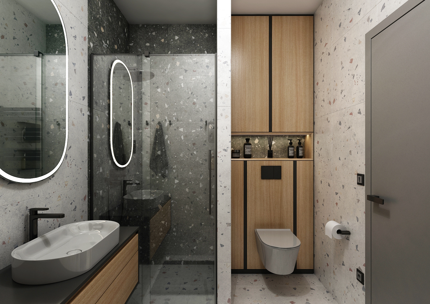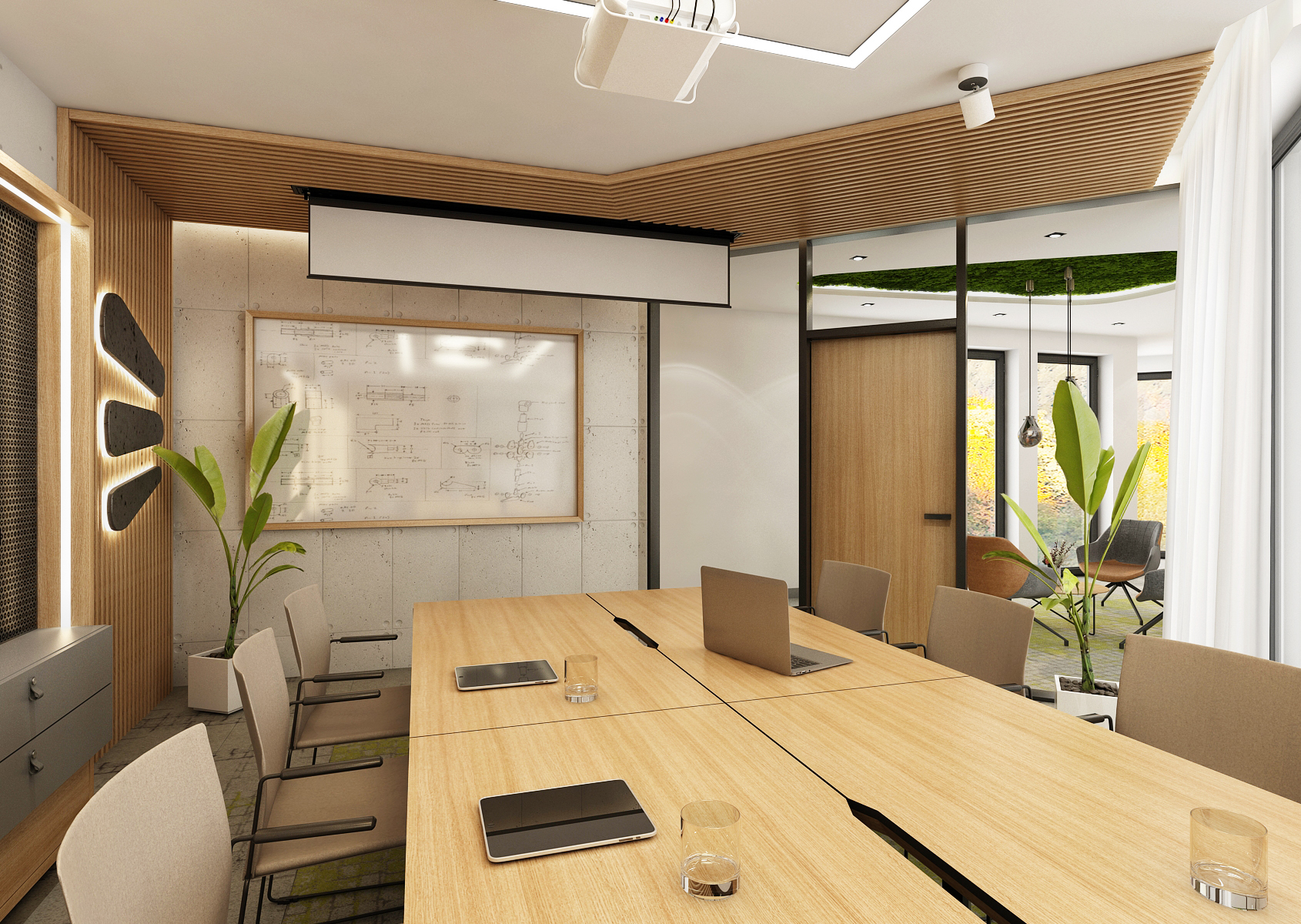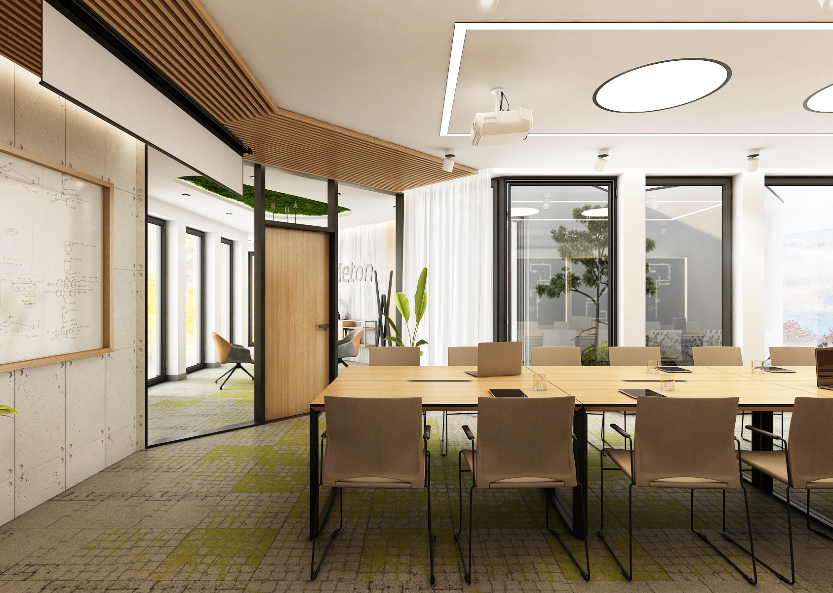 The spacious training room is equipped with a large table with many chairs located in the center of the room. Behind the sliding doors in oak decor is a separate office with two workstations. An interesting feature is the racks on wheels with exposed piping on perforated panels.