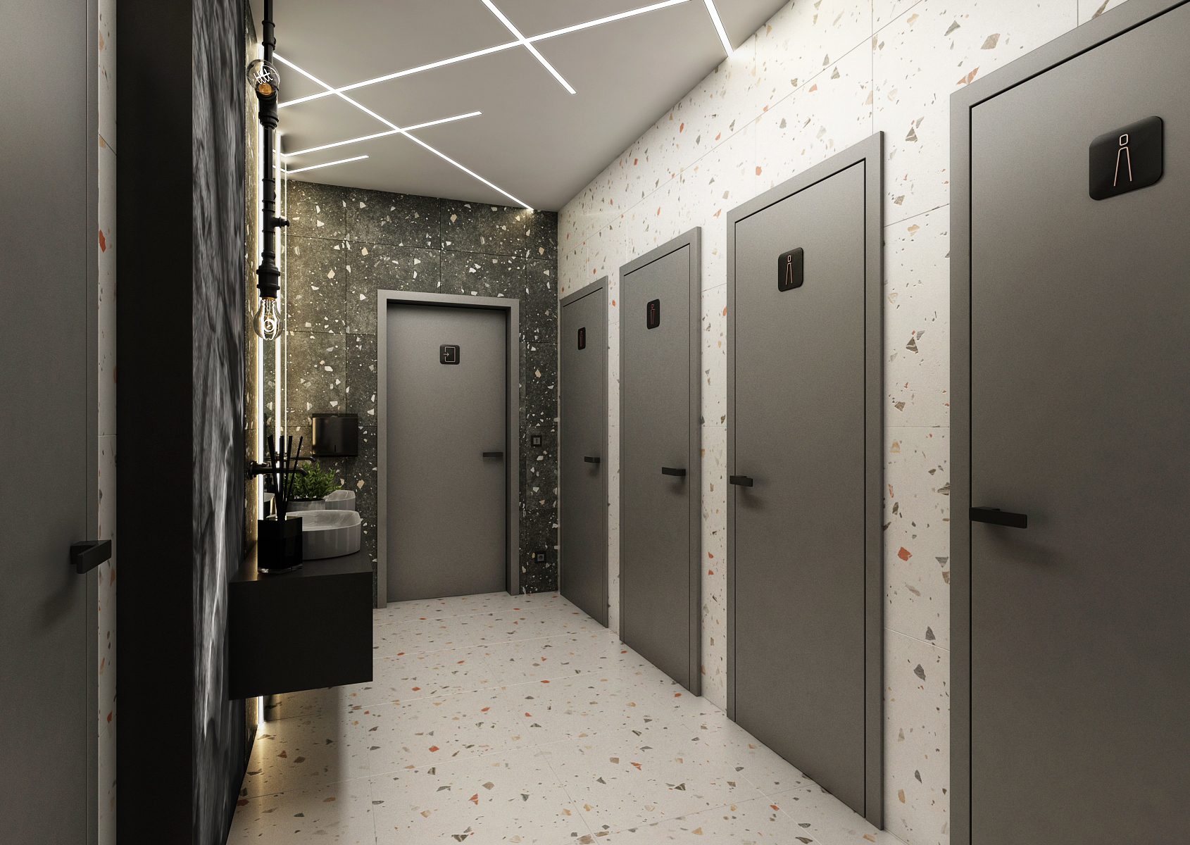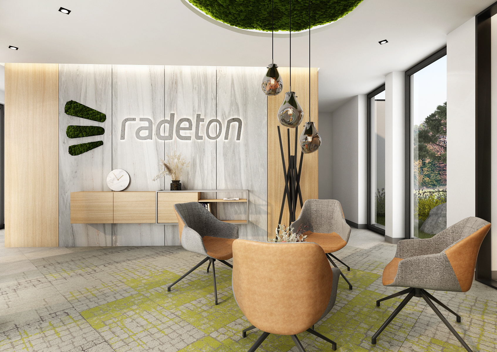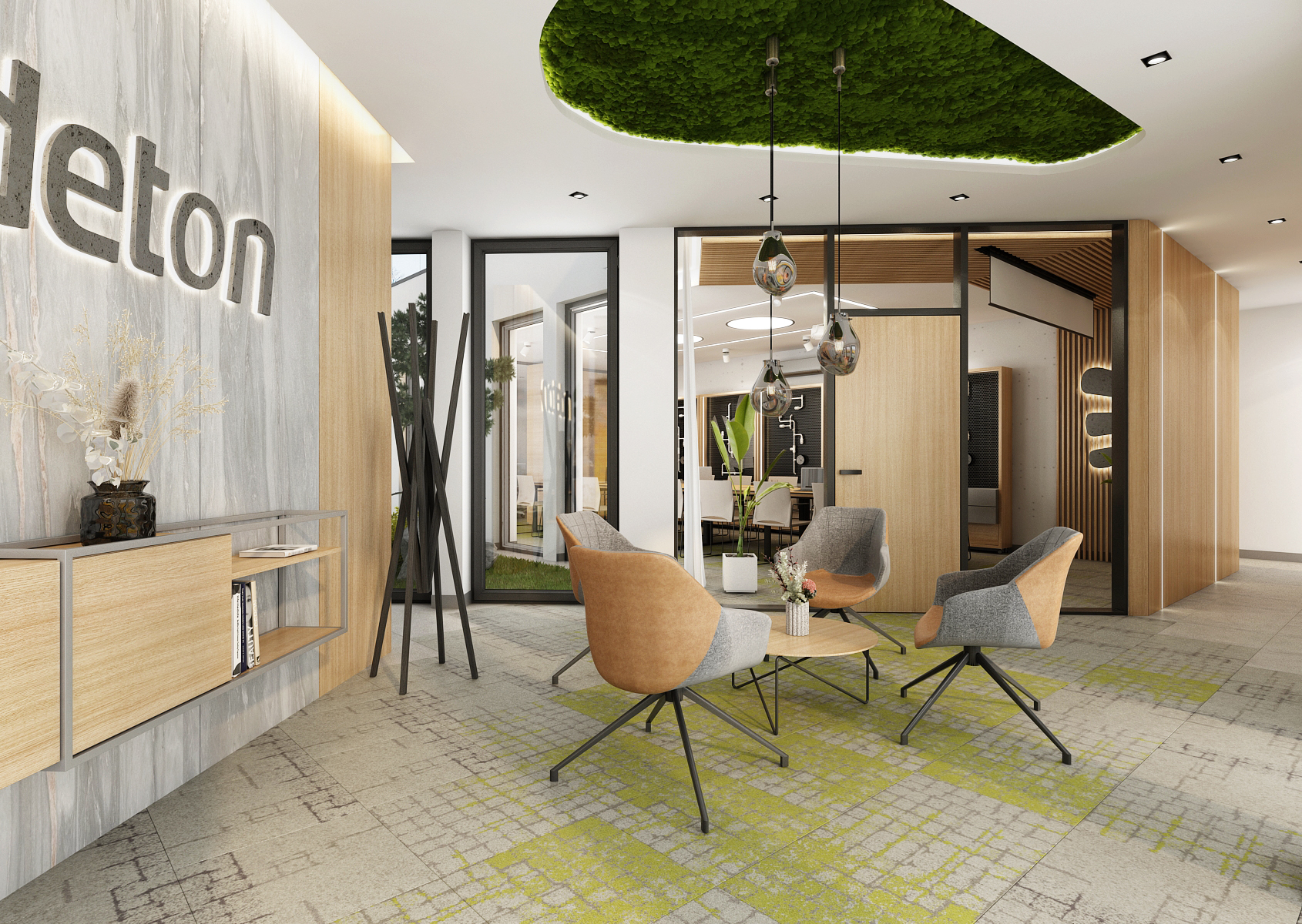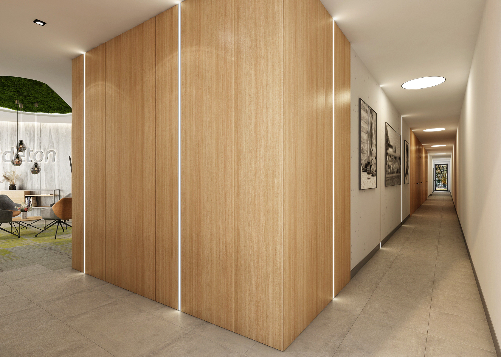 The corridor with a seating area is equipped with comfortable armchairs around a round table above which there is a moss painting in the suspended ceiling. At the same time, hand-blown lights are hung in it. The stone paneled wall is complemented by an illuminated company logo and moss paintings to complement it.