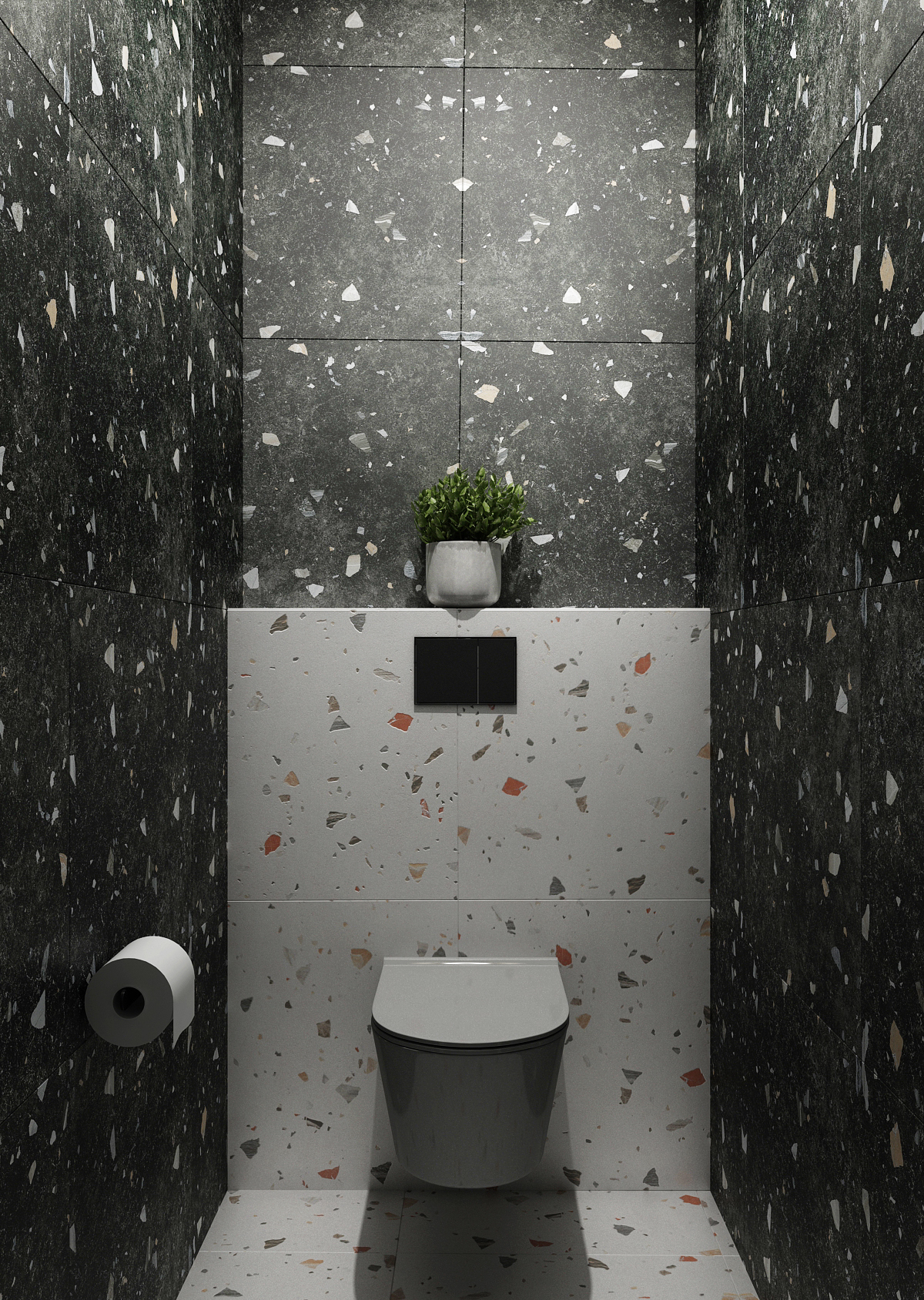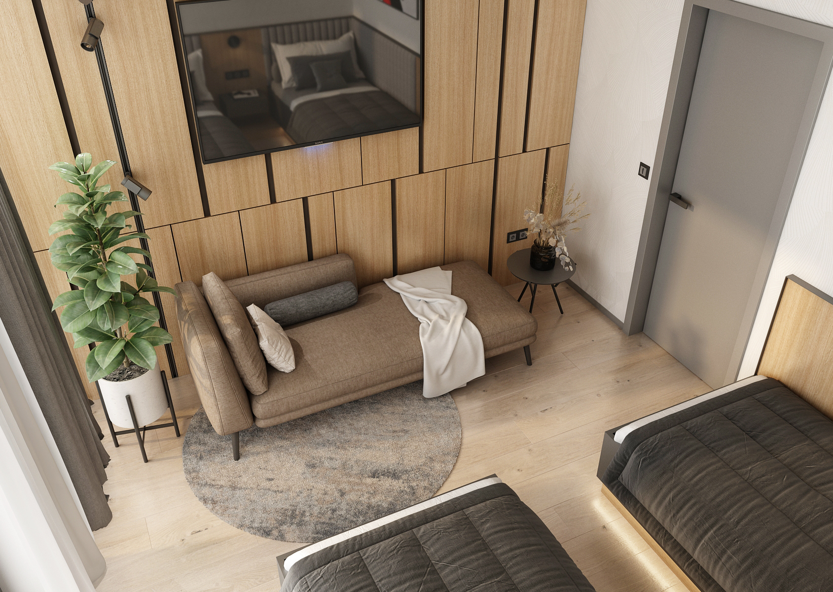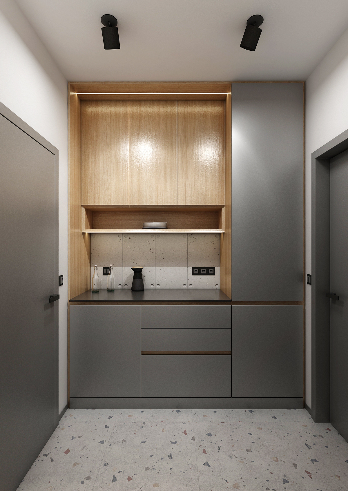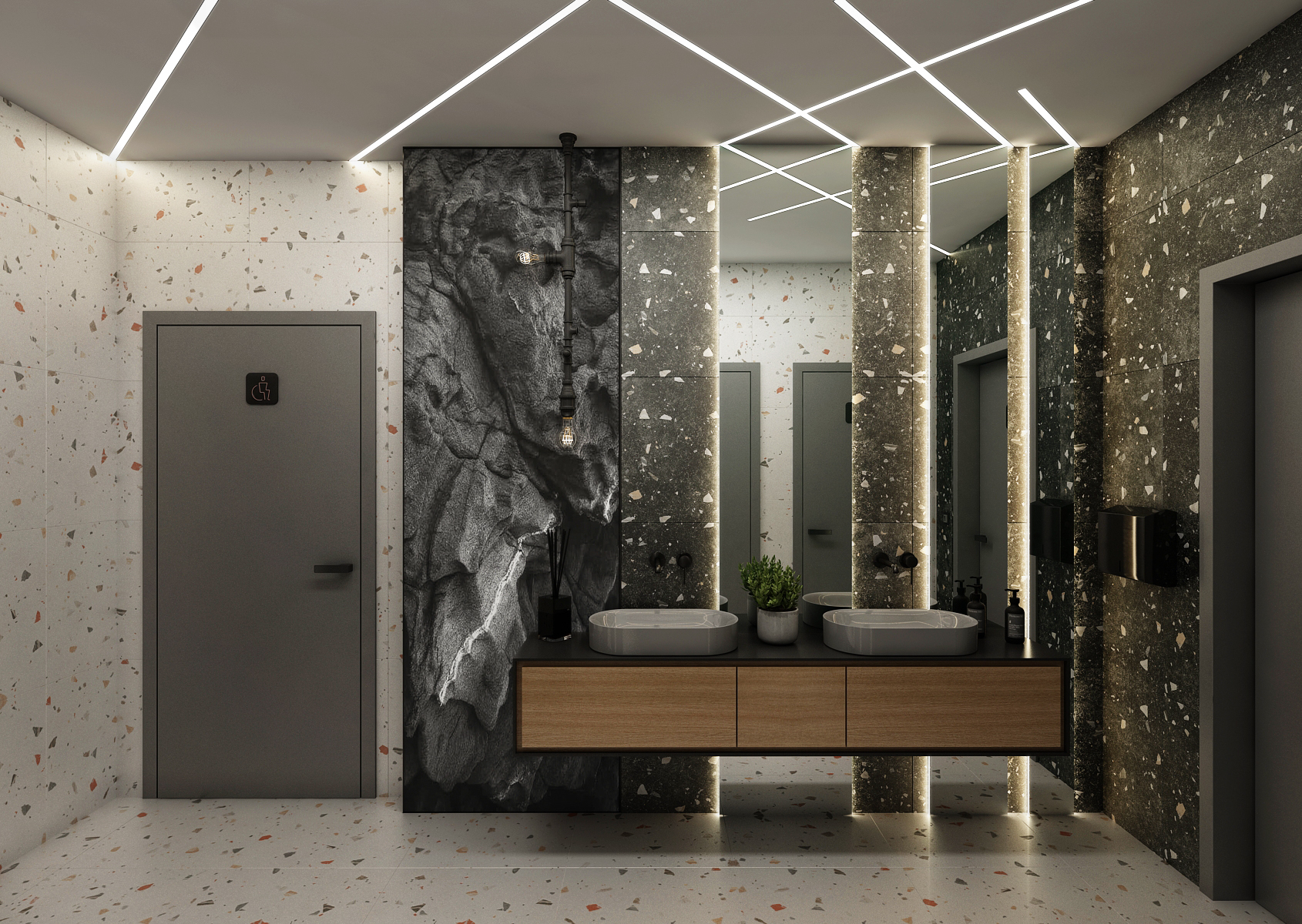 The corridor with a seating area is equipped with comfortable armchairs around a round table above which there is a moss painting in the suspended ceiling. At the same time, hand-blown lights are hung in it. The stone paneled wall is complemented by an illuminated company logo and moss paintings to complement it.
