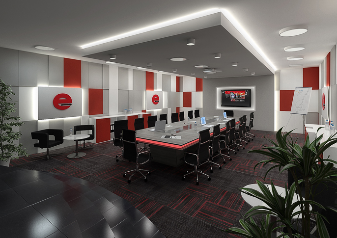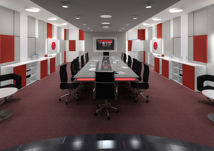 The color scheme of the design corresponds to the colors of the company dealing with the distribution of slot machines. The square raster is like flashing pixels on the screens of the devices, the backlight of the meeting table as light decorations placed on them.