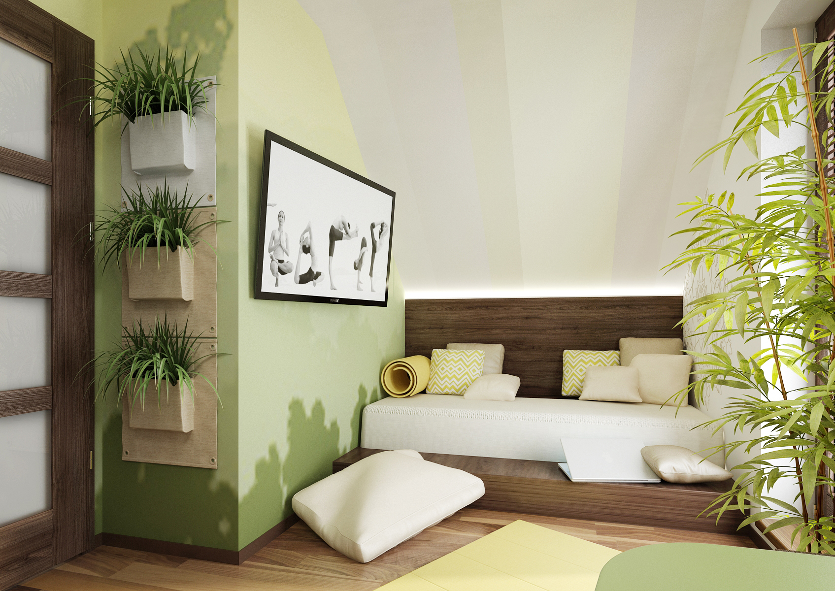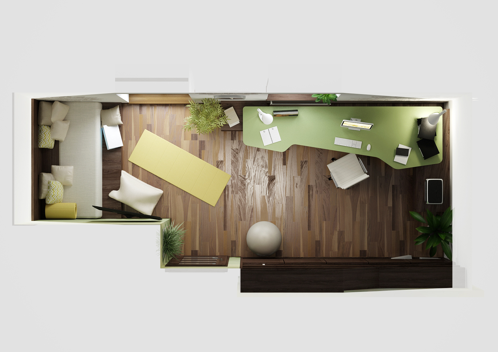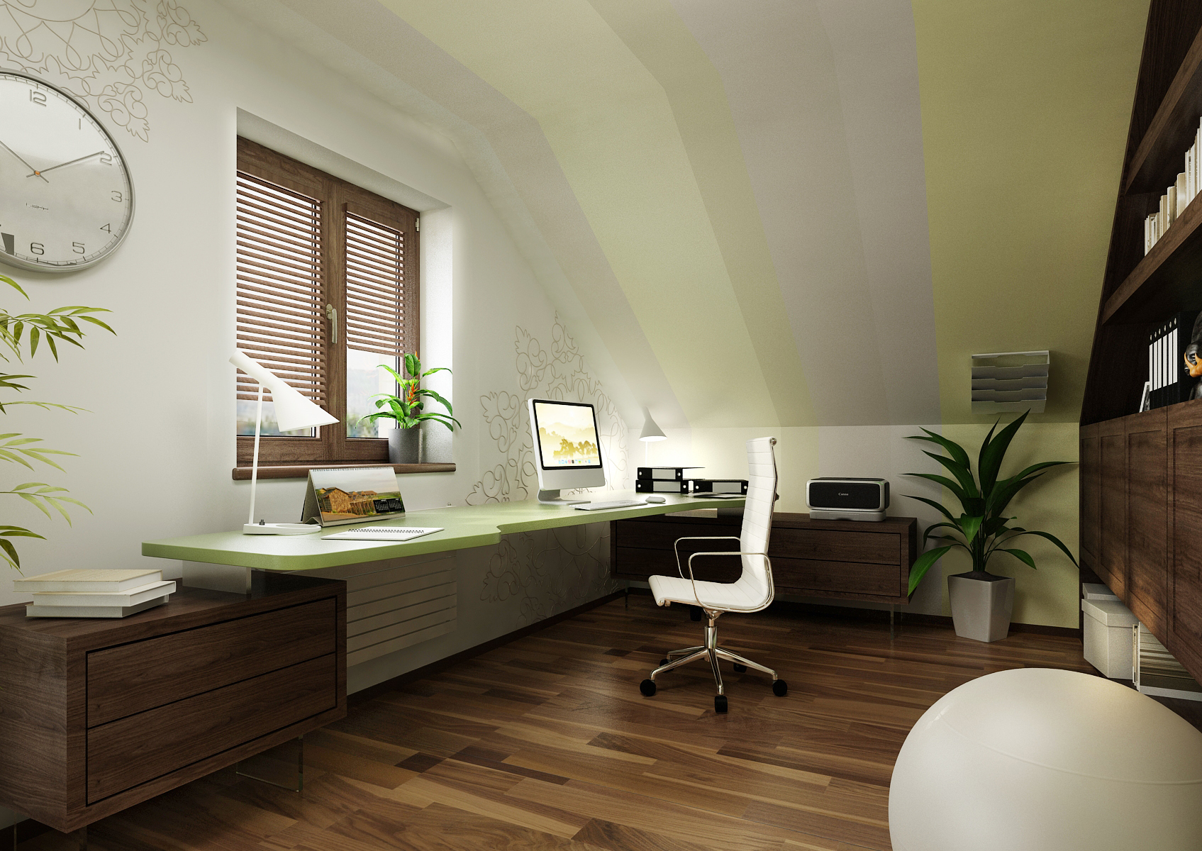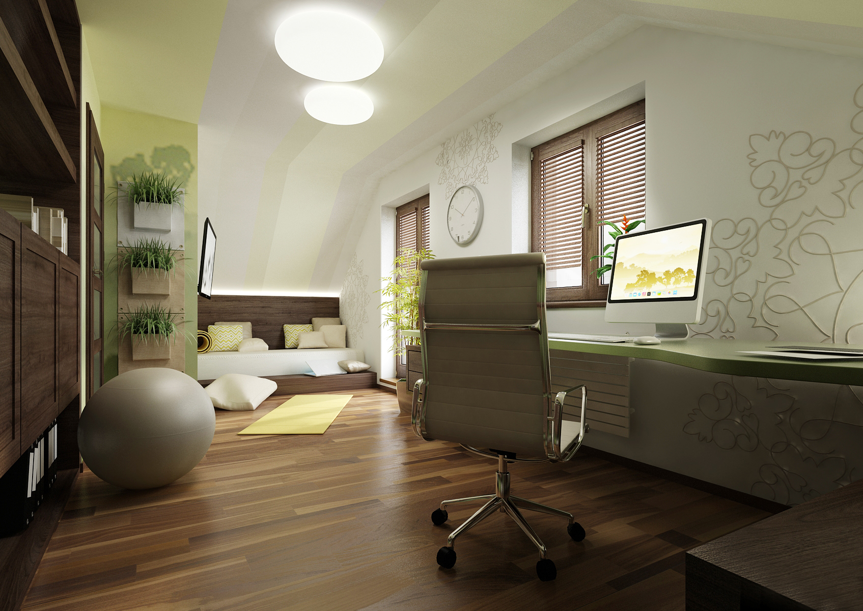 A study in the attic of a family house, toned in soothing shades of green. The furniture is dominated by a dark shade of oak wood. The table is supported by cabinets on glass legs, which thus have a lightweight effect. For relaxation during work, there is a built-in sofa under the sloping ceiling. The space is cozy with flowers, which can also be seen in our pickpockets Greenpockets.