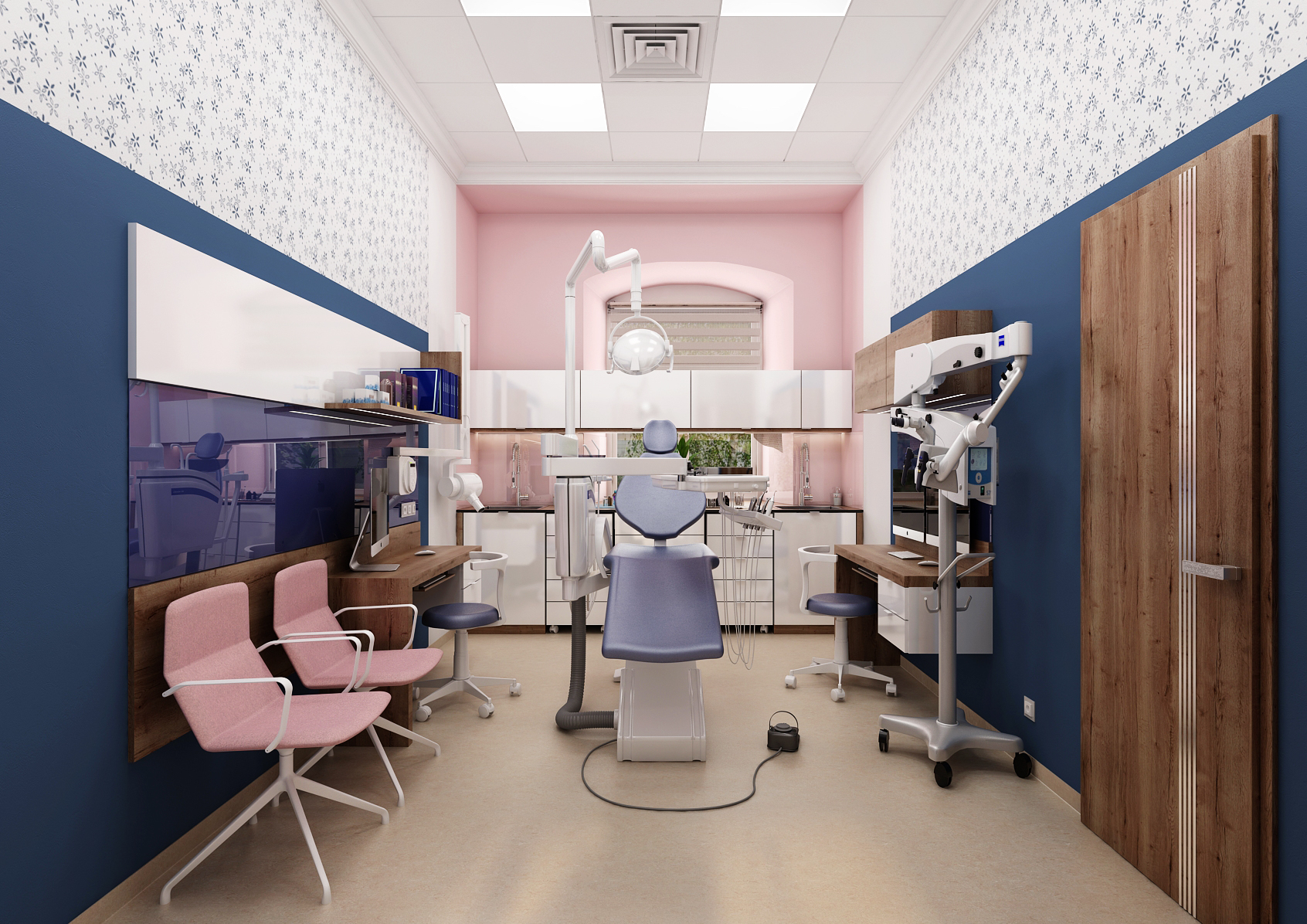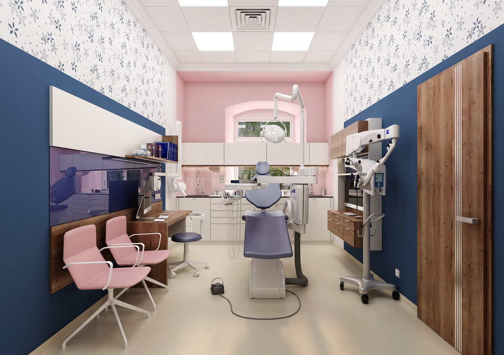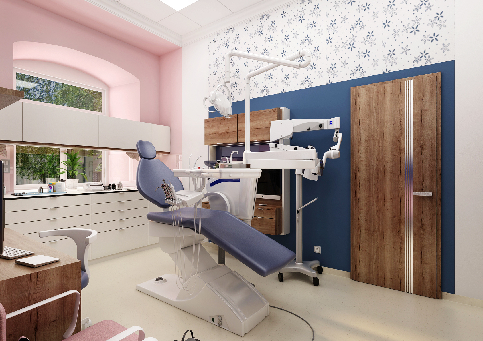 During the reconstruction of the dental office, which is located in a historic building, we focused on making the space more pleasant. A combination of colors as well as patterned wallpaper was used for this. At the same time, it is necessary to pay attention to the ergonomics of equipment that has been consulted directly with the dentist.