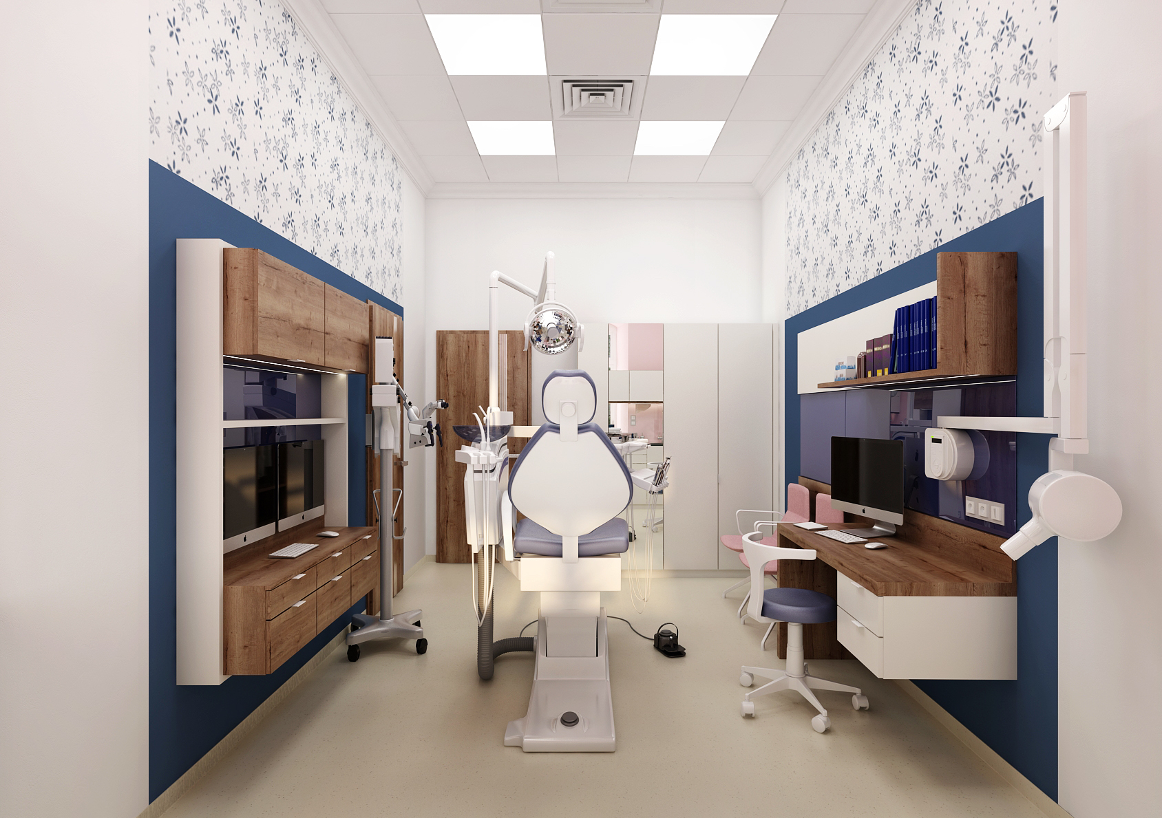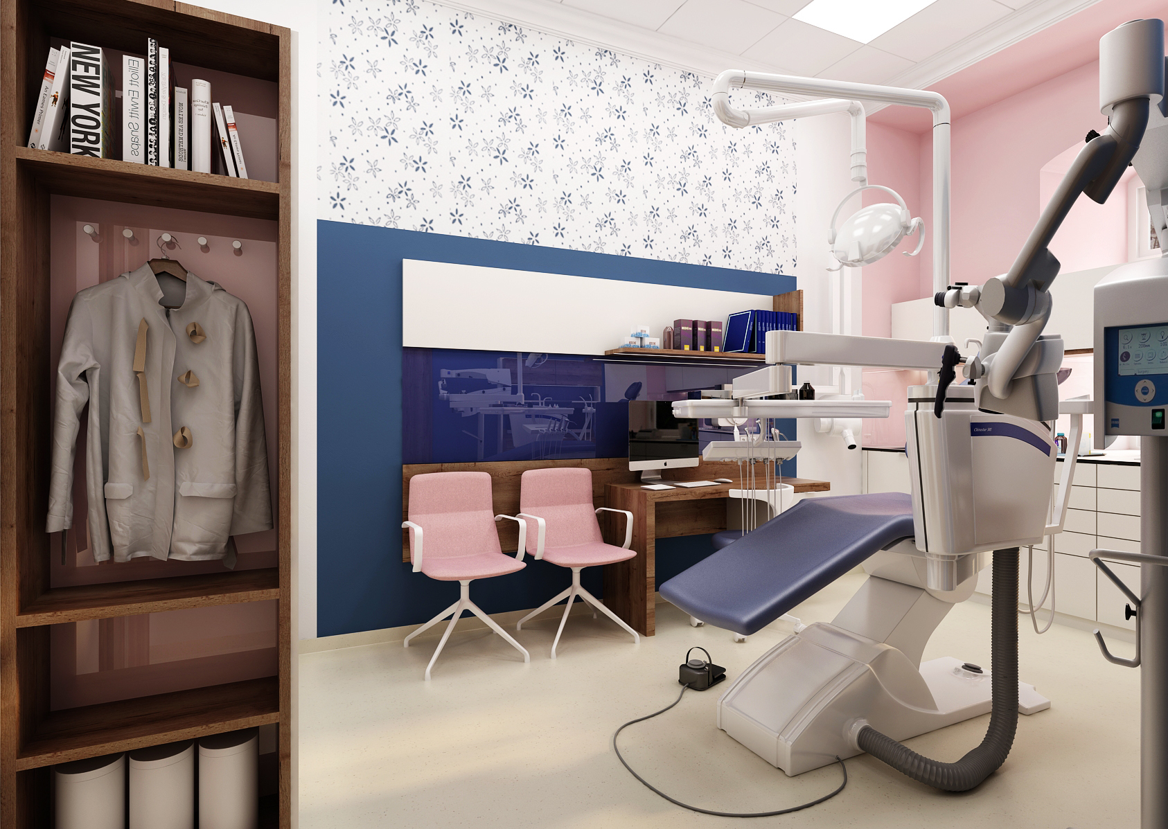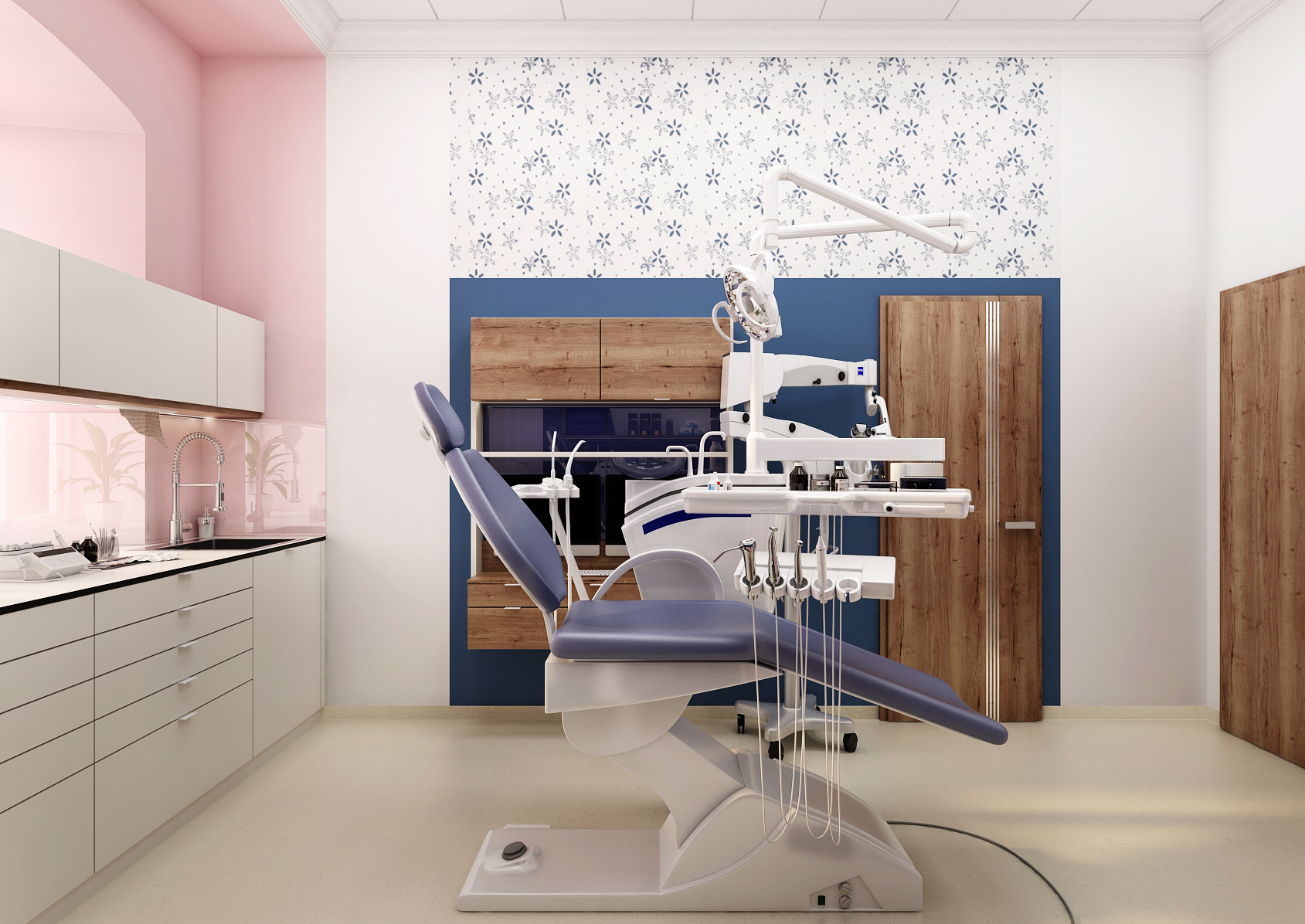 During the reconstruction of the dental office, which is located in a historic building, we focused on making the space more pleasant. A combination of colors as well as patterned wallpaper was used for this. At the same time, it is necessary to pay attention to the ergonomics of equipment that has been consulted directly with the dentist.