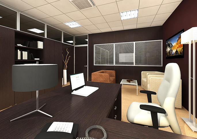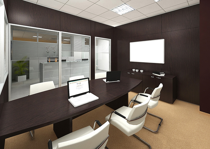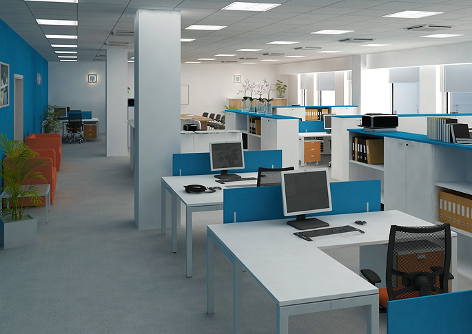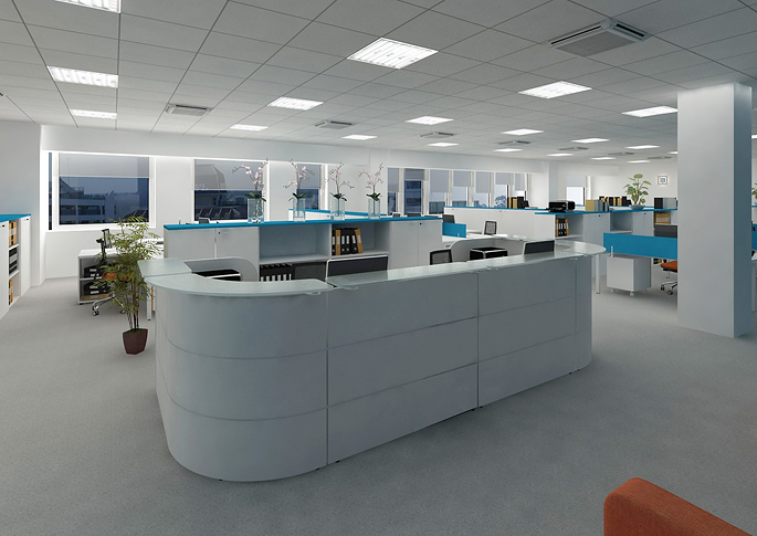 Open space, meeting room, director's office and observation deck for a short break. The entire open space office is decorated in white with blue accessories to enhance the environment. The room looks happier and is brightened with orange armchairs.
