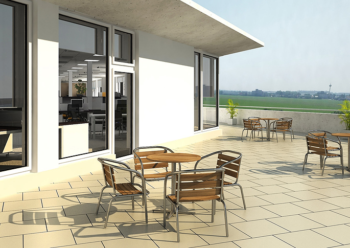 Sitting on the terrace is designed to relax in the fresh air during a break. Allows a view of the landscape. The furniture elements are designed in the same style. Chairs and table with metal base and natural material.