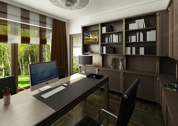 Interior design of a luxury law office, with a fireplace and garden views. The office is decorated in earthy colors in combination with white elements in the form of a spacious corner sofa, which brightens the room, a white carpet with high hair. There is also a modern corner fireplace with beige marble tiles. The space is illuminated by large French windows with the possibility of pulling fabric blinds.