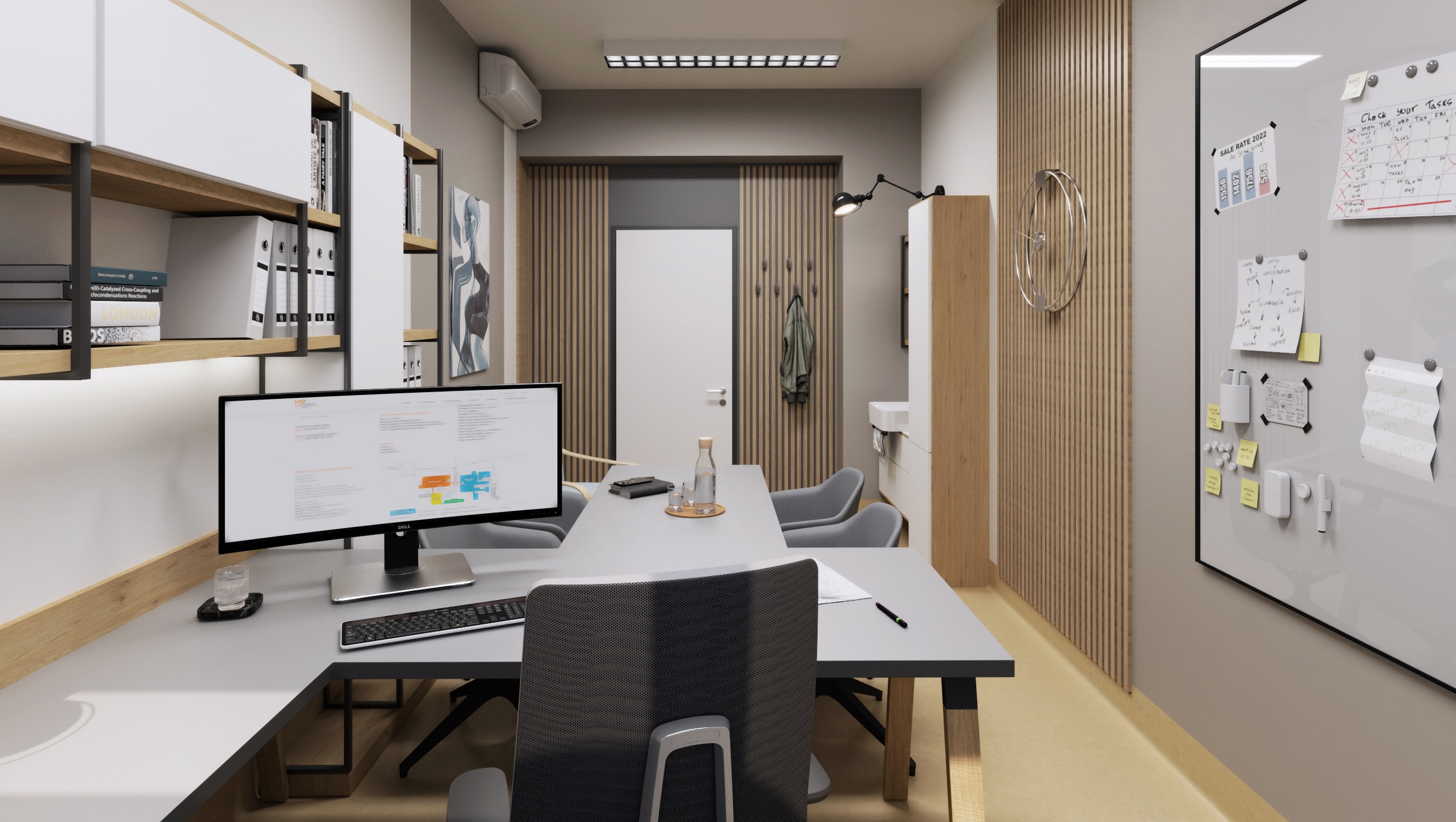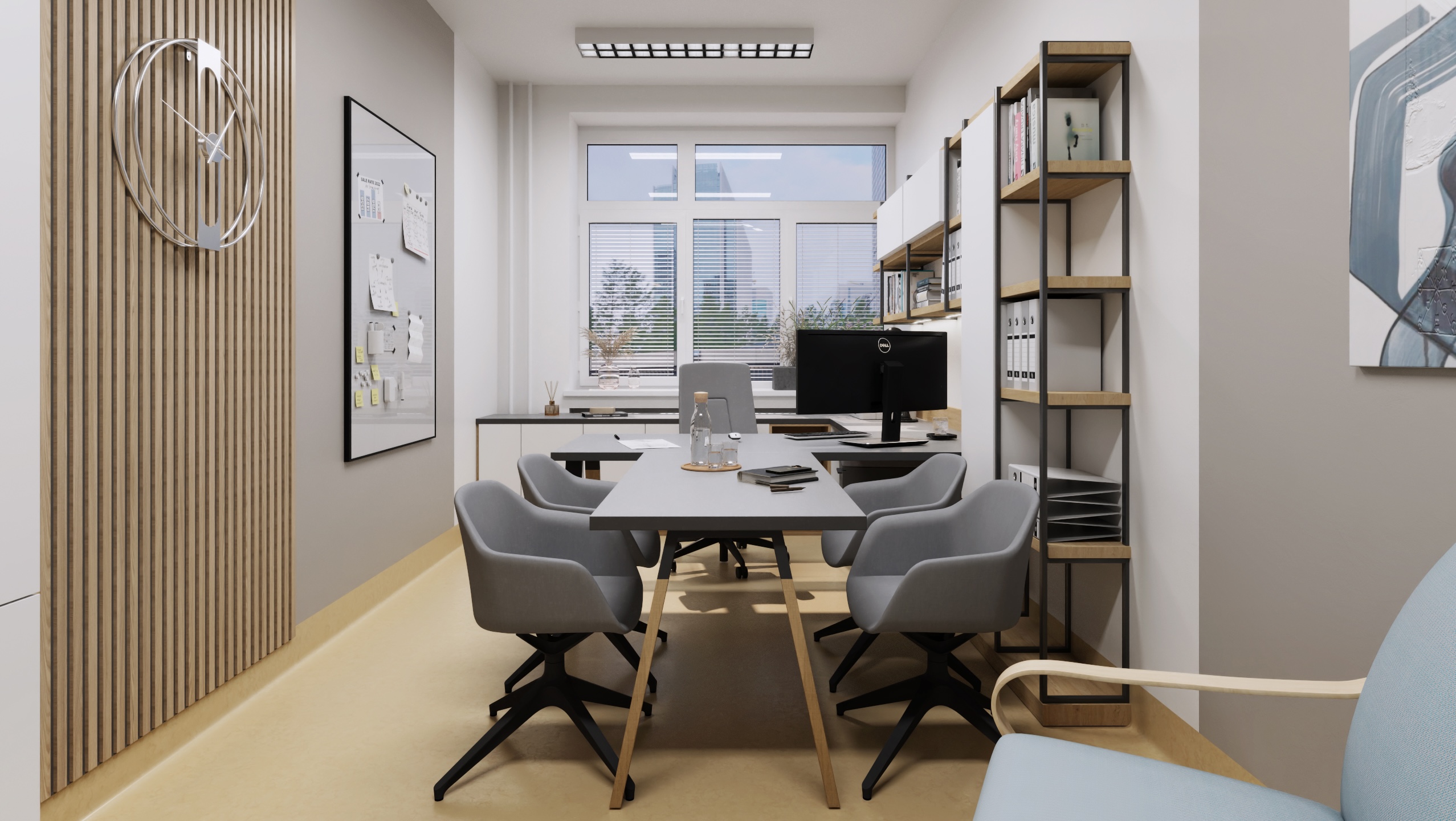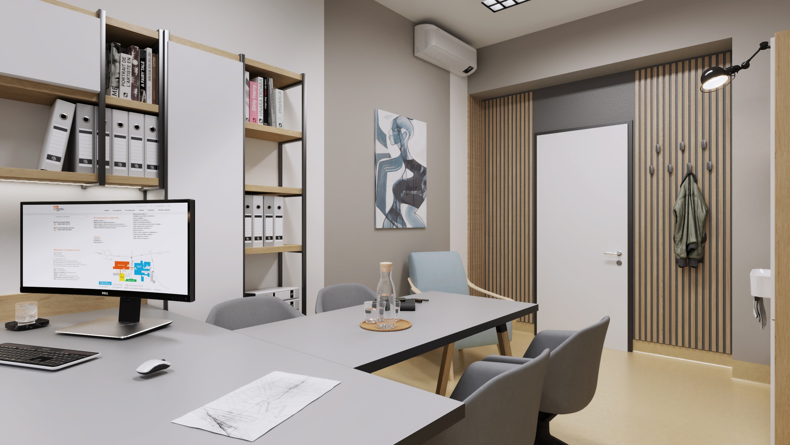 The interior of the office is in a modern and minimalist style, dominated by a combination of light wood, gray tones and white elements.