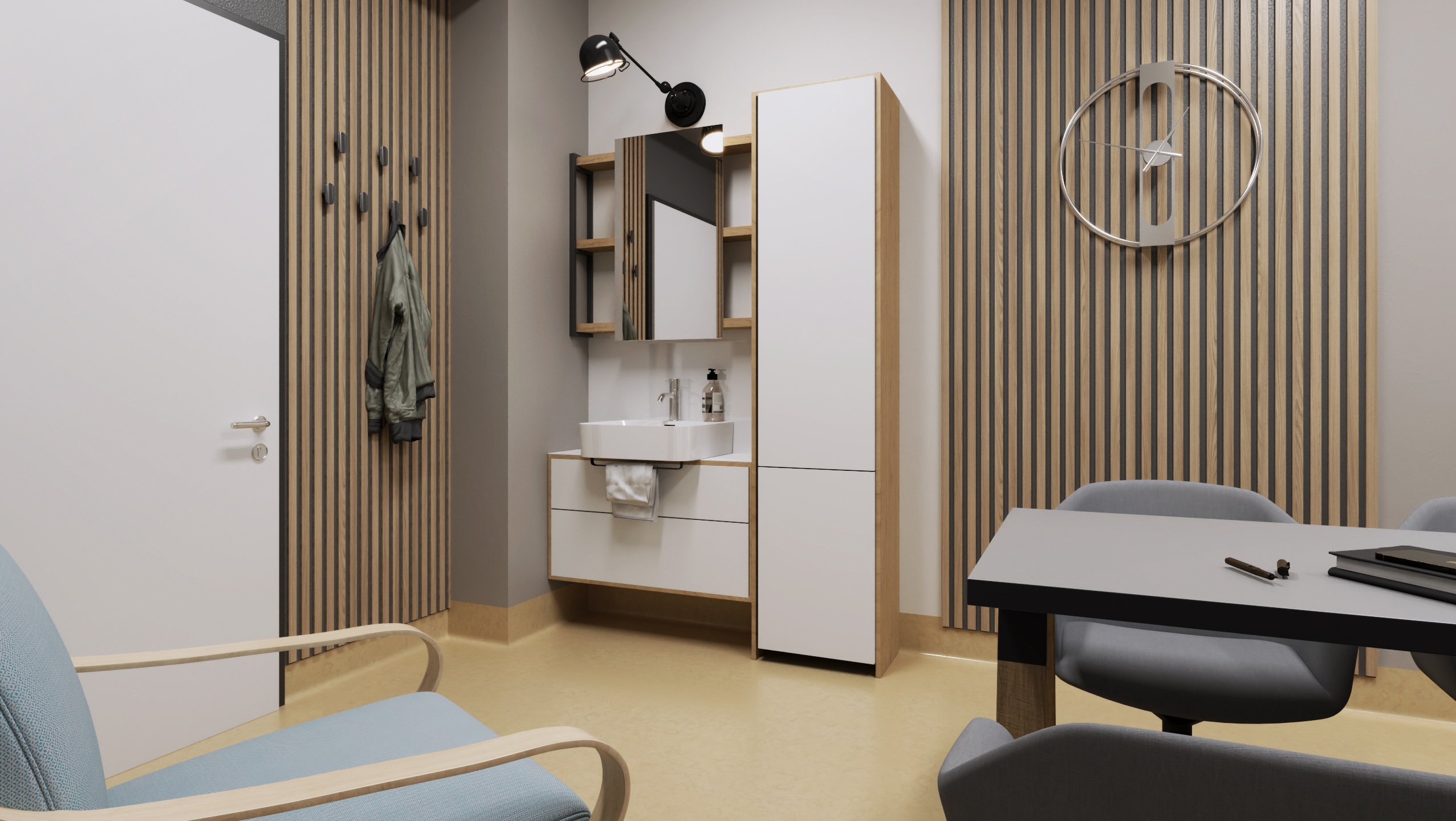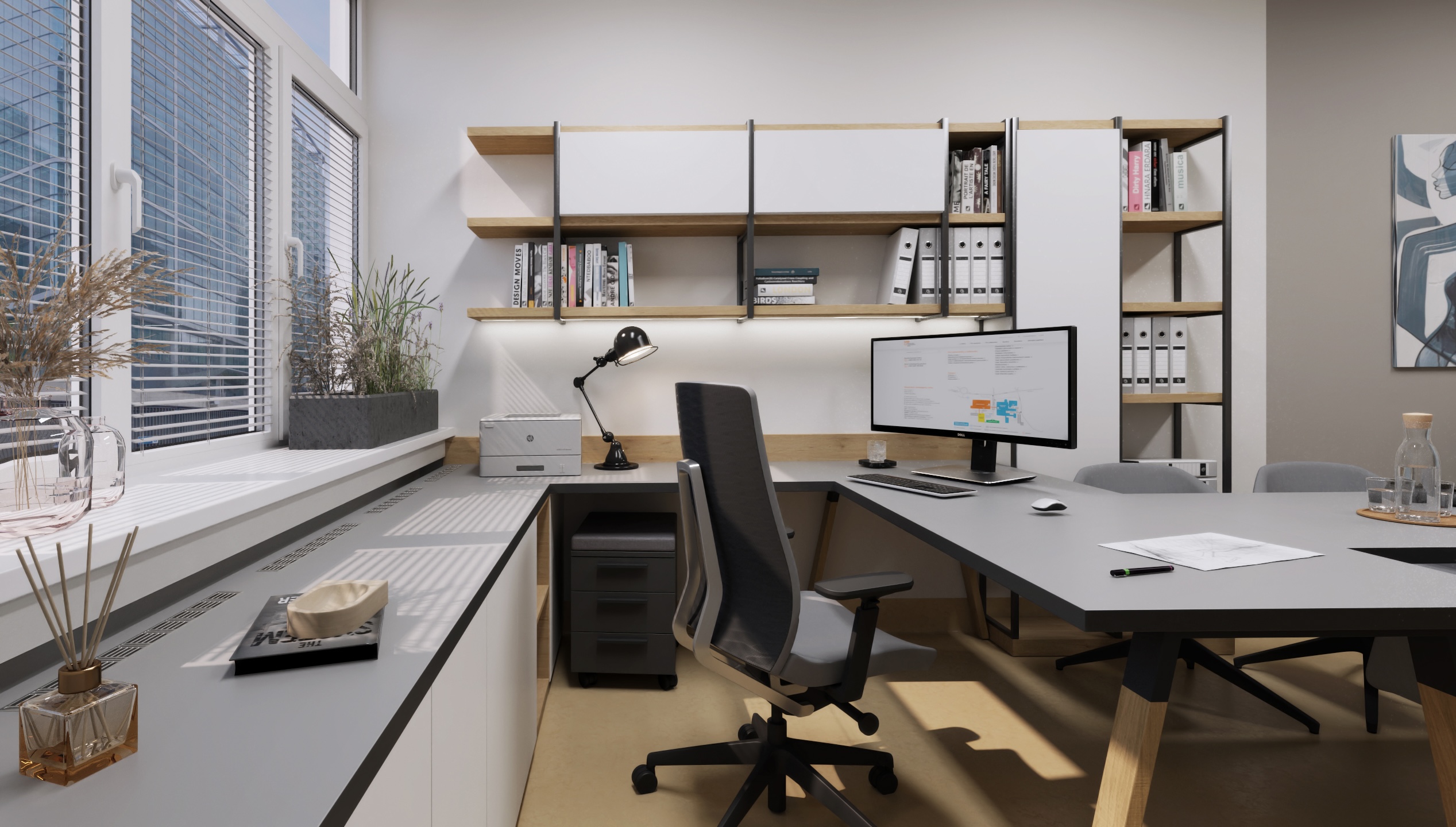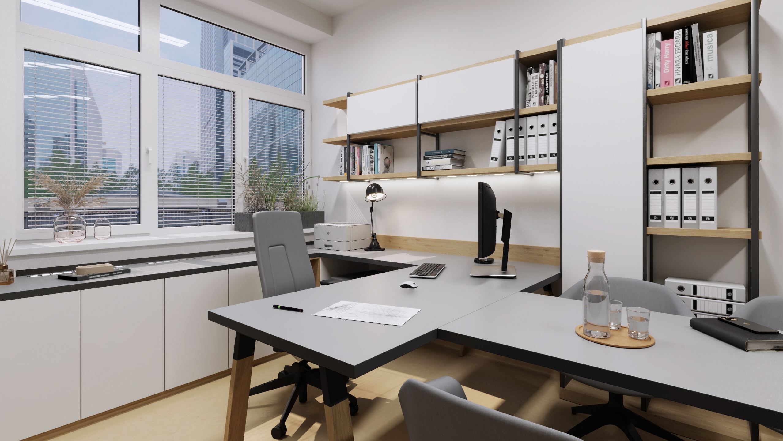 The interior of the office is in a modern and minimalist style, dominated by a combination of light wood, gray tones and white elements.