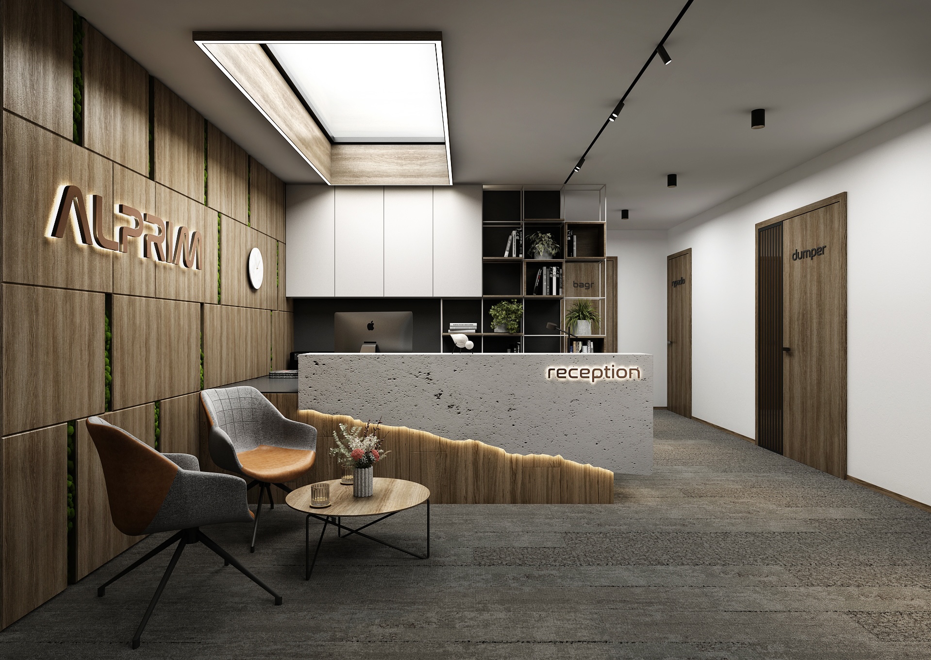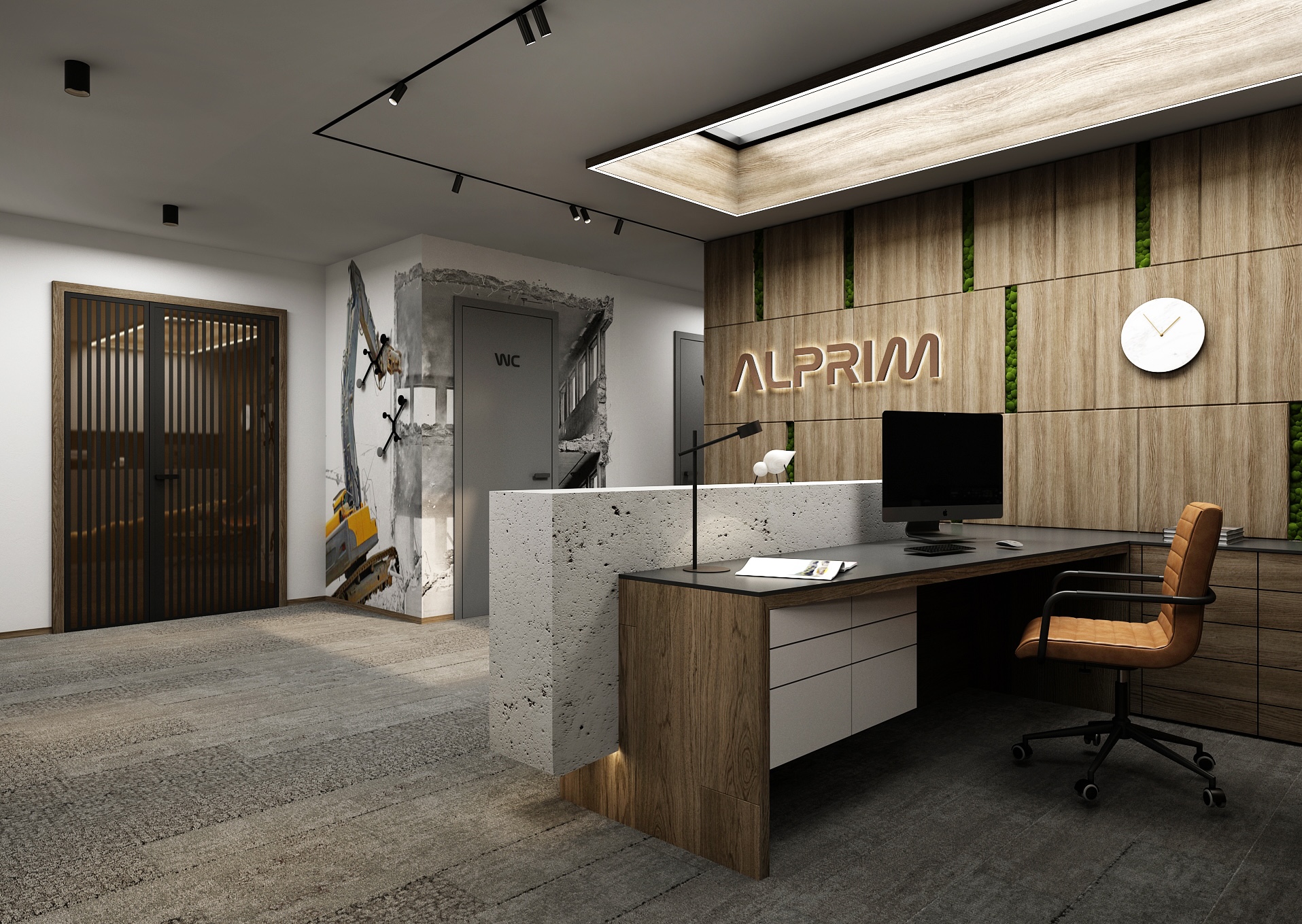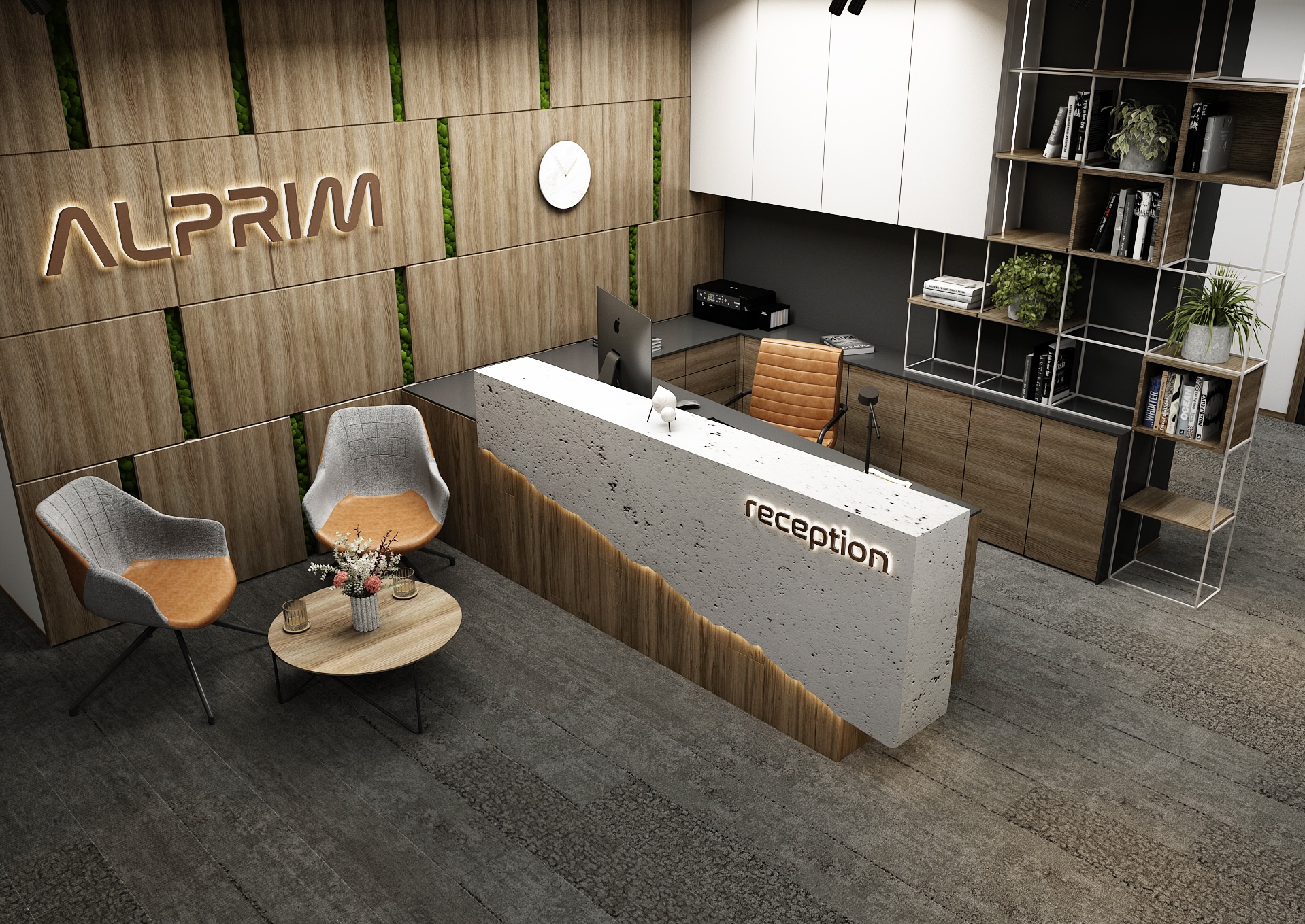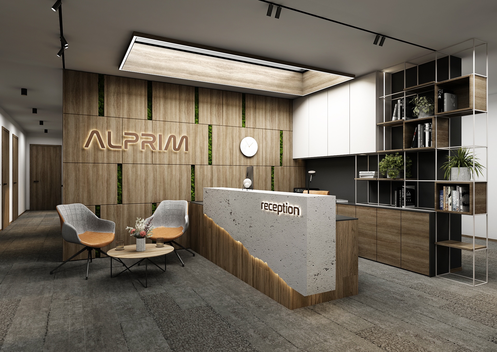 The dominant feature of the space is the reception desk in a raw concrete look with backlighting, which contrasts with the wooden wall coverings and gray carpets. The ALPRIM brand is subtly illuminated in a wooden panel with vertical stripes of green, which gives the entire space a fresh touch and connects the interior with nature.
