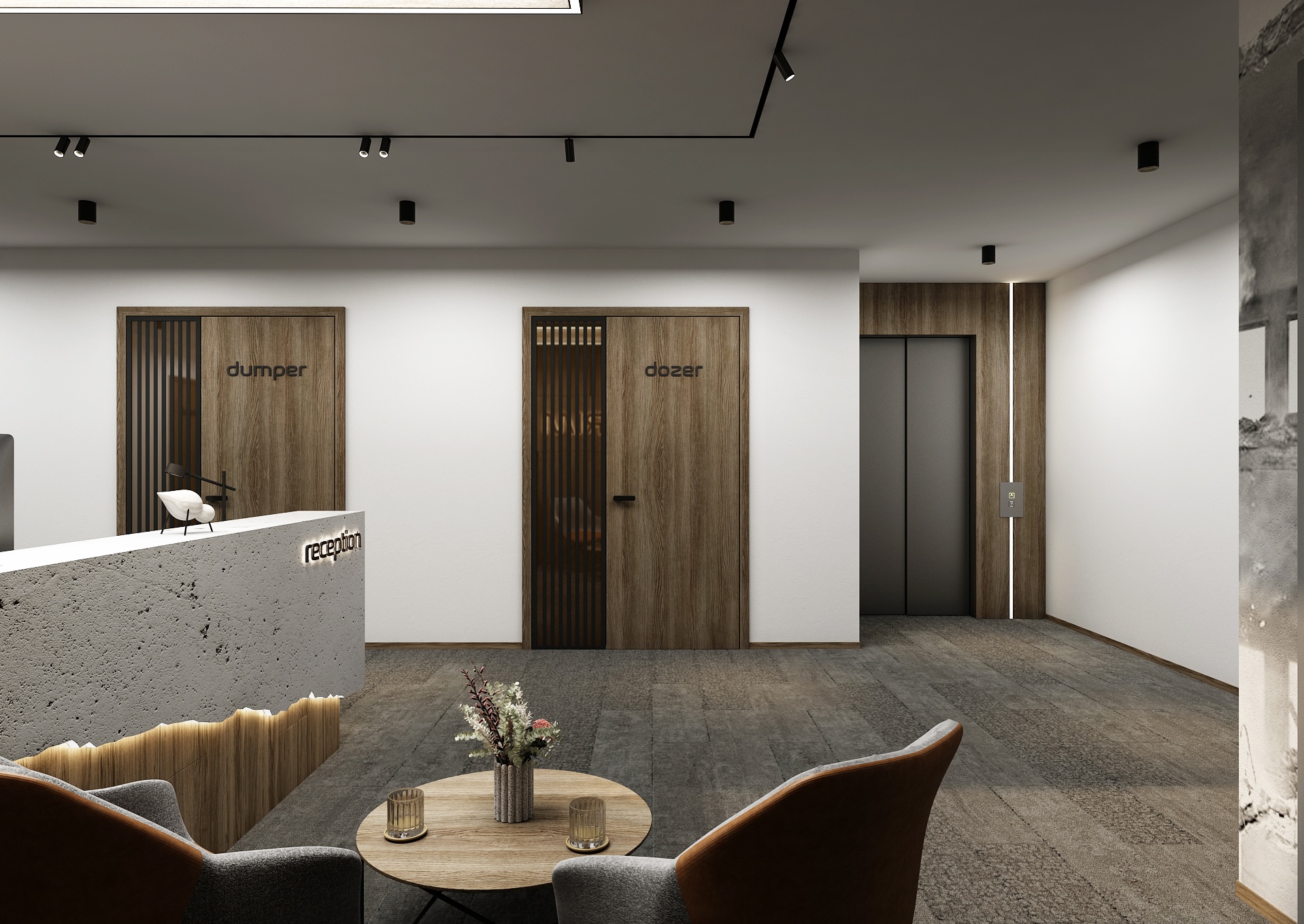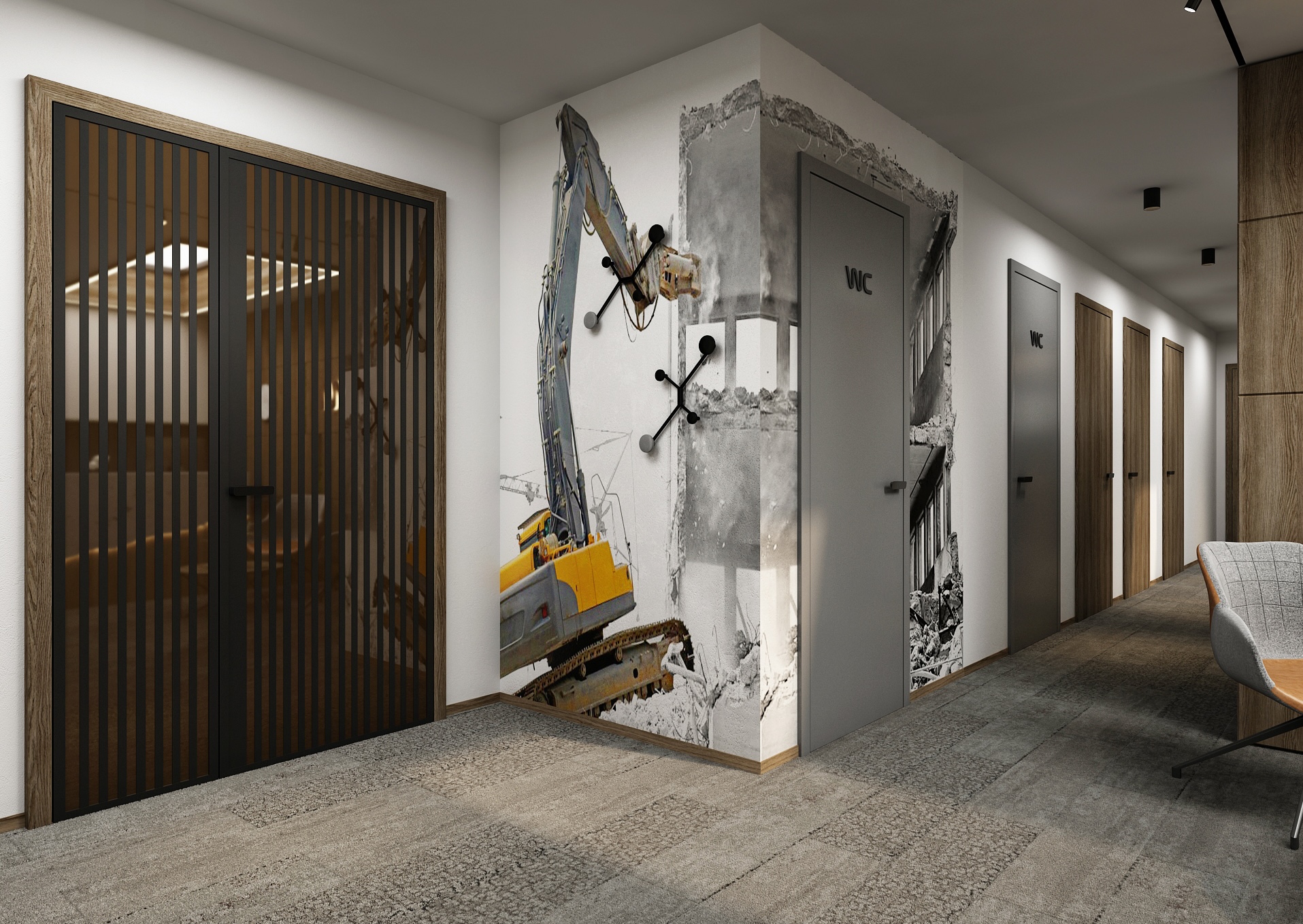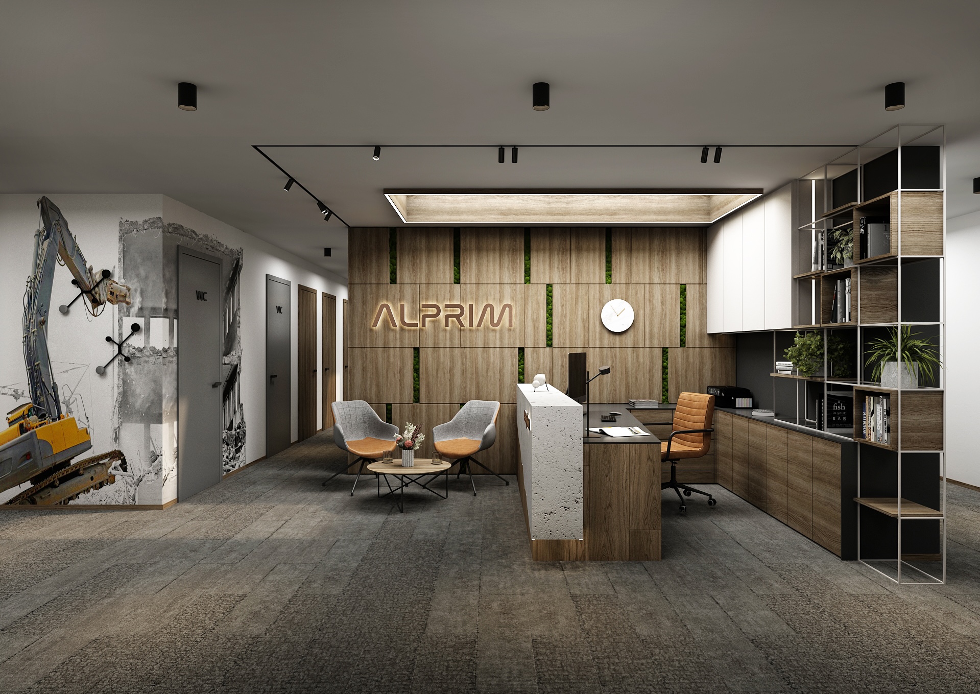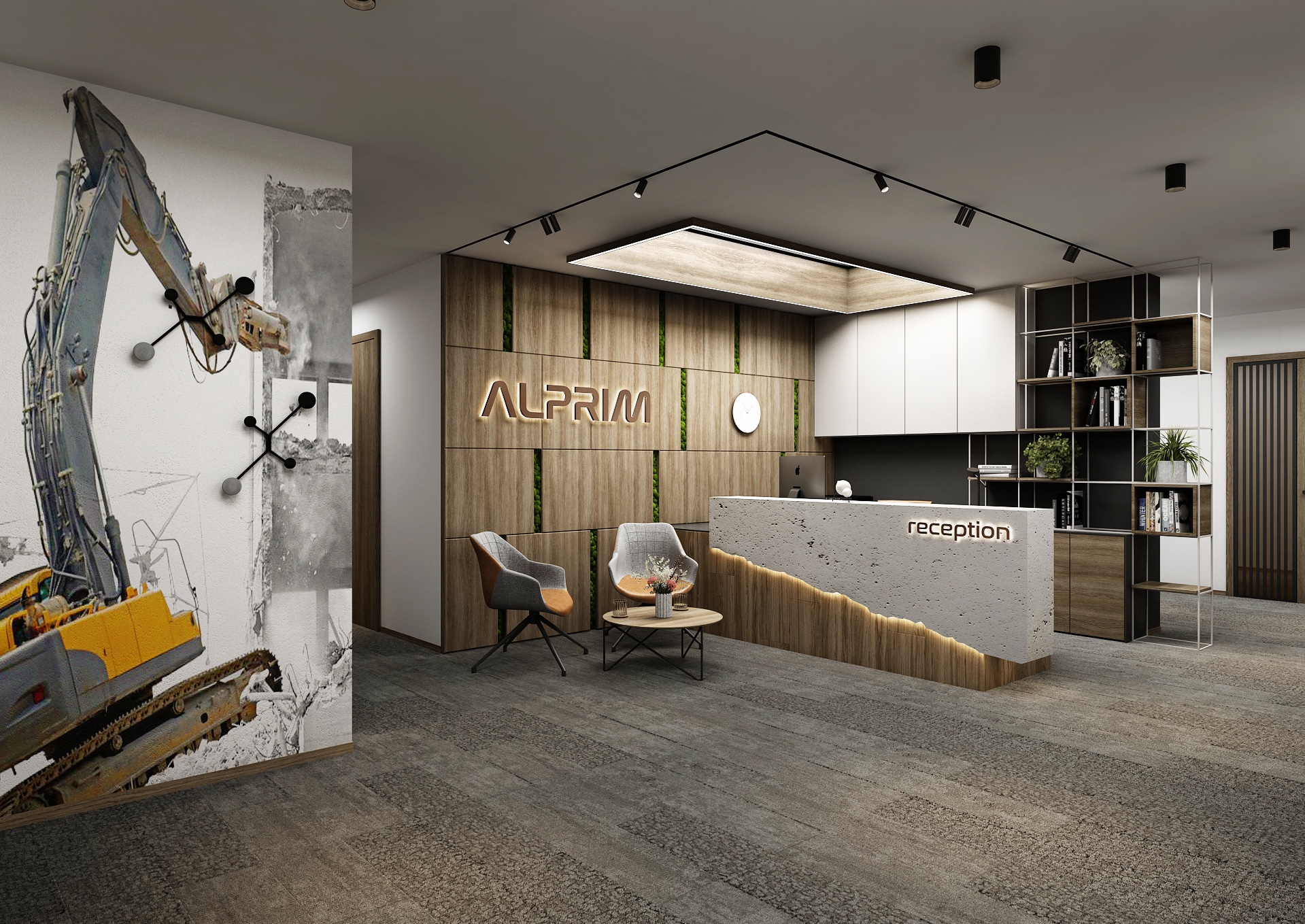 On the left, a large-format excavator motif stands out, referring to the company's activities and adding an industrial character to the otherwise elegant environment. Modern furniture - two contrasting armchairs and a round table with floral decoration - creates a pleasant waiting area. Open shelves with books and greenery enliven the back of the space and are both practical and aesthetic. The overall impression is professional, tasteful and well thought out.