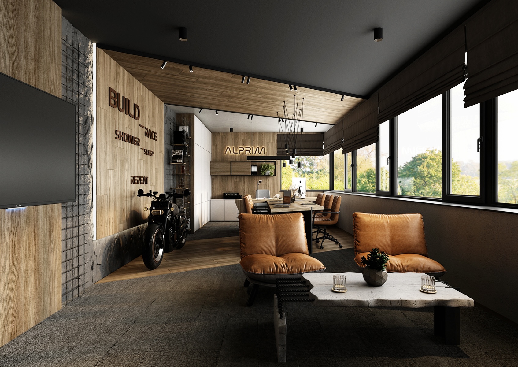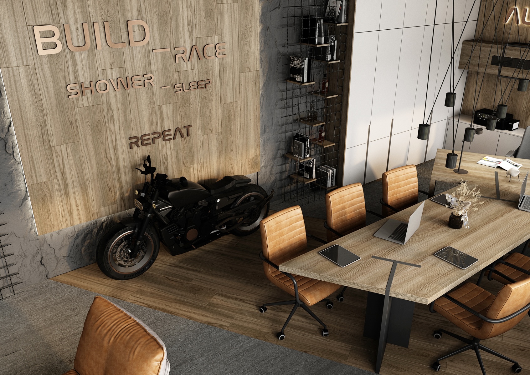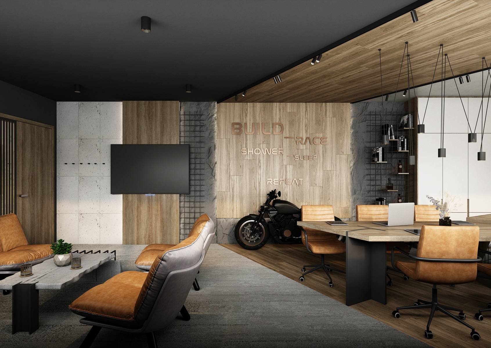 The walls are clad in wood and concrete with exposed metal reinforcement mesh, giving the space a raw yet sophisticated look. A motorcycle parked by the wall serves as a dominant feature, emphasizing the dynamic and energetic character of the office. Brown leather armchairs and a concrete coffee table create a comfortable and representative setting for informal meetings.