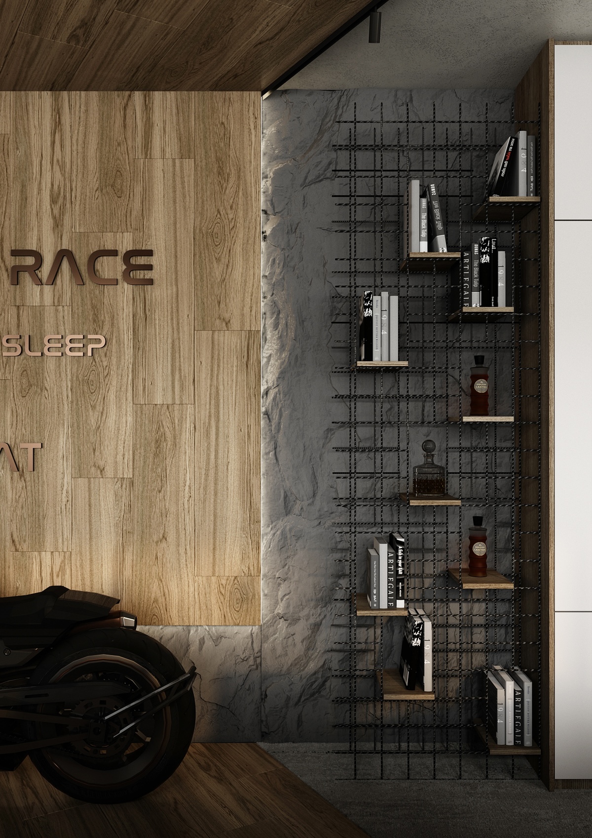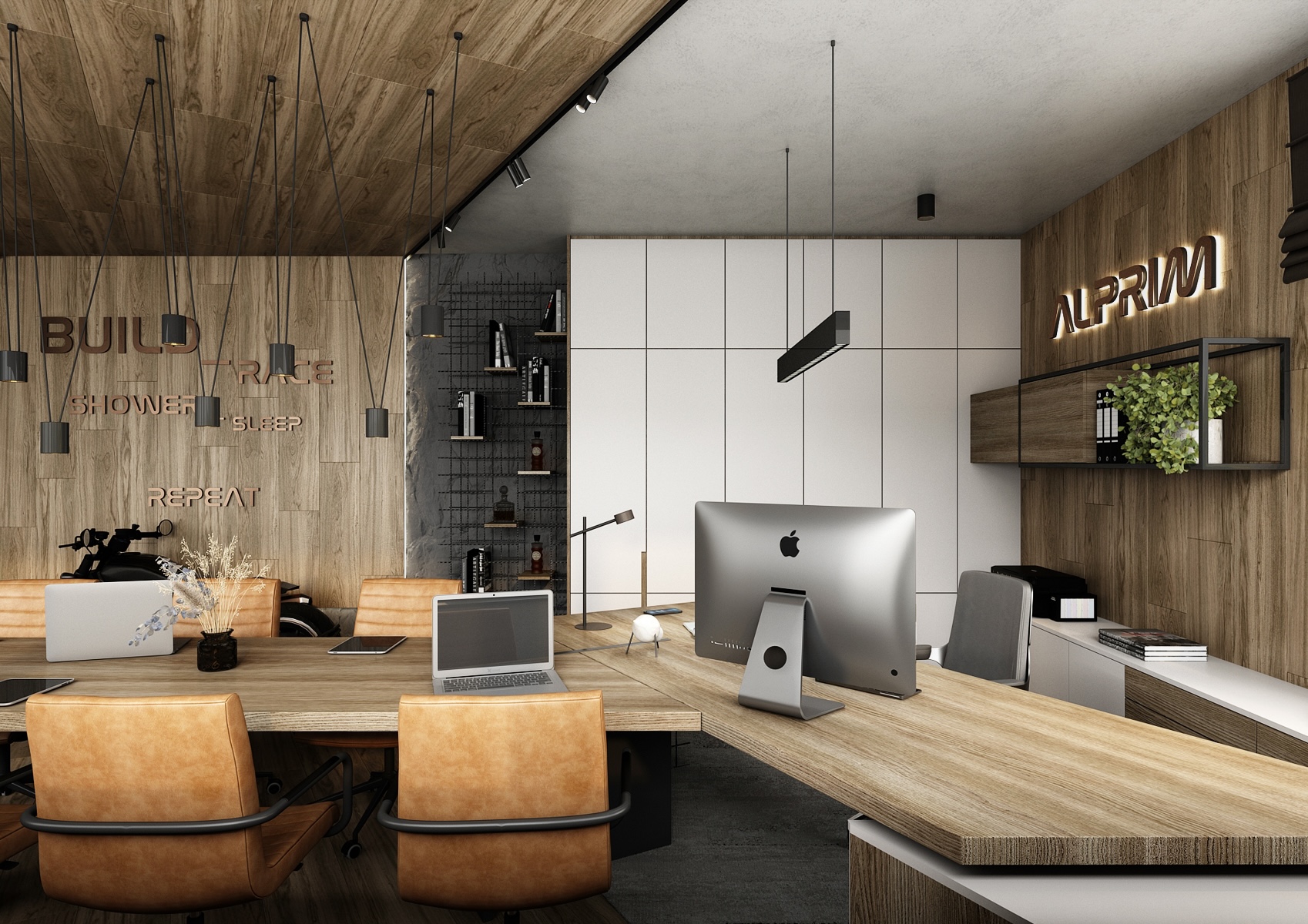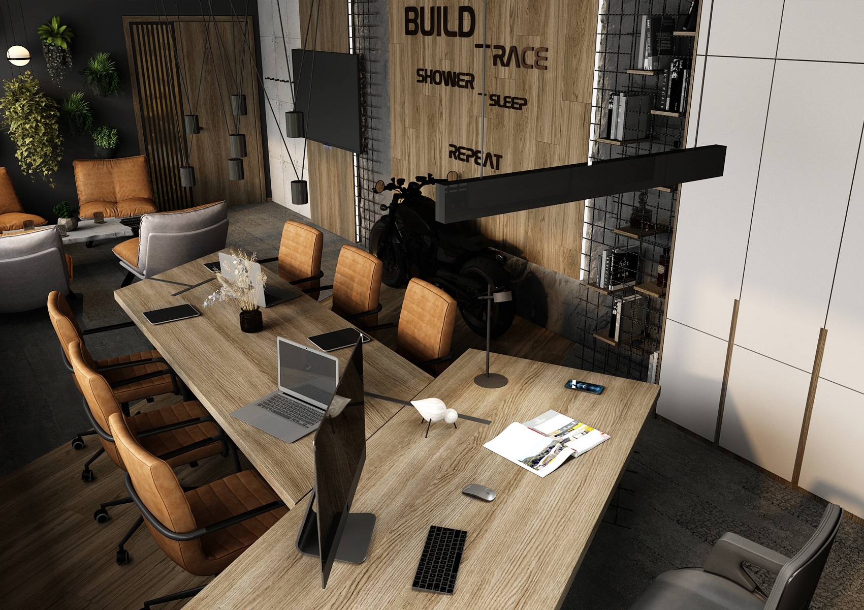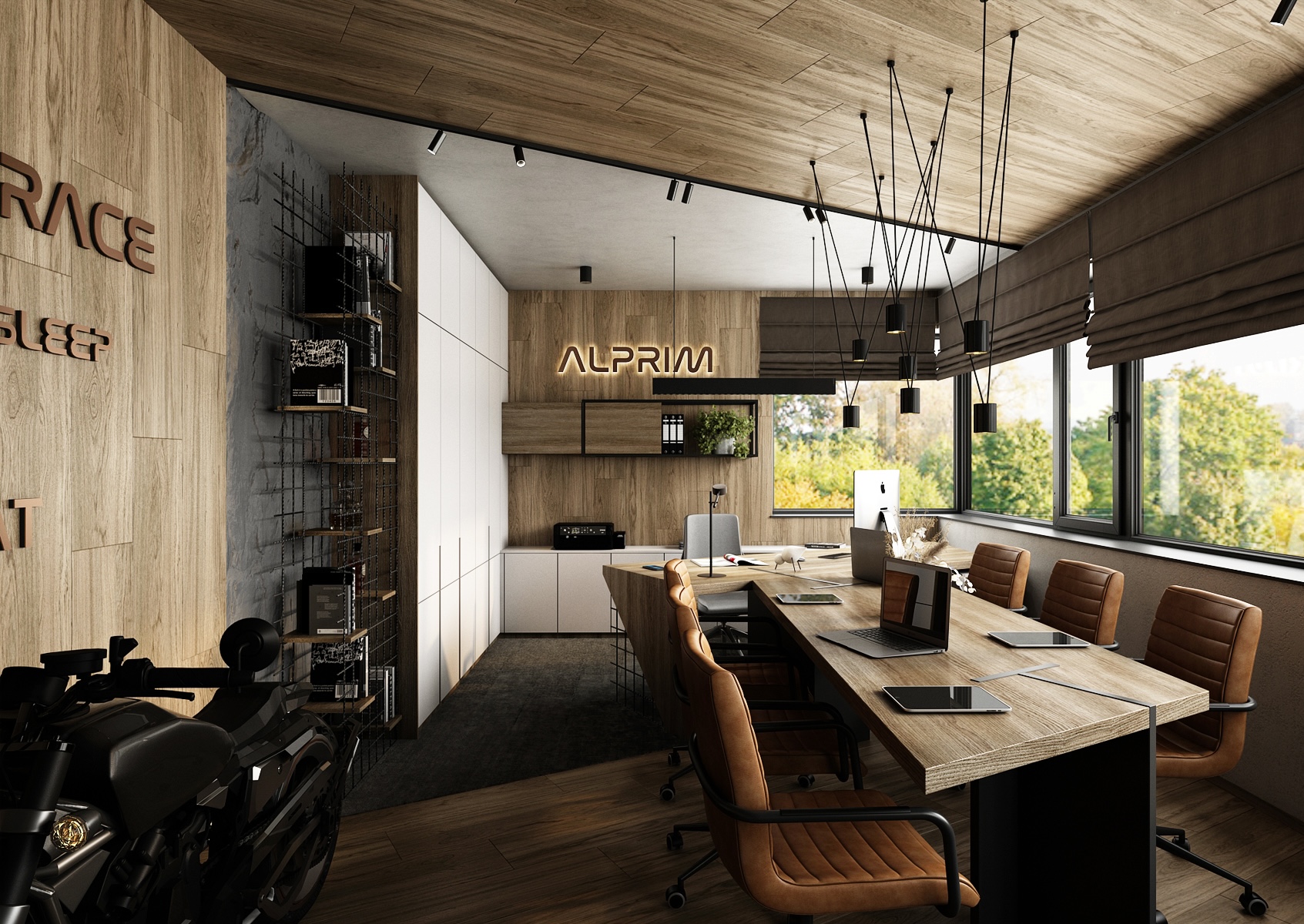 The walls are clad in wood and concrete with exposed metal reinforcement mesh, giving the space a raw yet sophisticated look. A motorcycle parked by the wall serves as a dominant feature, emphasizing the dynamic and energetic character of the office. Brown leather armchairs and a concrete coffee table create a comfortable and representative setting for informal meetings.
