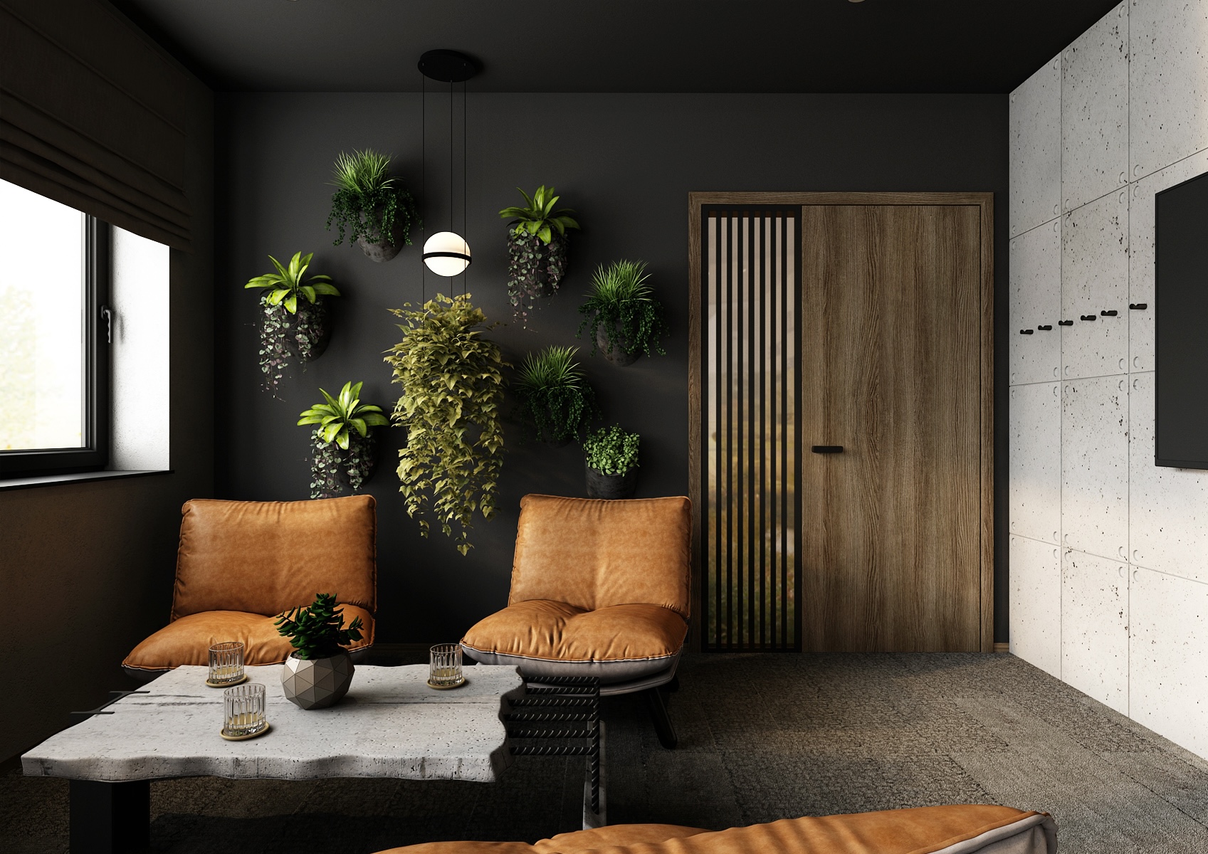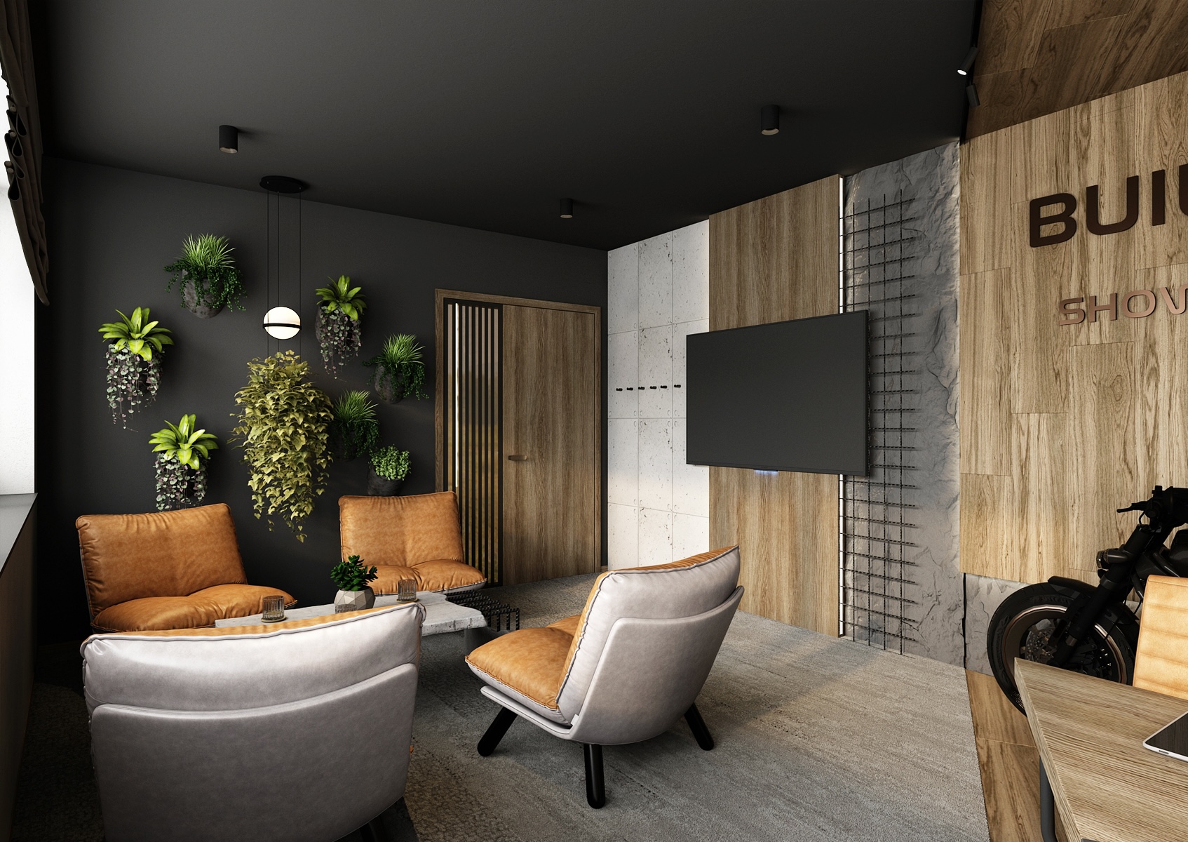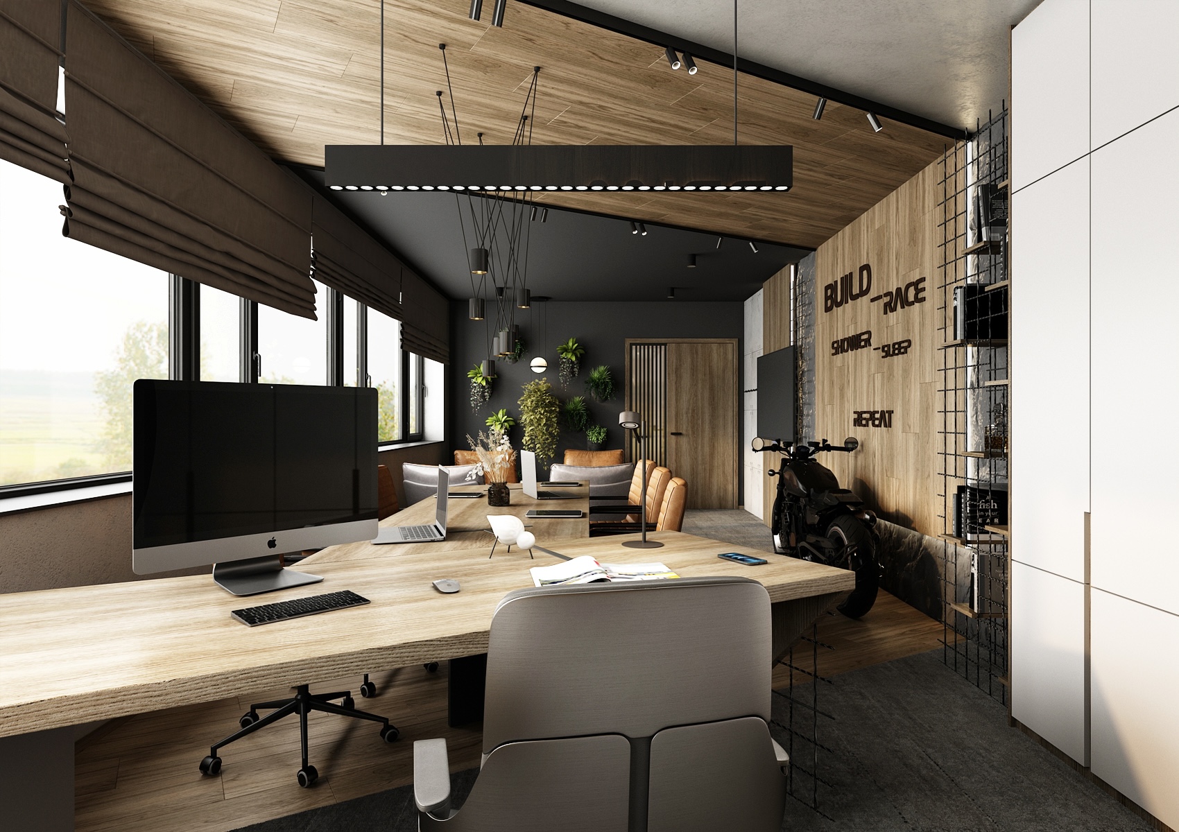 Large windows bring plenty of natural light into the room and offer a beautiful view of the greenery. On the dark wall in the relaxation area, hanging planters with live plants add a pleasant balance and freshness to the industrial space. Thoughtful lighting and high-quality materials enhance the luxurious atmosphere, while the workspace with modern equipment provides ideal conditions for focused work and business meetings.