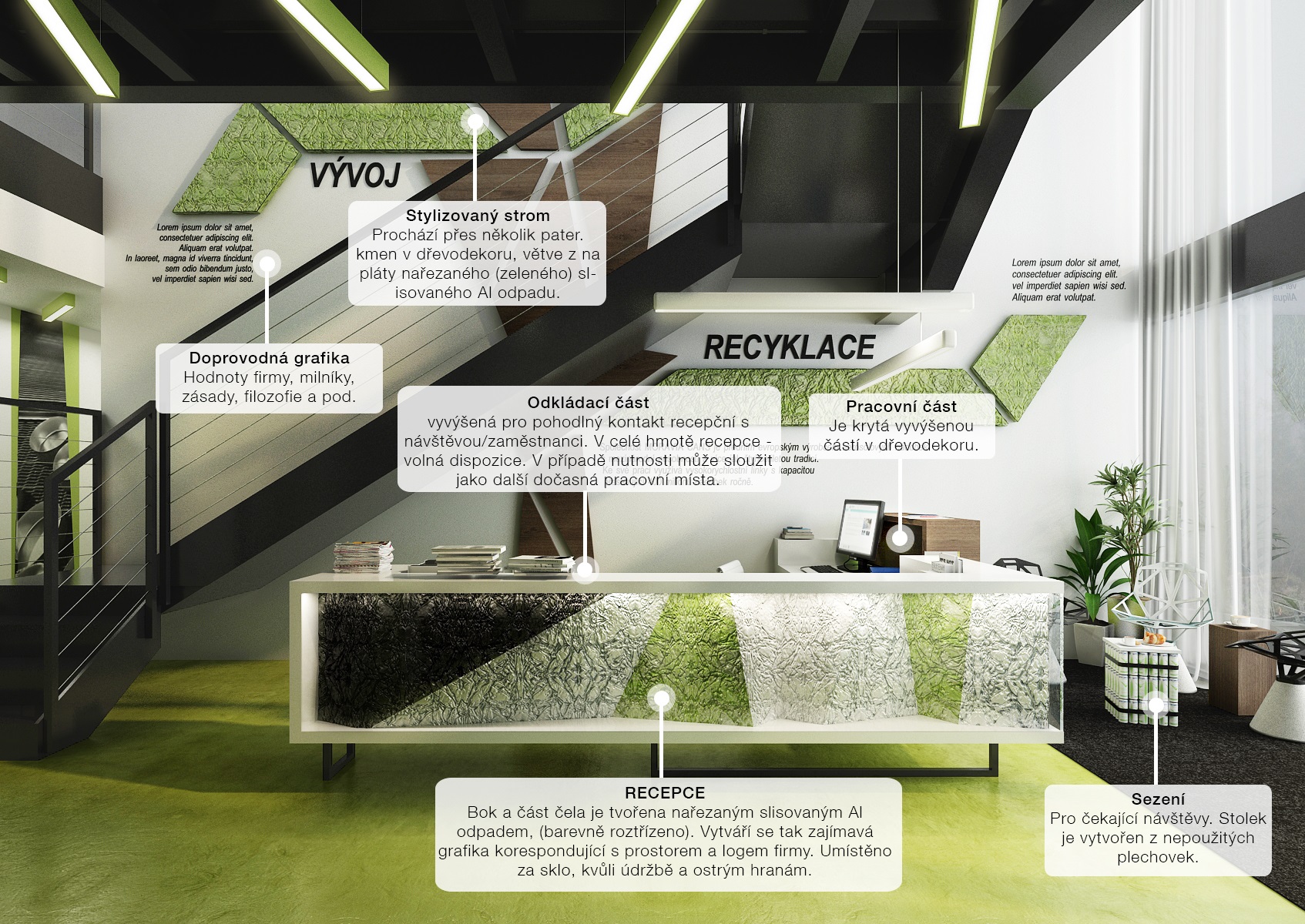 At first glance, the reception room looks modern. Pressed aluminum is used as a cladding for the reception desk, which is color-coded to create graphics corresponding to the company's logo. The white elements are combined with the green color and as an interesting element on the reception desk is its part made of dark wood decor. It is backlit and makes the materials used stand out. Located in the room and seating for visitors, where the table is made of un-used cans.