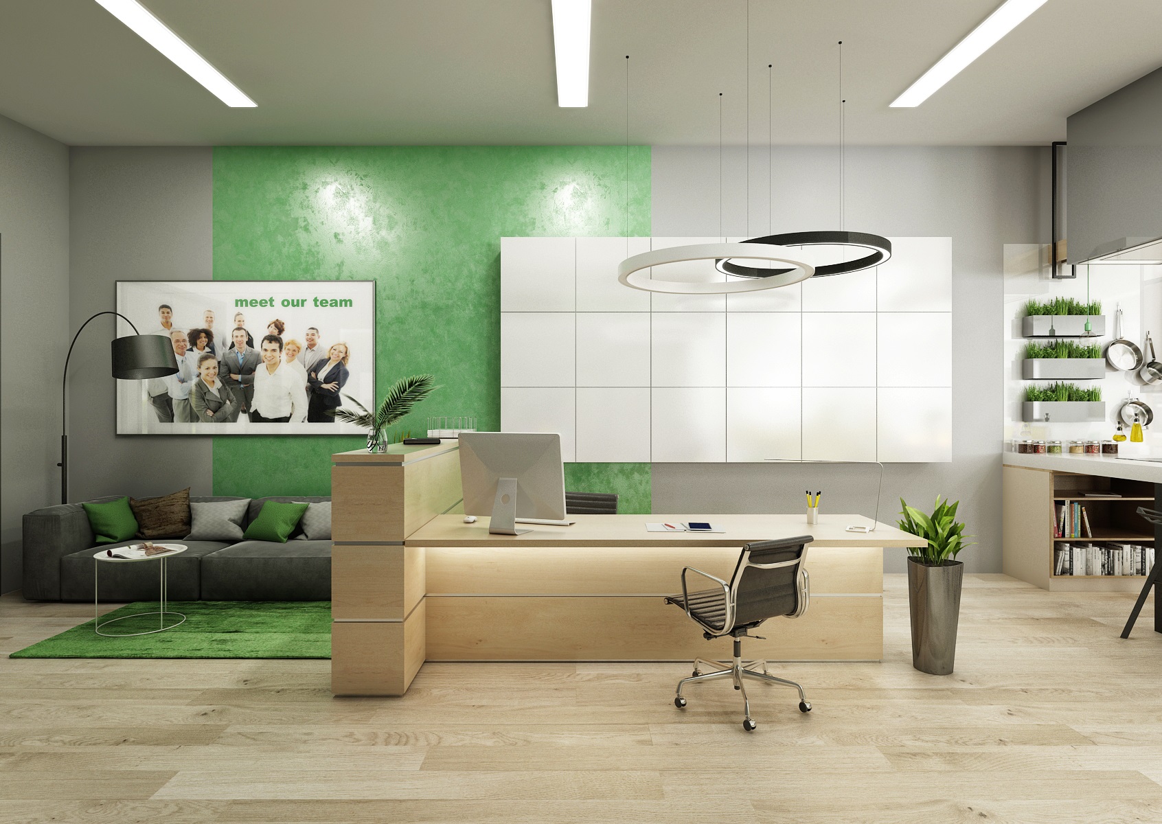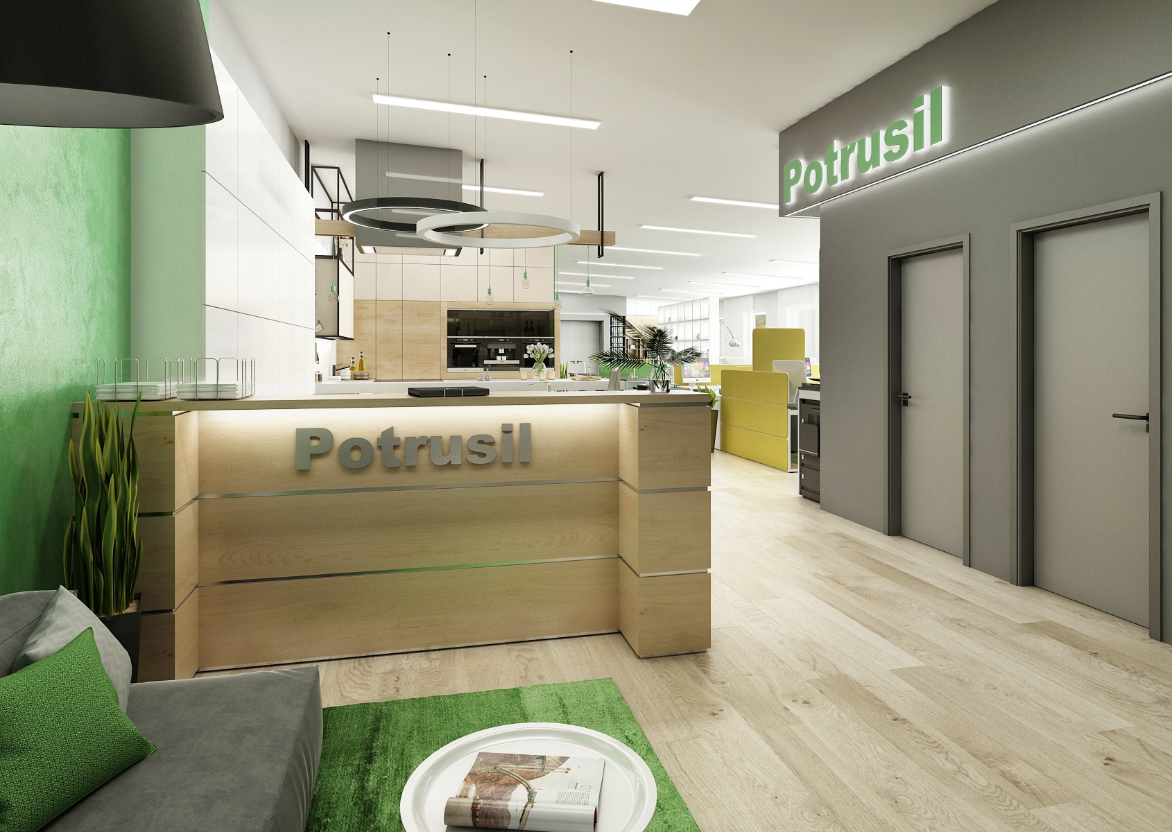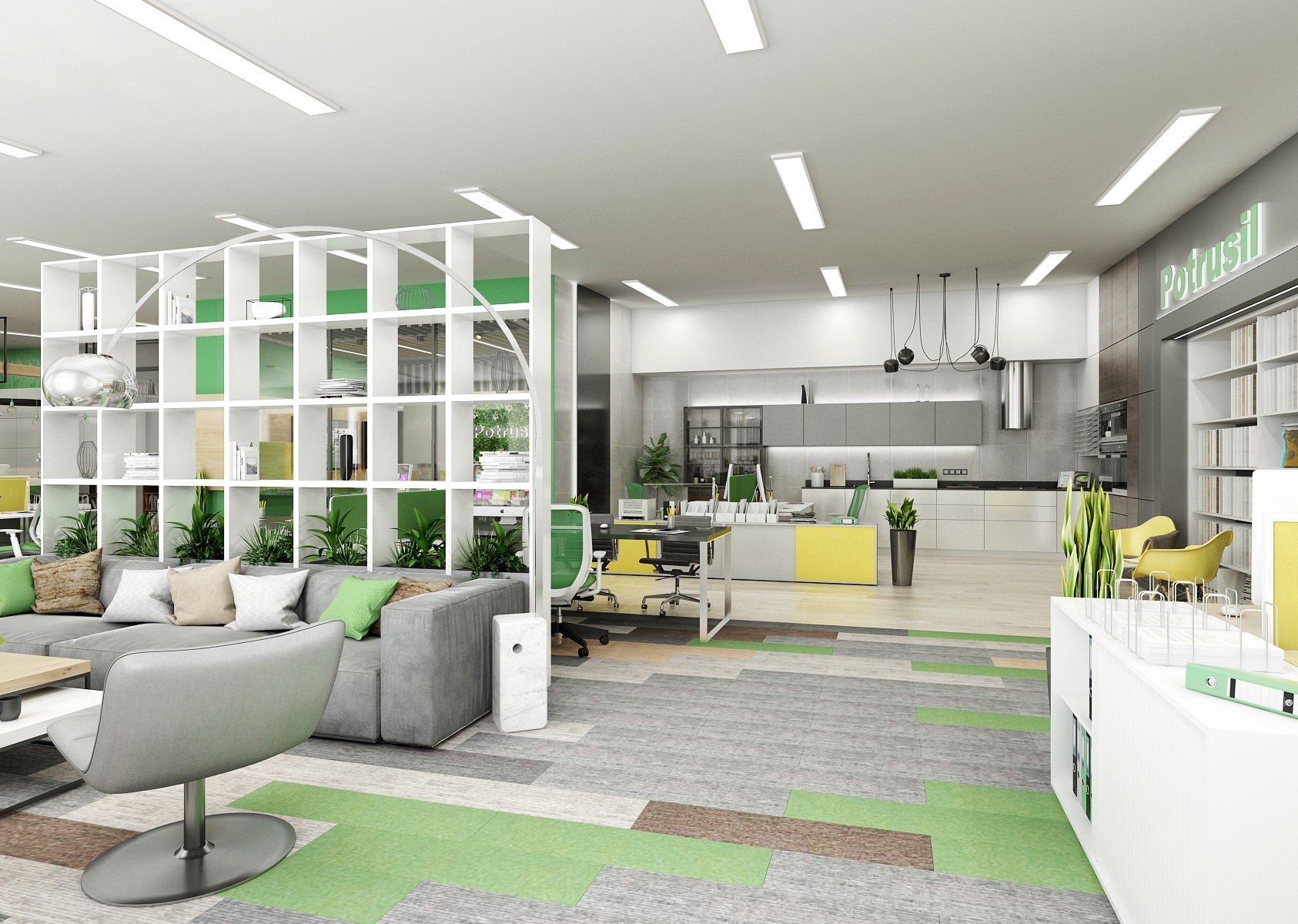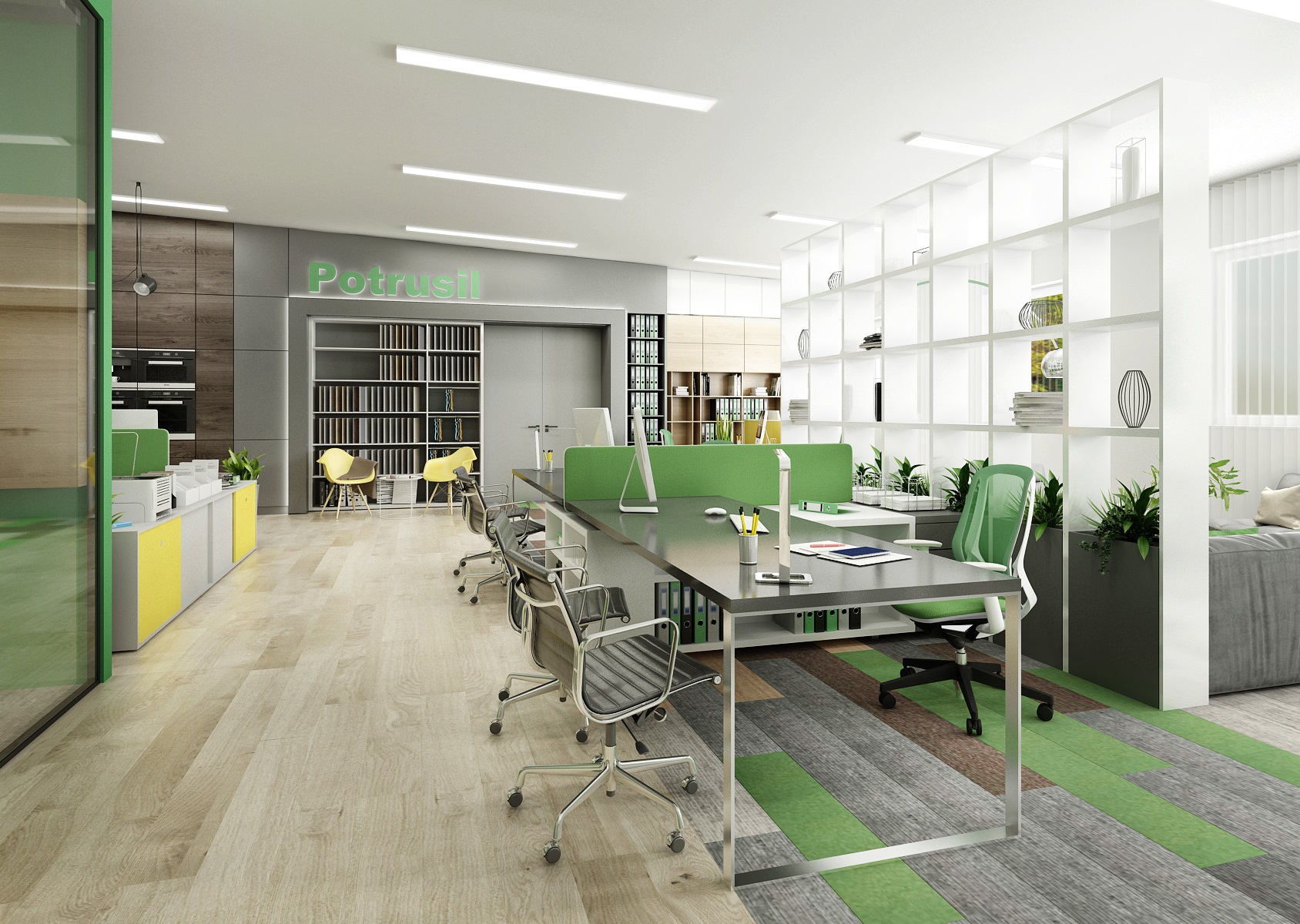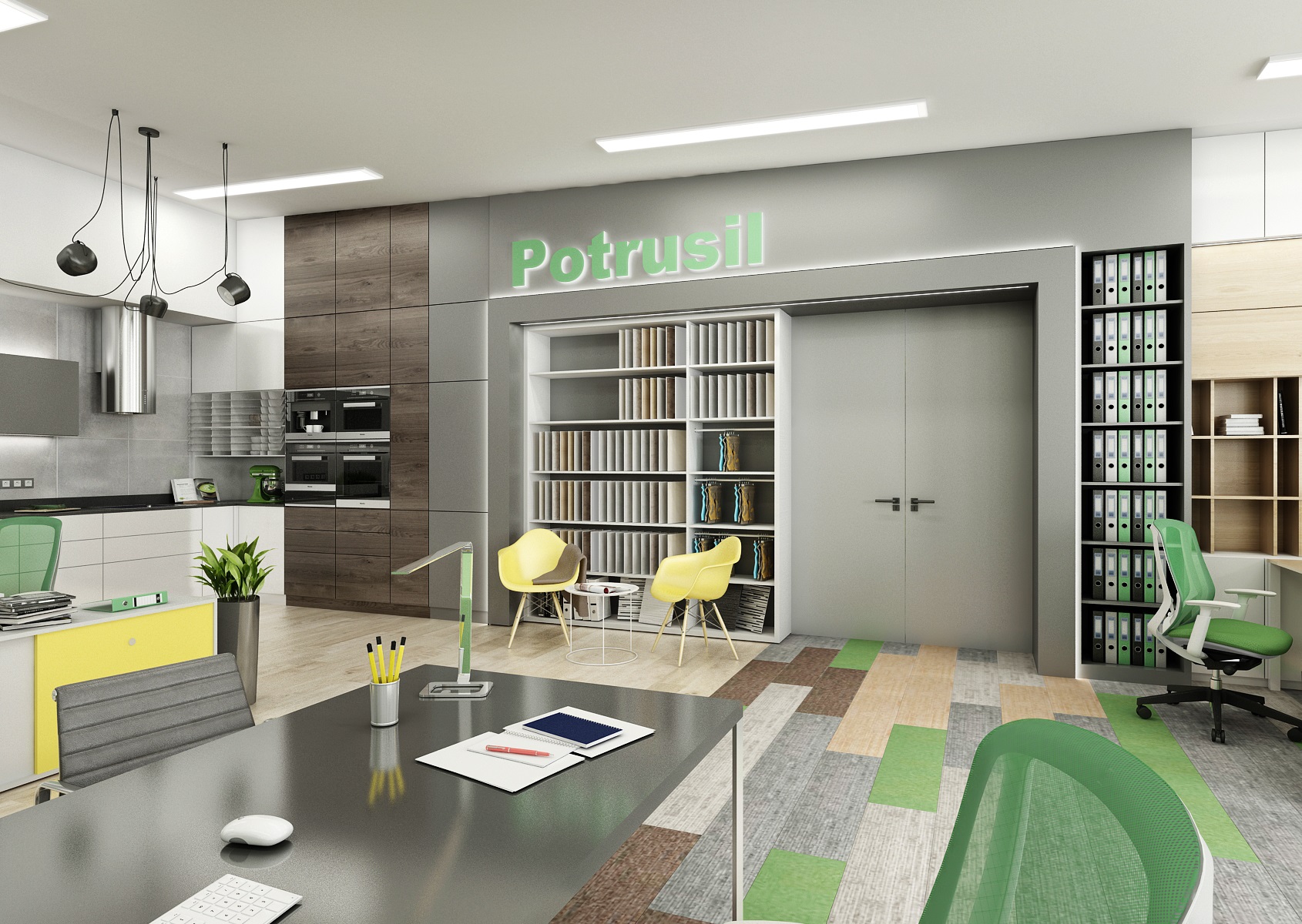 The space is used for the presentation of offered services, products or materials, as well as an office or meeting room for employees, which show their office lines directly in the area. In the interior design, in addition to neutral gray, white and wood, we mainly used the company's green color, which appears, for example, on painting, upholstery or parts of carpet strips.