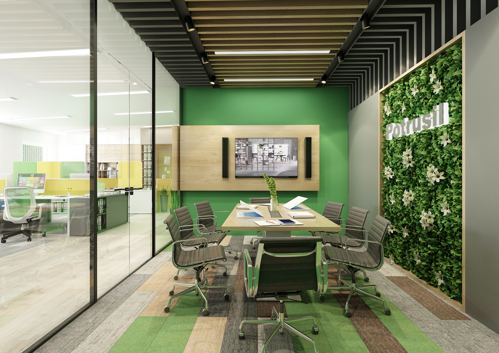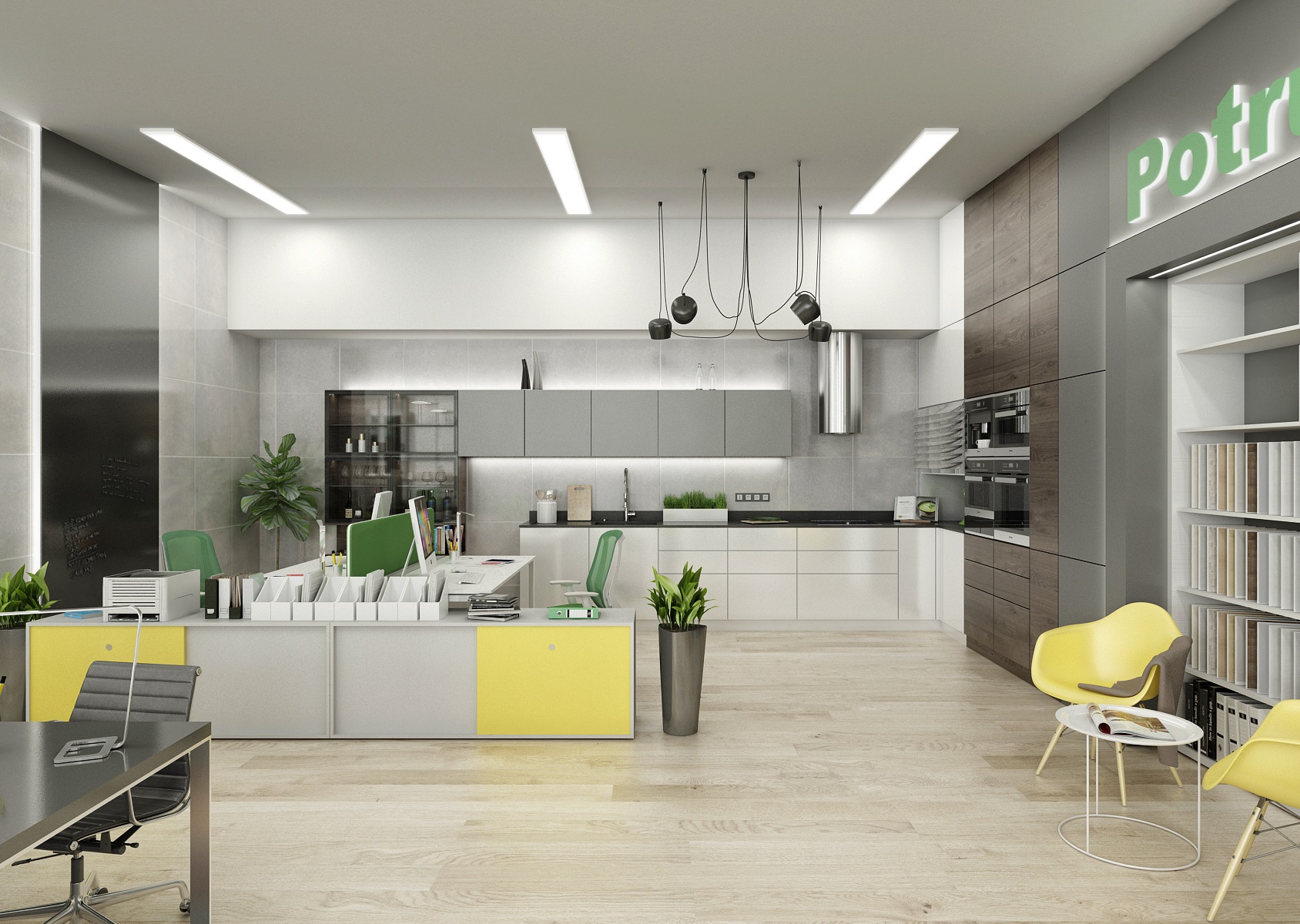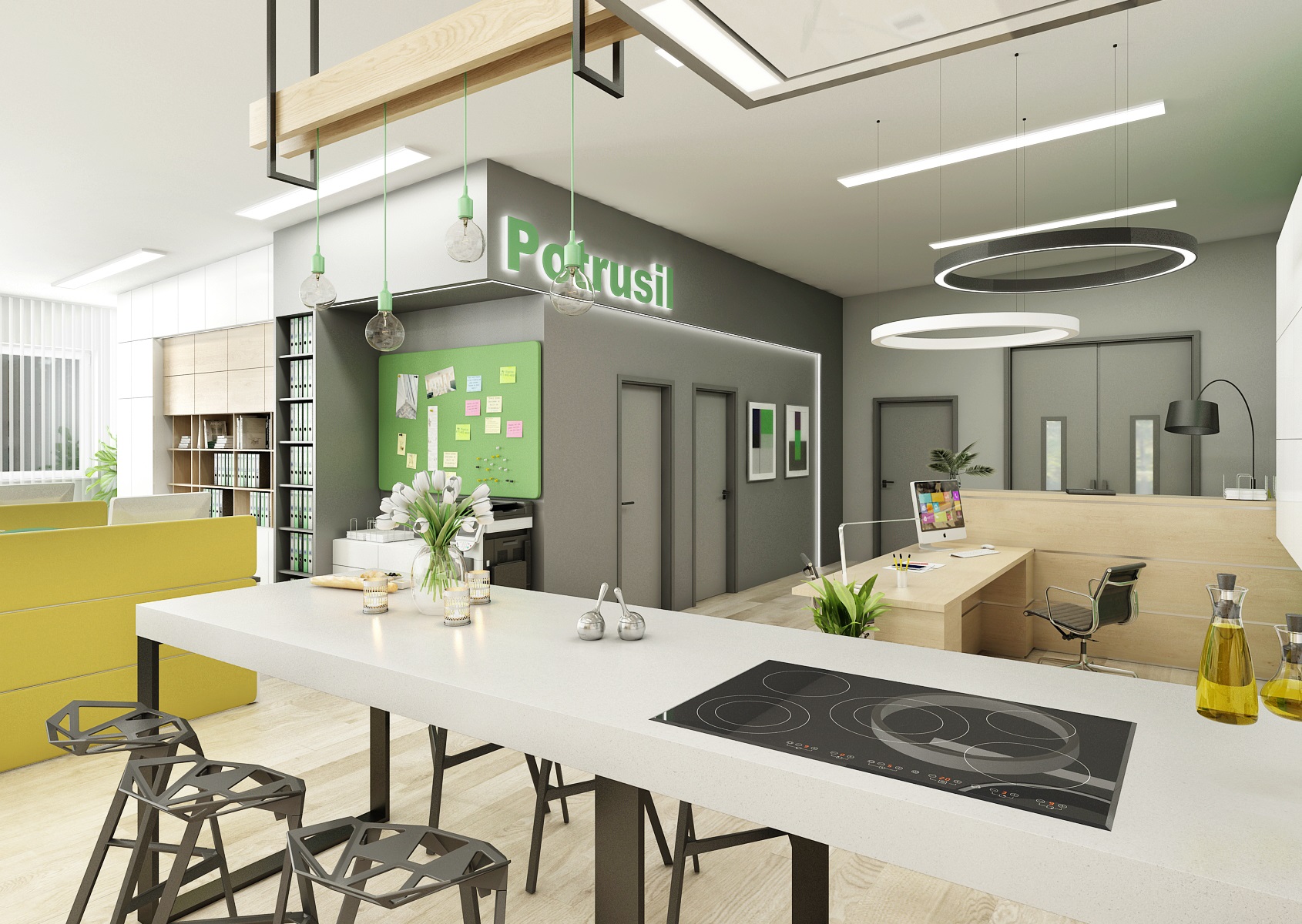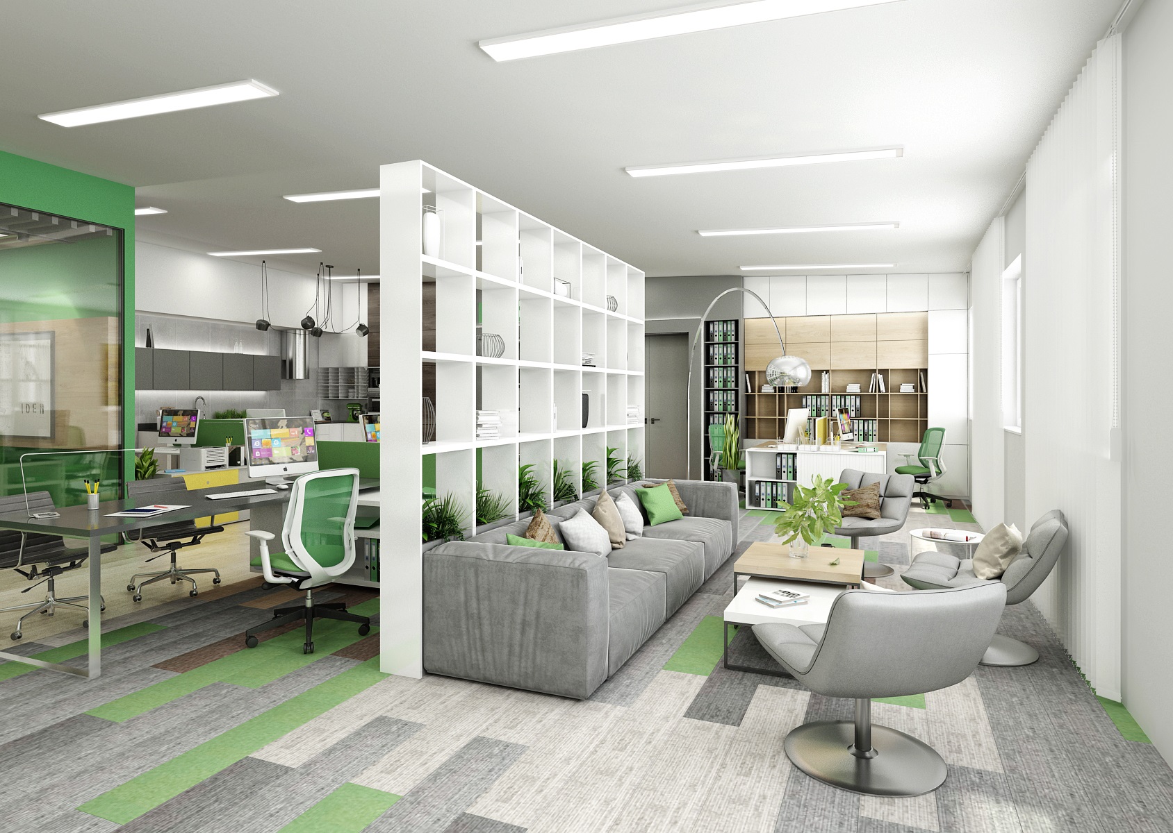 The space is used for the presentation of offered services, products or materials, as well as an office or meeting room for employees, which show their office lines directly in the area. In the interior design, in addition to neutral gray, white and wood, we mainly used the company's green color, which appears, for example, on painting, upholstery or parts of carpet strips.
