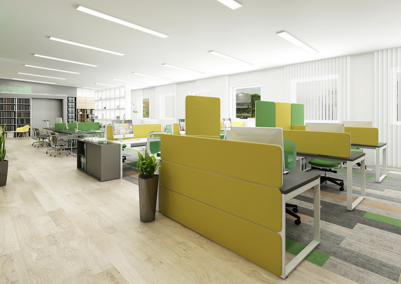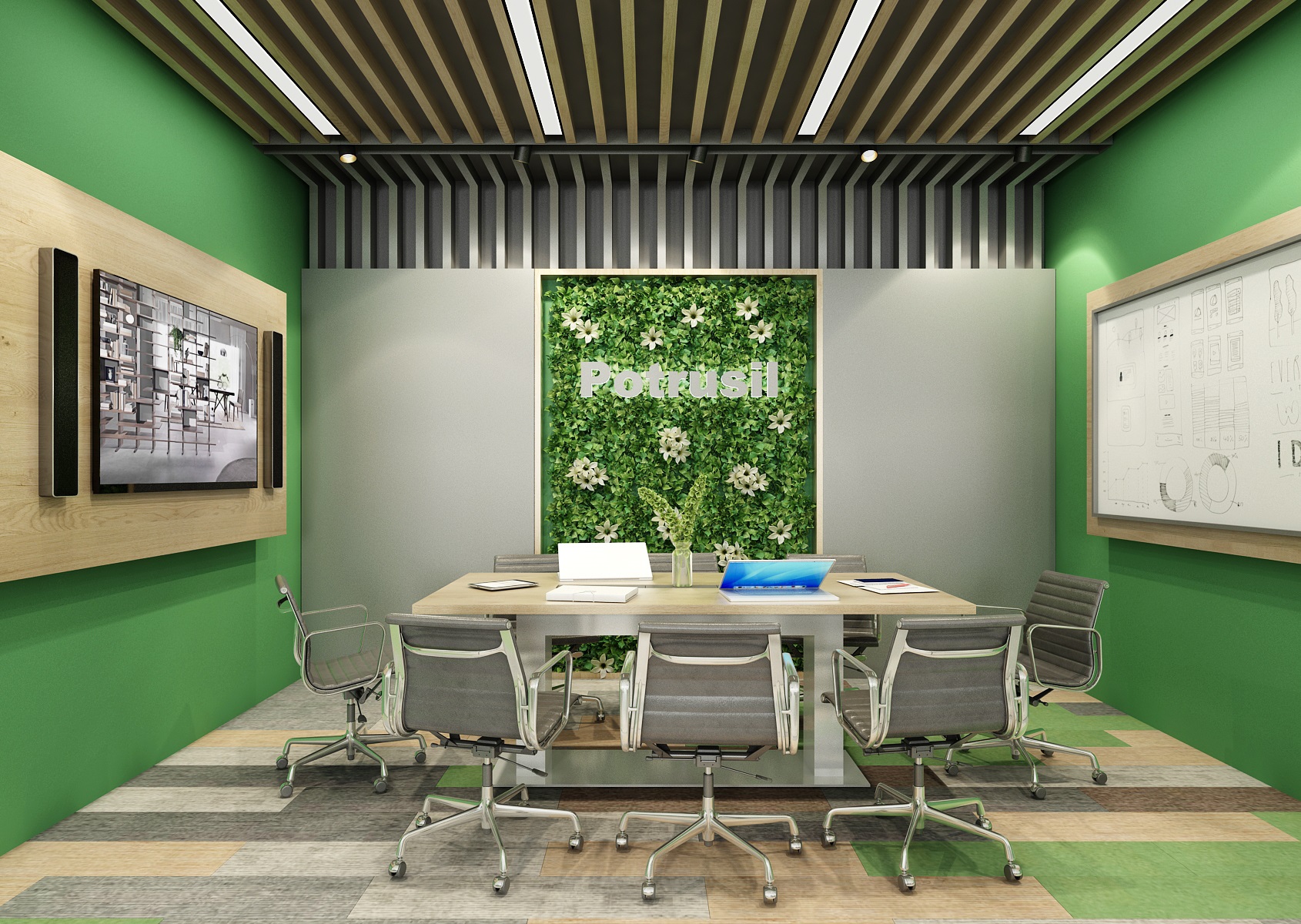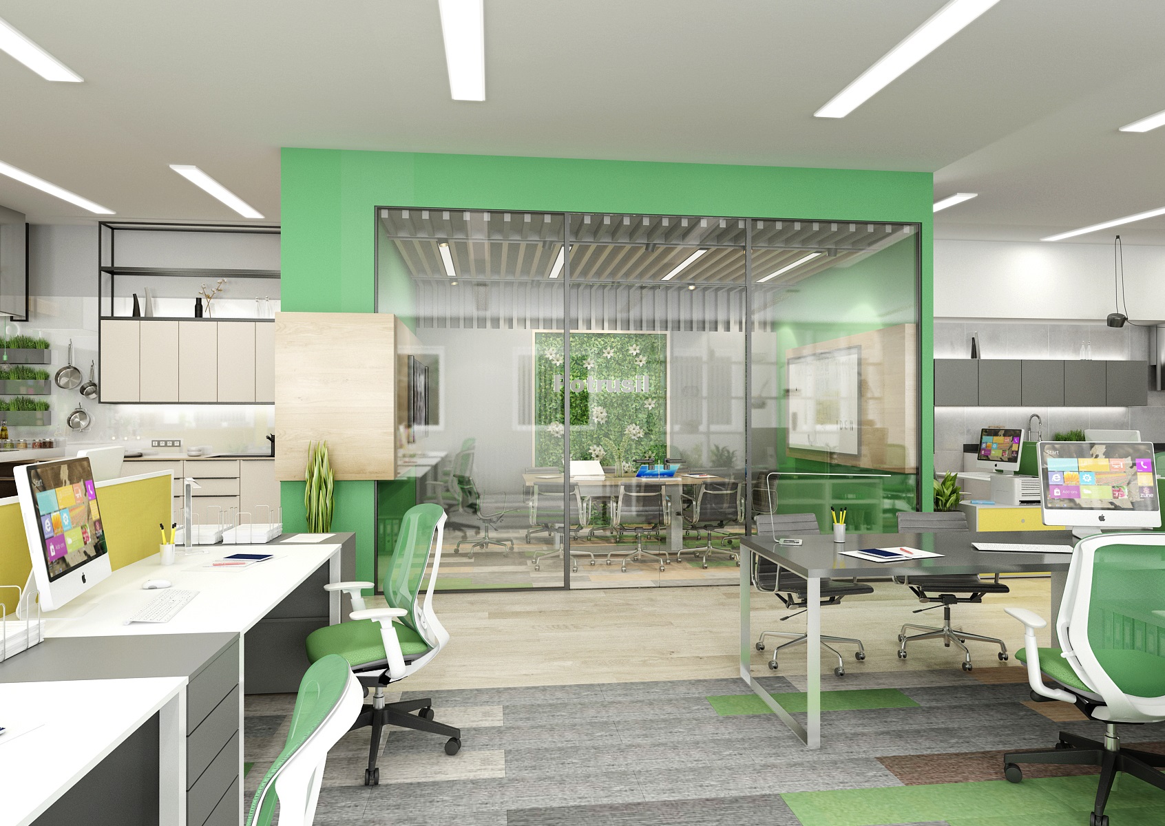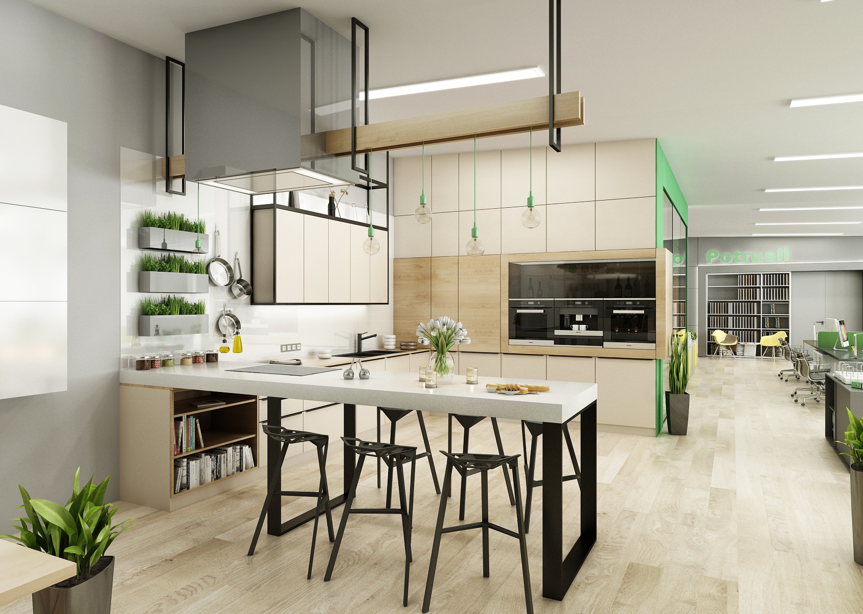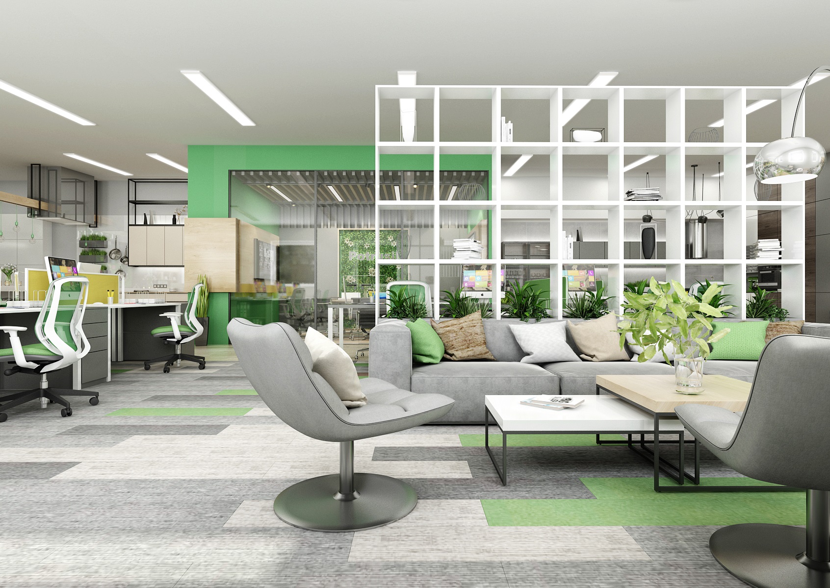 The space is used for the presentation of offered services, products or materials, as well as an office or meeting room for employees, which show their office lines directly in the area. In the interior design, in addition to neutral gray, white and wood, we mainly used the company's green color, which appears, for example, on painting, upholstery or parts of carpet strips.