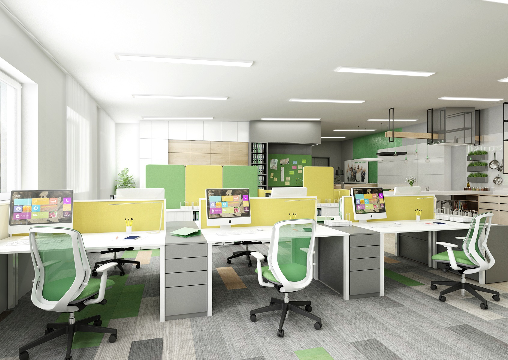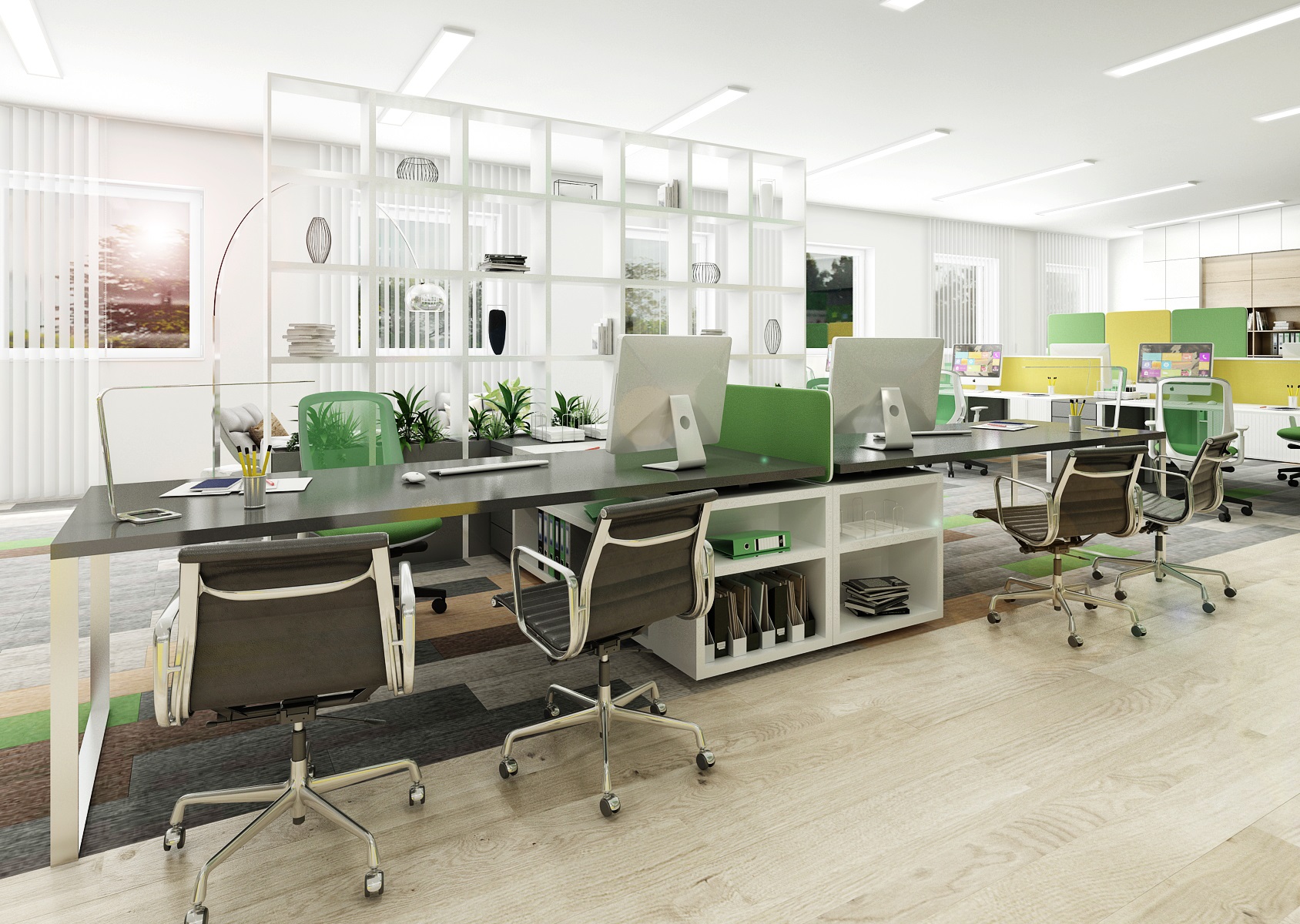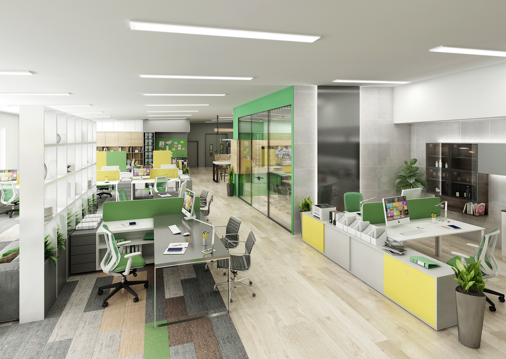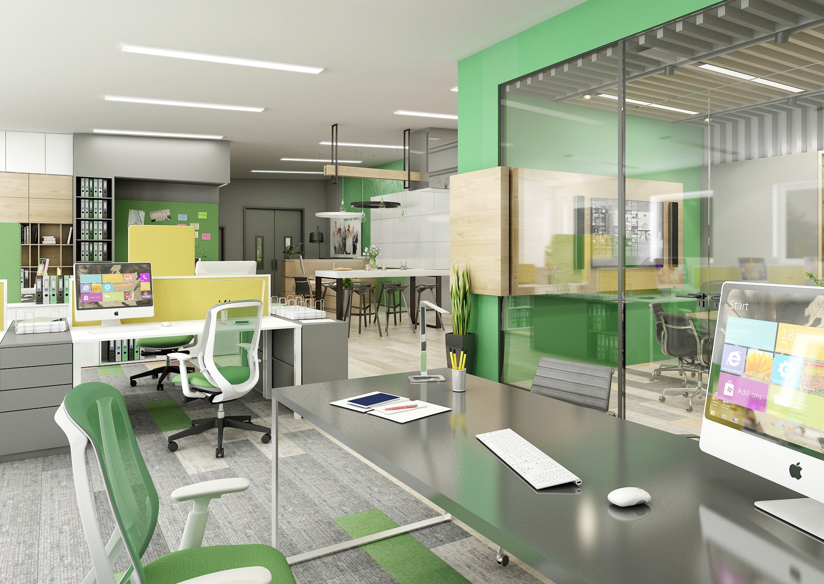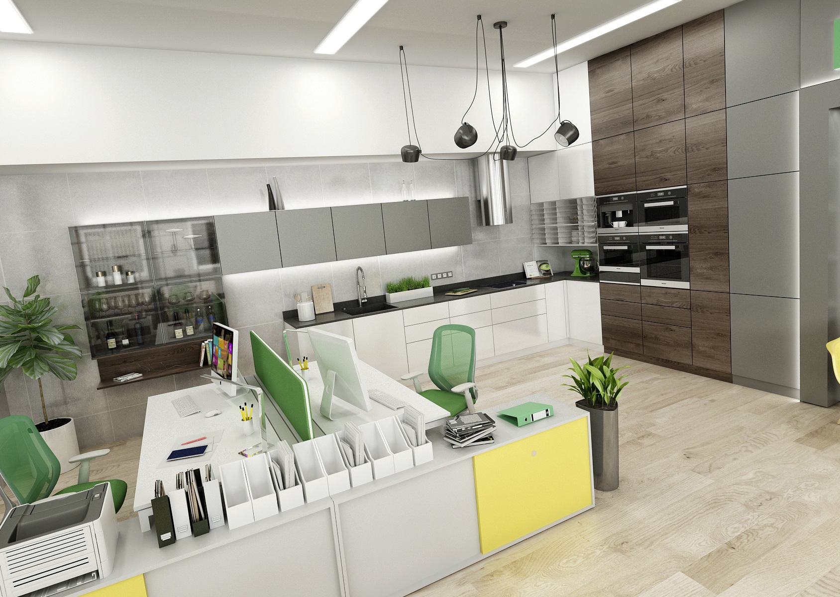 The space is used for the presentation of offered services, products or materials, as well as an office or meeting room for employees, which show their office lines directly in the area. In the interior design, in addition to neutral gray, white and wood, we mainly used the company's green color, which appears, for example, on painting, upholstery or parts of carpet strips.