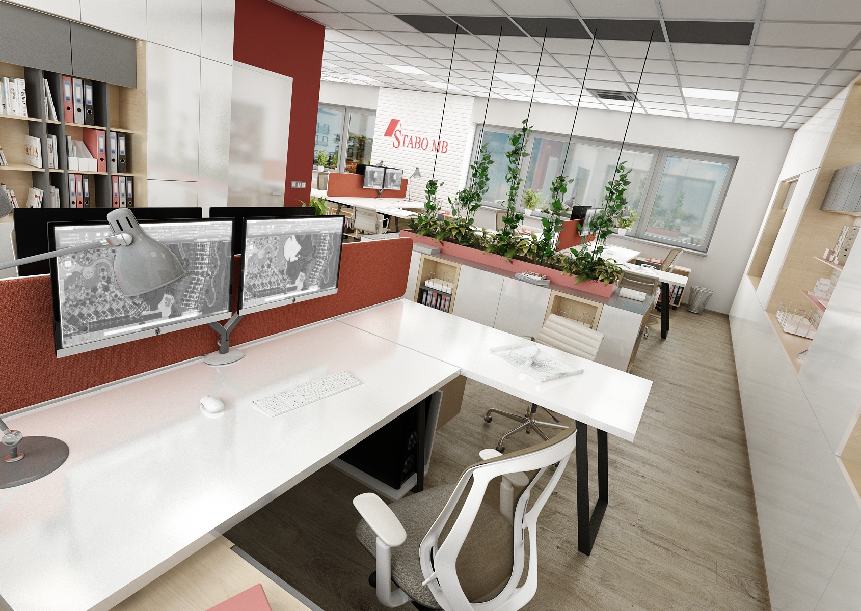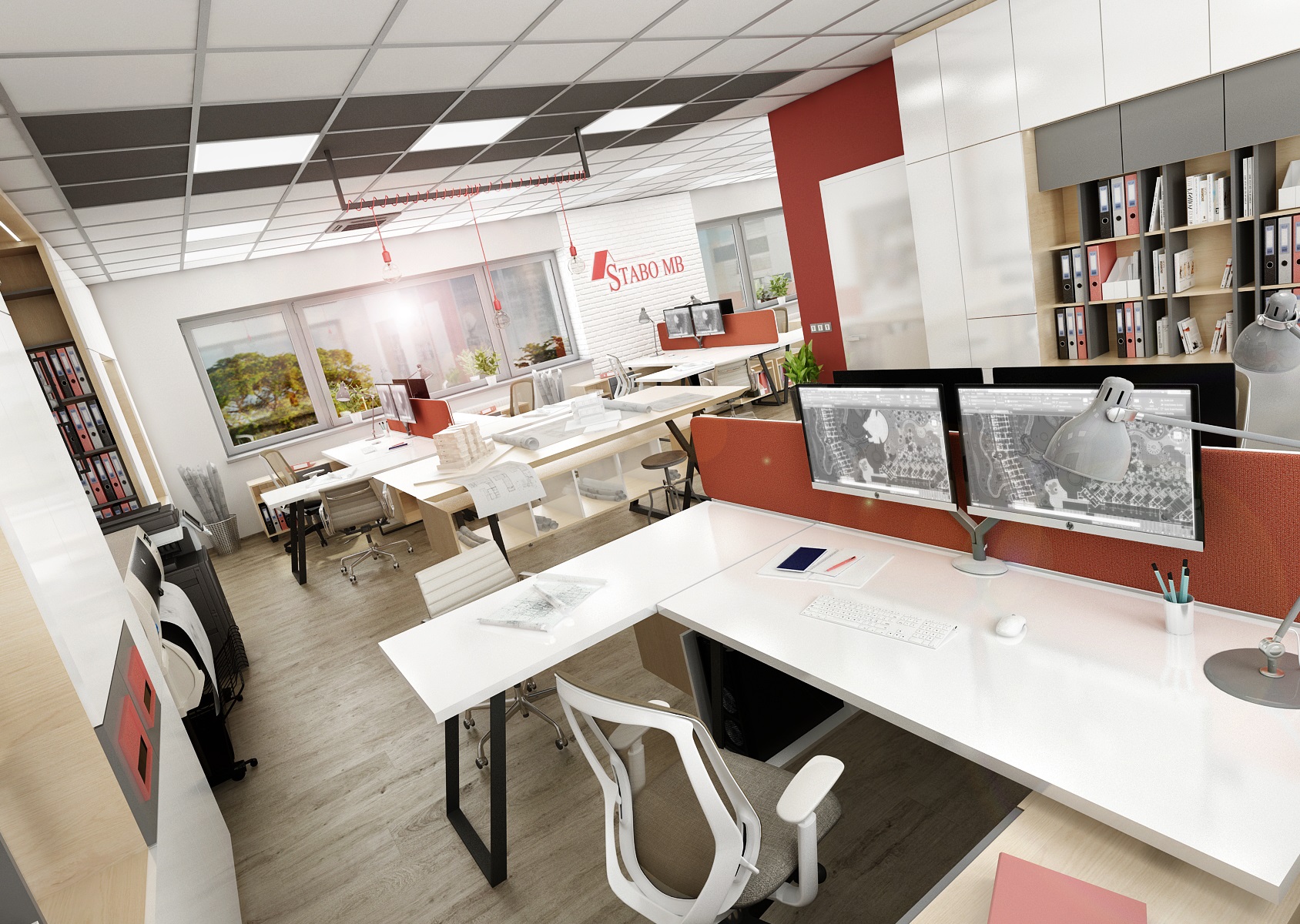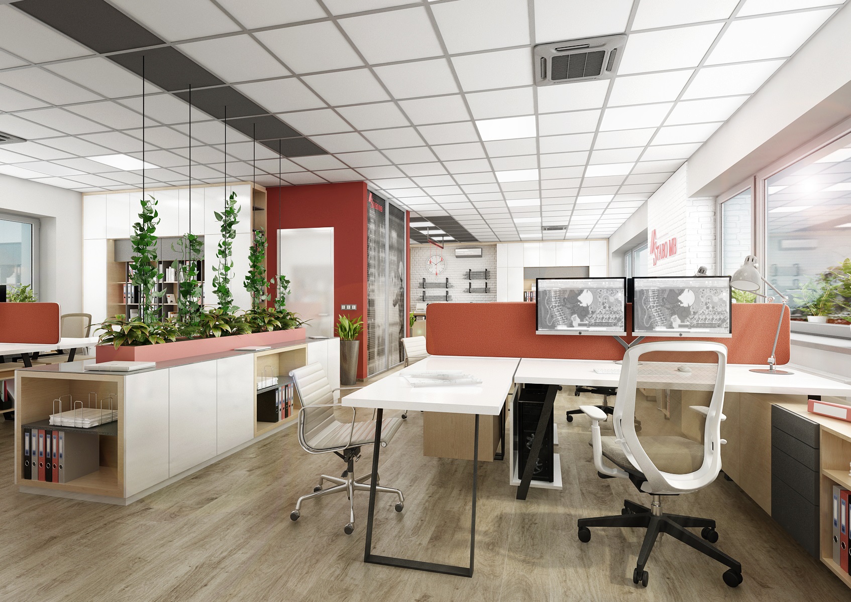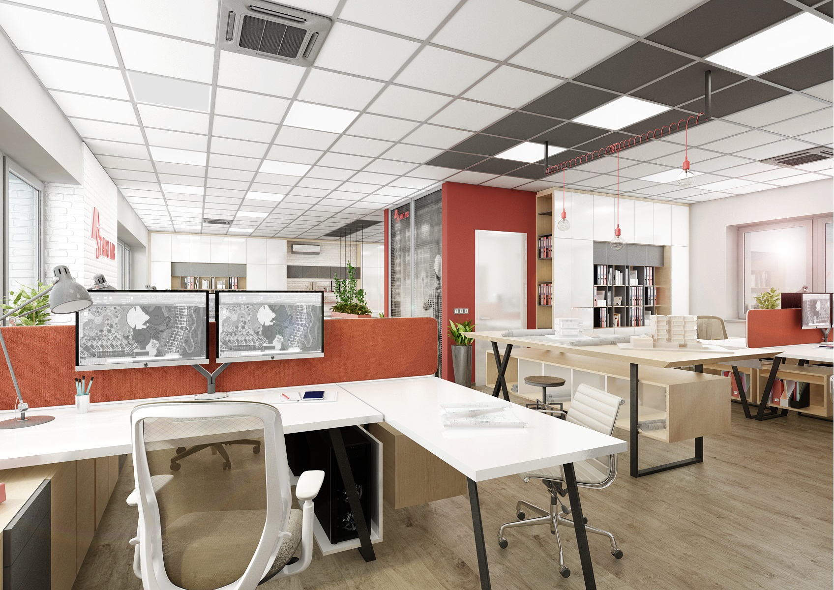 The company's red color is reflected in the parts of the wall painting, the color of the screens and the hanging light bulbs E27.