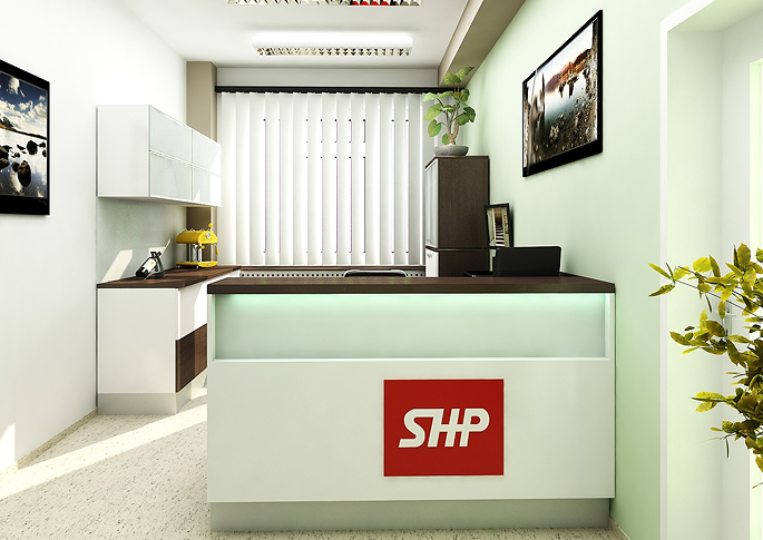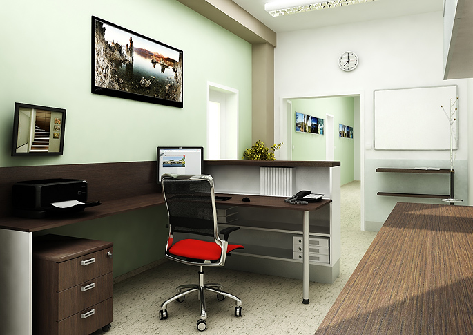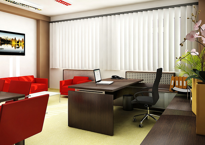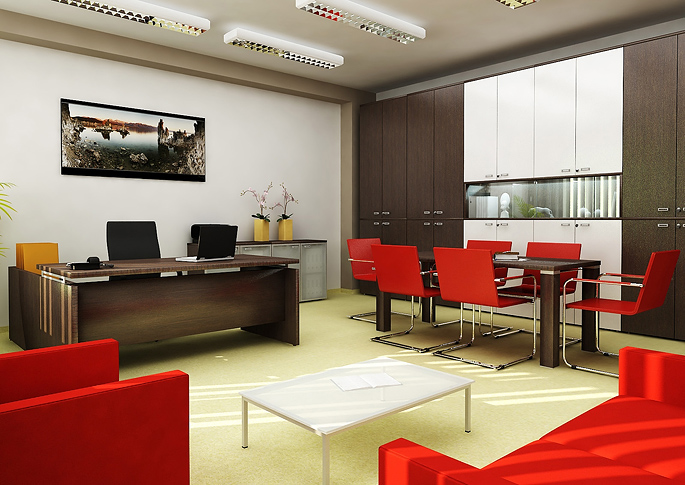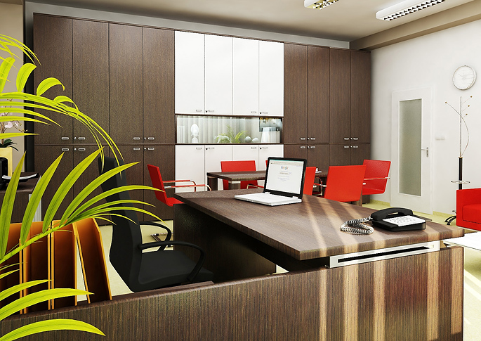 Director's office with built-in furniture wall and reception area for the secretariat in front of the entrance. Wenge veneer material with a combination of white gloss. Red elements of furniture in the form of sofas and chairs are chosen to diversify the interior, which brighten the room and make it happier. There are also a few yellow accessories. The reception is decorated in light blue tones in combination with a white floor.