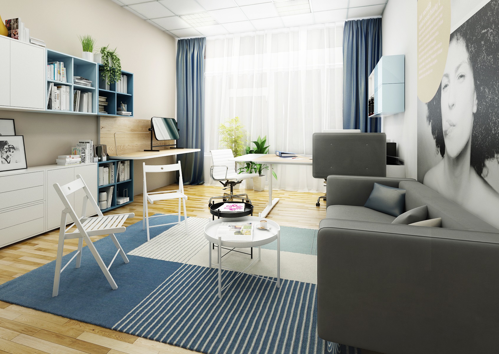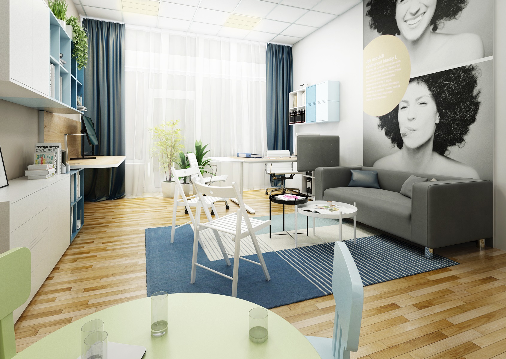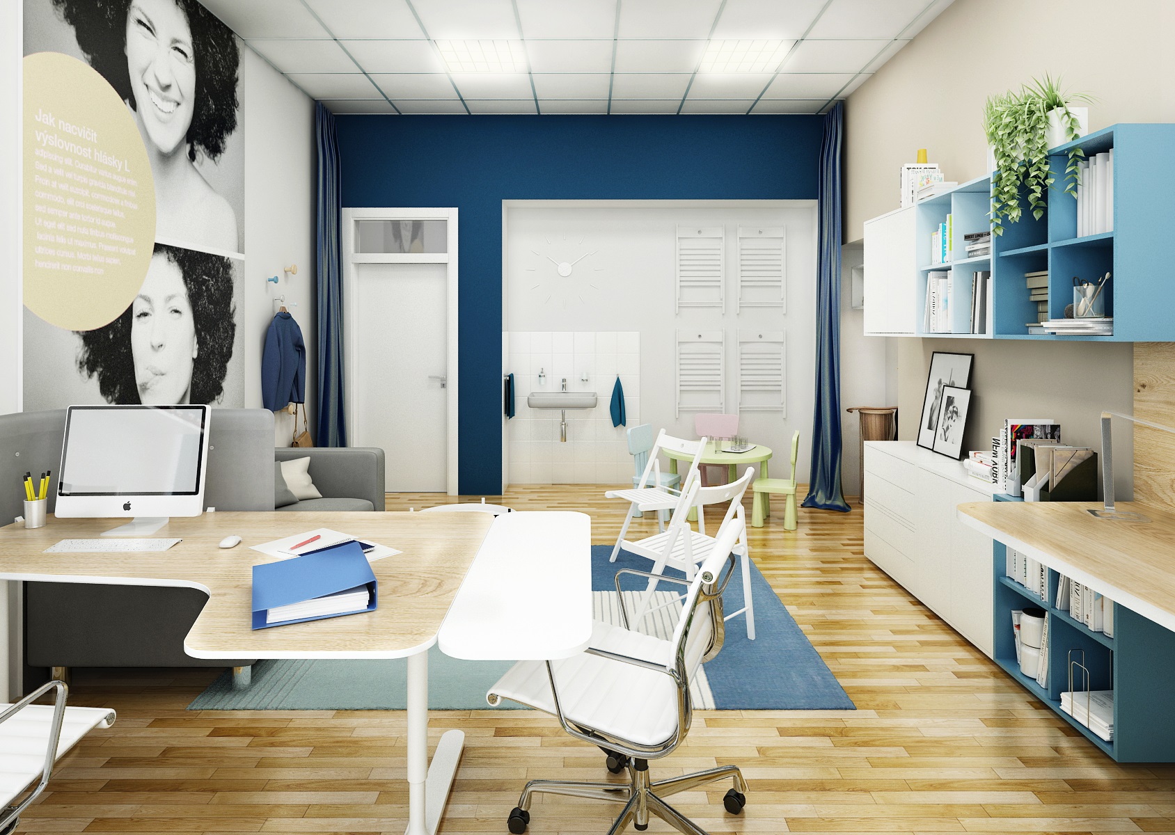 When designing the speech therapy surgery, we based mainly on Ikea furniture in white, blue and oak. We chose the BEKANT work table, EKET cabinet sets are used for storage spaces. From the seating furniture, there is, for example, a KLIPPAN sofa, a TERJE folding chair and, for the smallest chairs and a MAMMUT table.