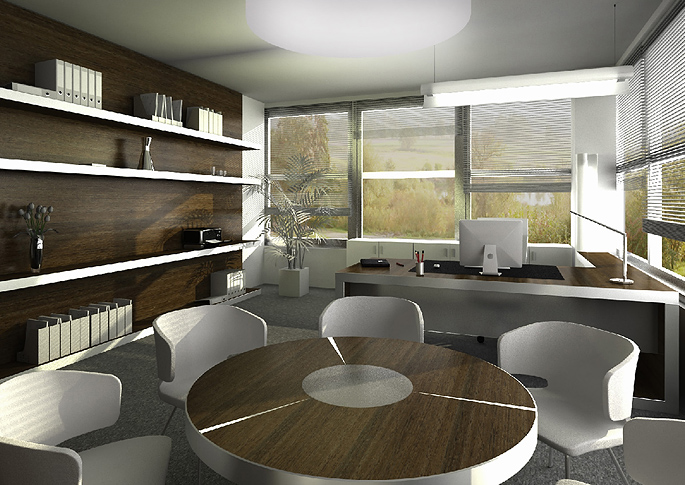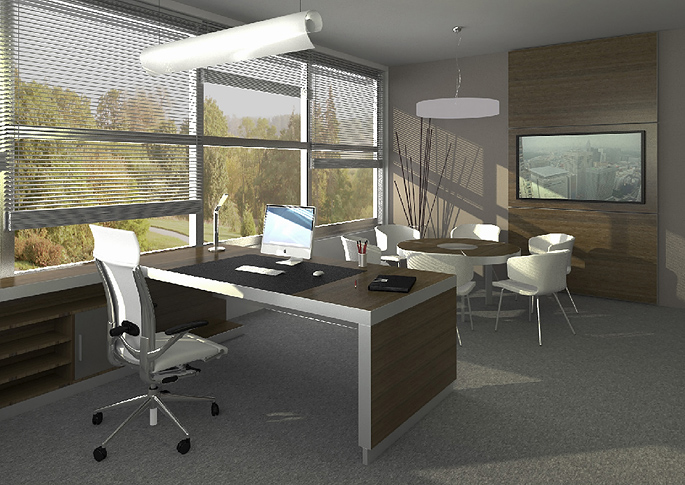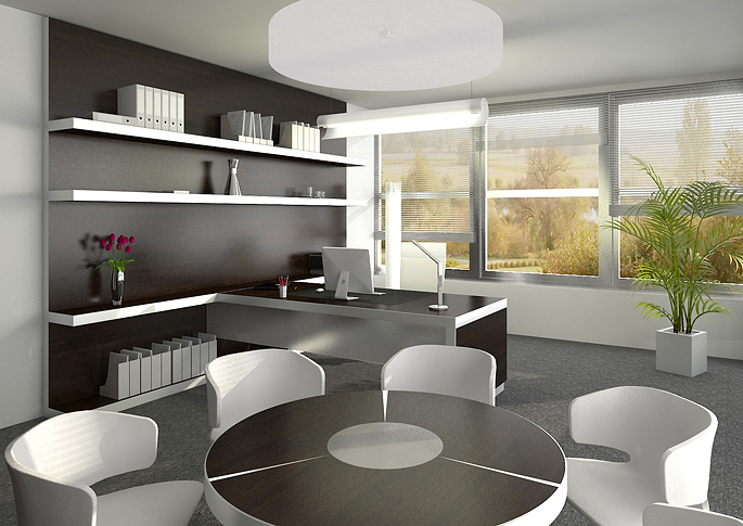 Director's design office in a dark style with stainless steel accessories. A meeting room with a round table is included. Thanks to the combination of white with dark wood decor, the whole space looks modern and minimalist. The clean design is aided by a simple gray carpet without a pattern. In the room, plenty of natural light is provided by large windows along the entire length of the wall and allow a view of nature.