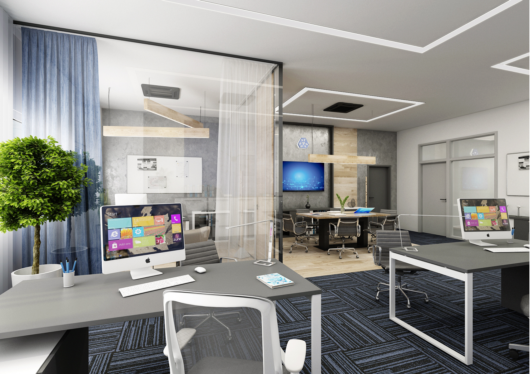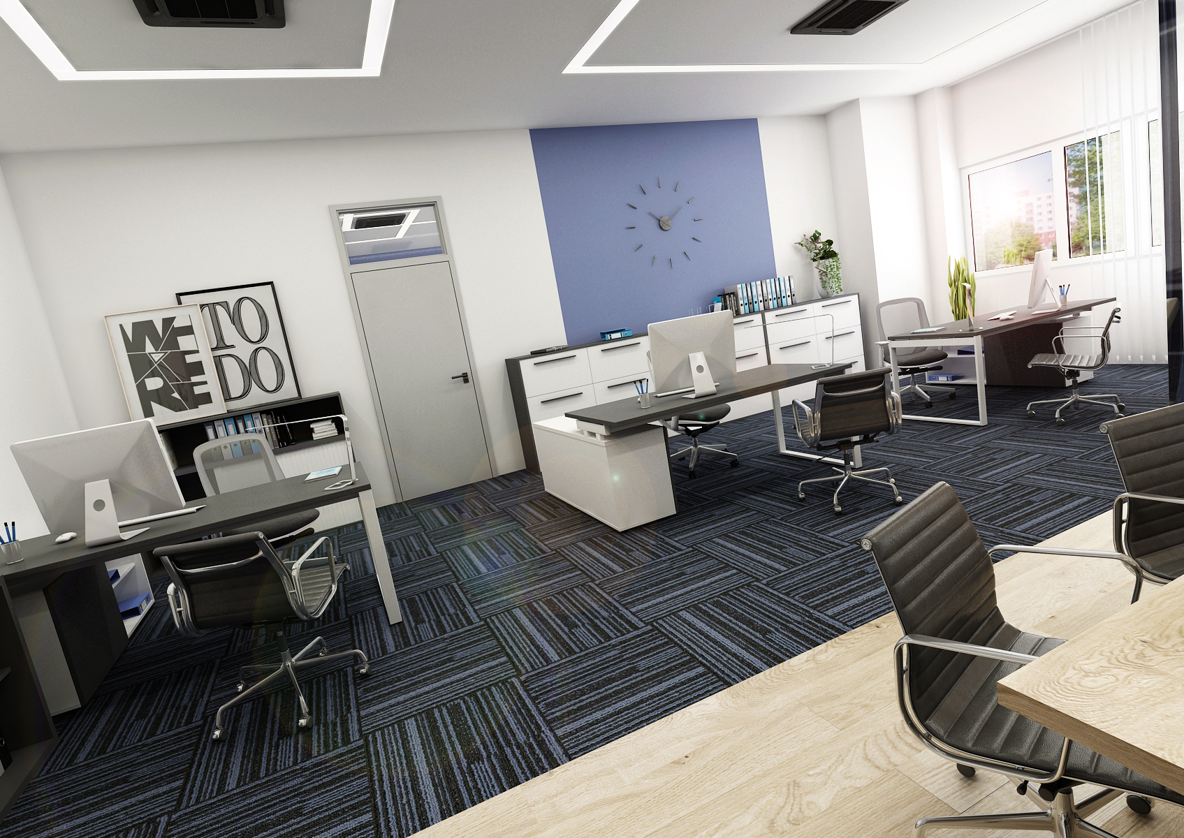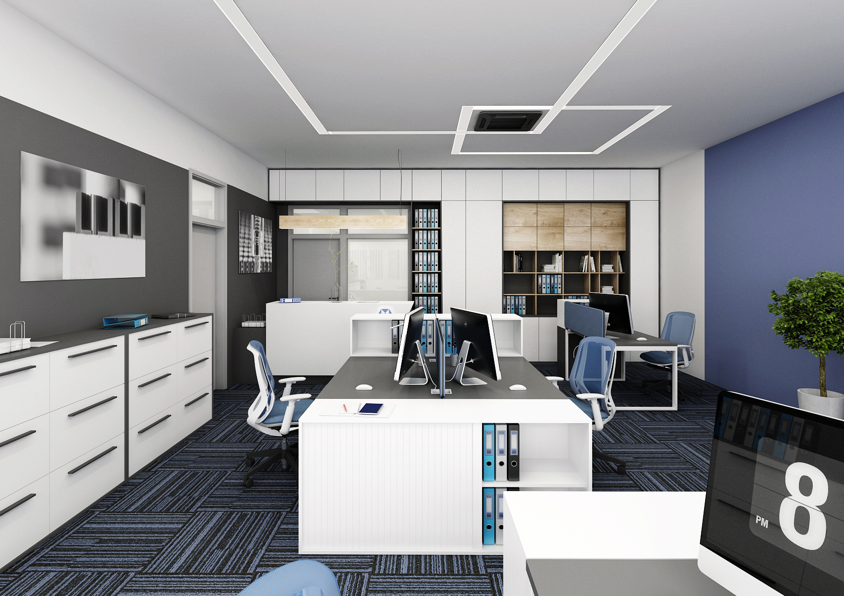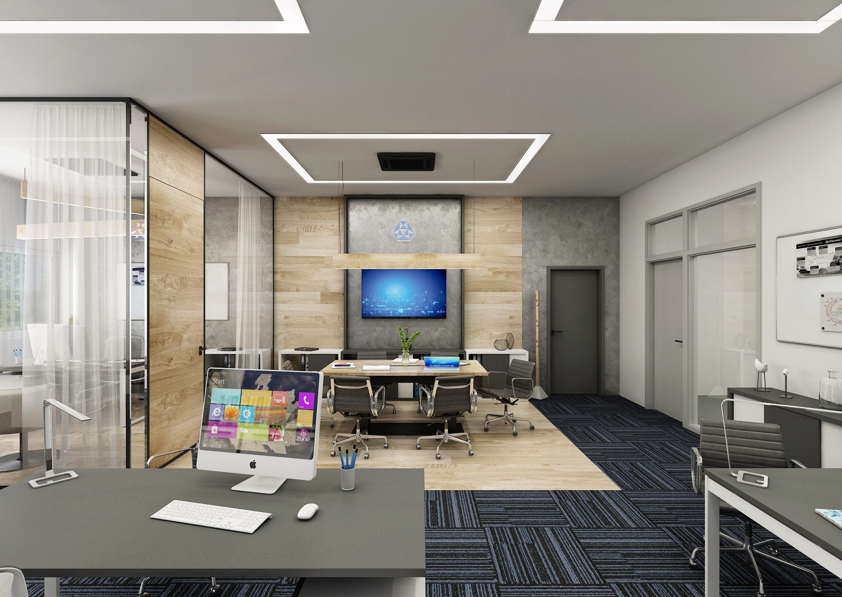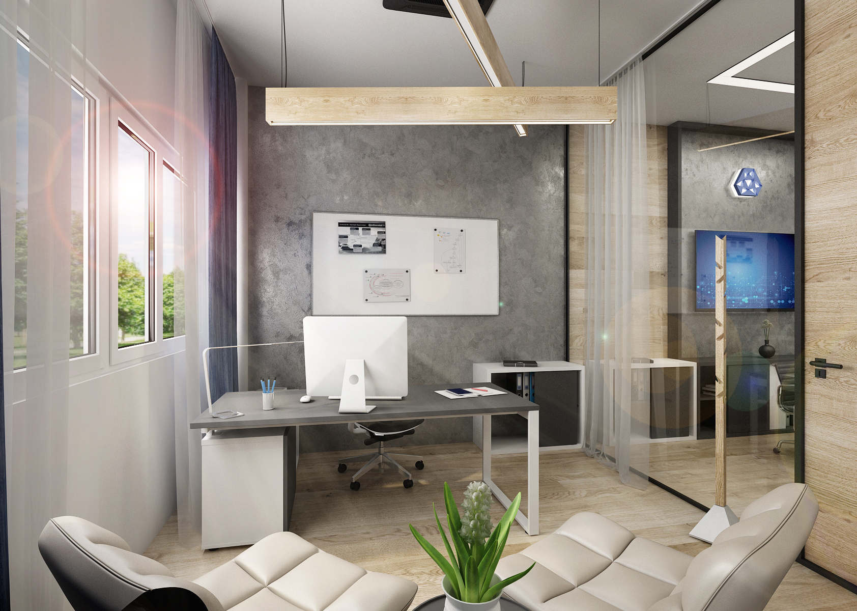 Natural oak wood decor insulates otherwise simply furnished office spaces. Neutral white-gray furniture from standard elements from the Lino Design company is not only practical, but also aesthetic. It's complemented by custom-made furniture in the same design. Different materials on the floor, glued carpet squares and vinyl floor, imaginarily divide the space into meeting and office. For meetings behind closed doors, the manager's office is used, separated by a large-format glass in an aluminum frame. Accessories in blue honors the corporate color