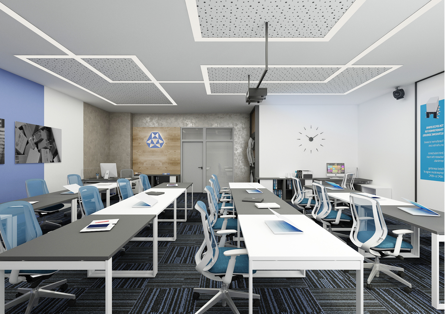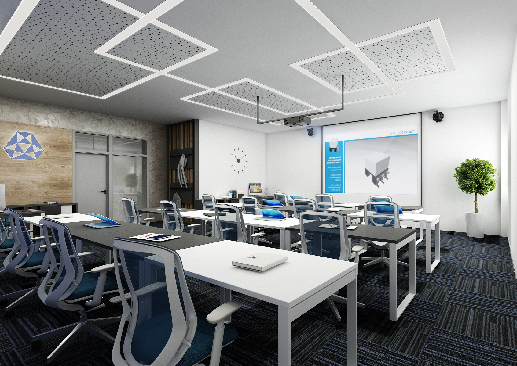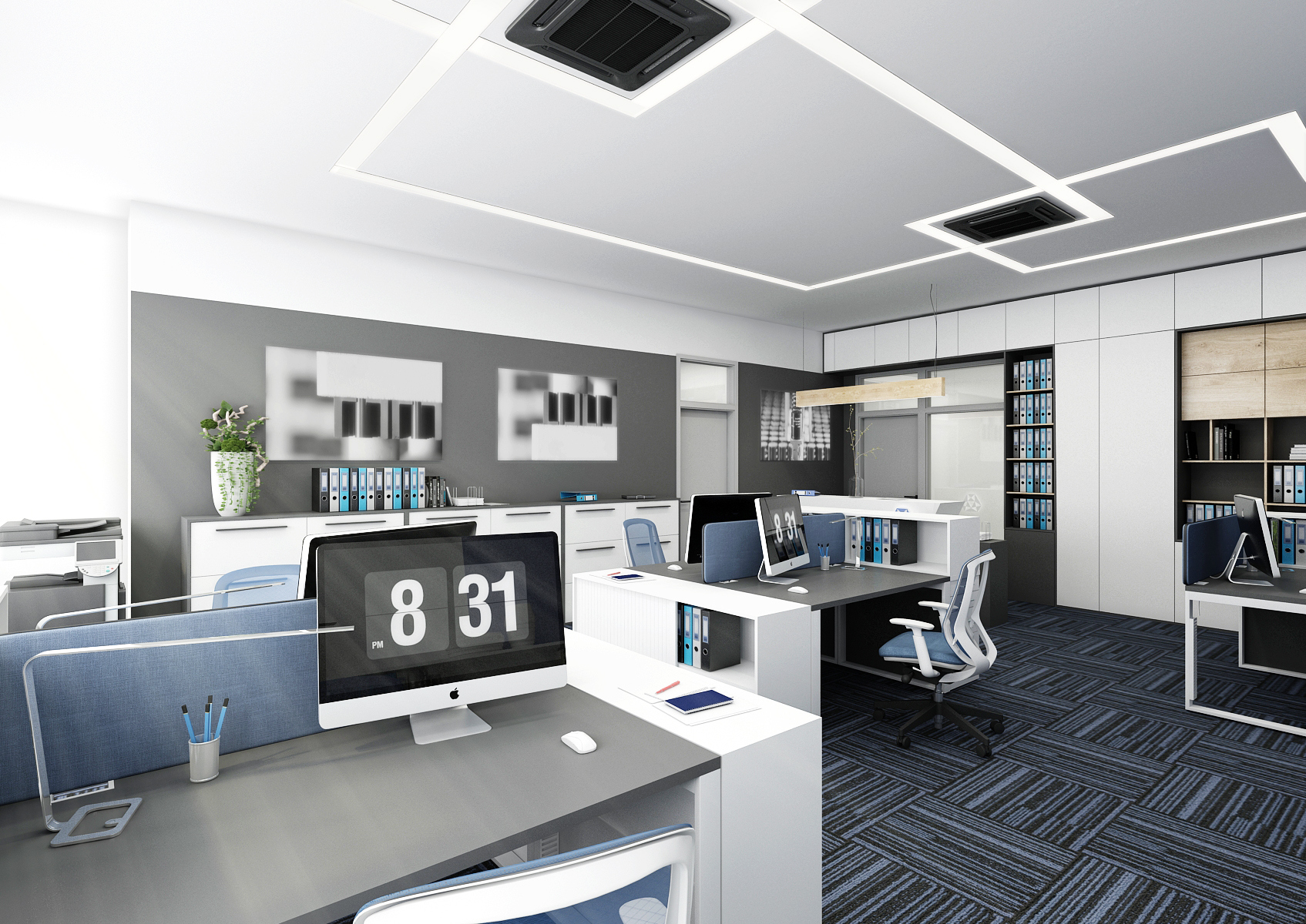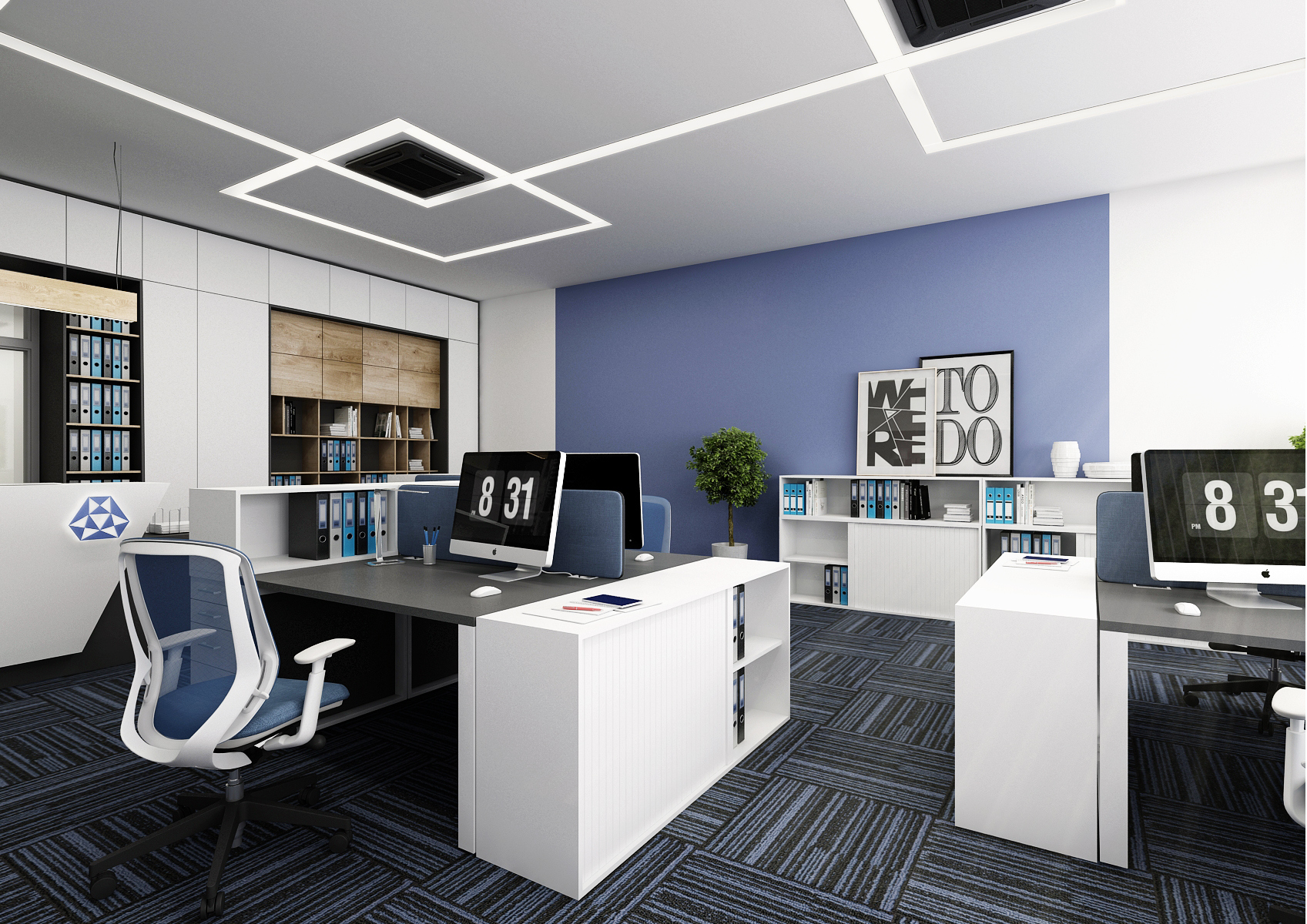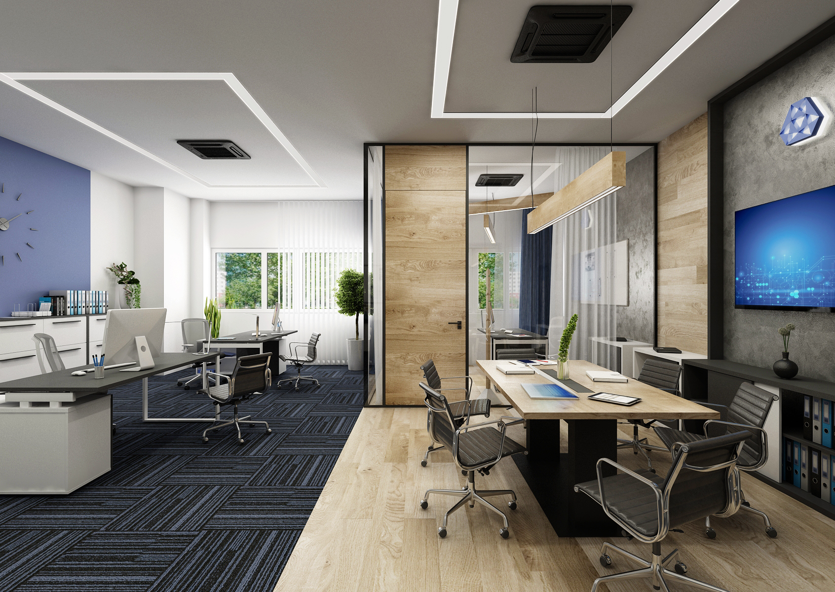 Natural oak wood decor insulates otherwise simply furnished office spaces. Neutral white-gray furniture from standard elements from the Lino Design company is not only practical, but also aesthetic. It's complemented by custom-made furniture in the same design. Different materials on the floor, glued carpet squares and vinyl floor, imaginarily divide the space into meeting and office. For meetings behind closed doors, the manager's office is used, separated by a large-format glass in an aluminum frame. Accessories in blue honors the corporate color