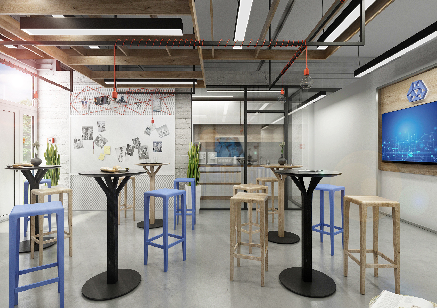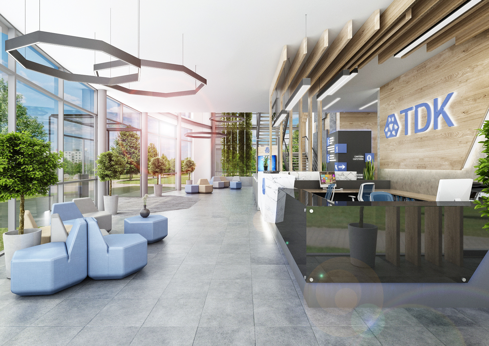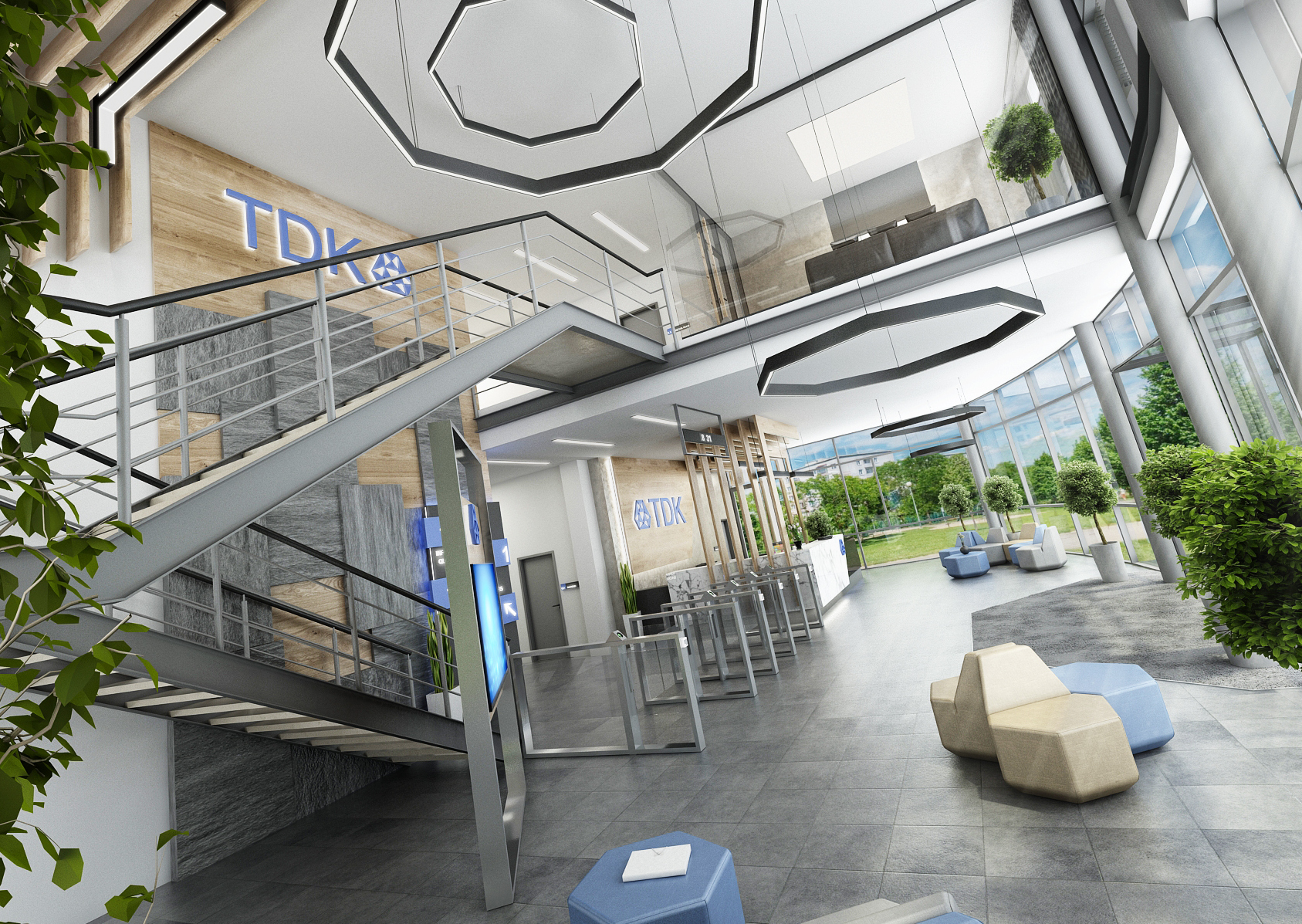 With the entrance hall and reception, we make the first impression. Materials such as black Lacobel, granite and wood paneling are sufficiently representative. The stools in the lobby have the shape of irregular hexagons, thus copying the shape of the company emblem. The glazed meeting room above the staircase is more like a living room. The kitchen with seating for employees, built in an unused technical space, is equally tastefully furnished.