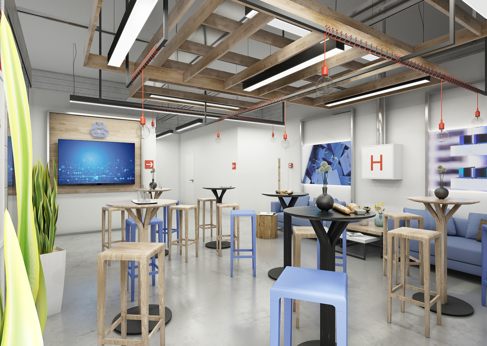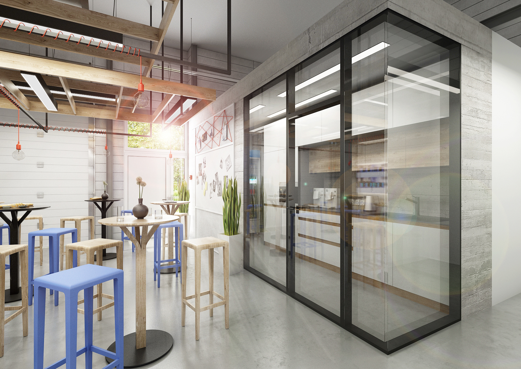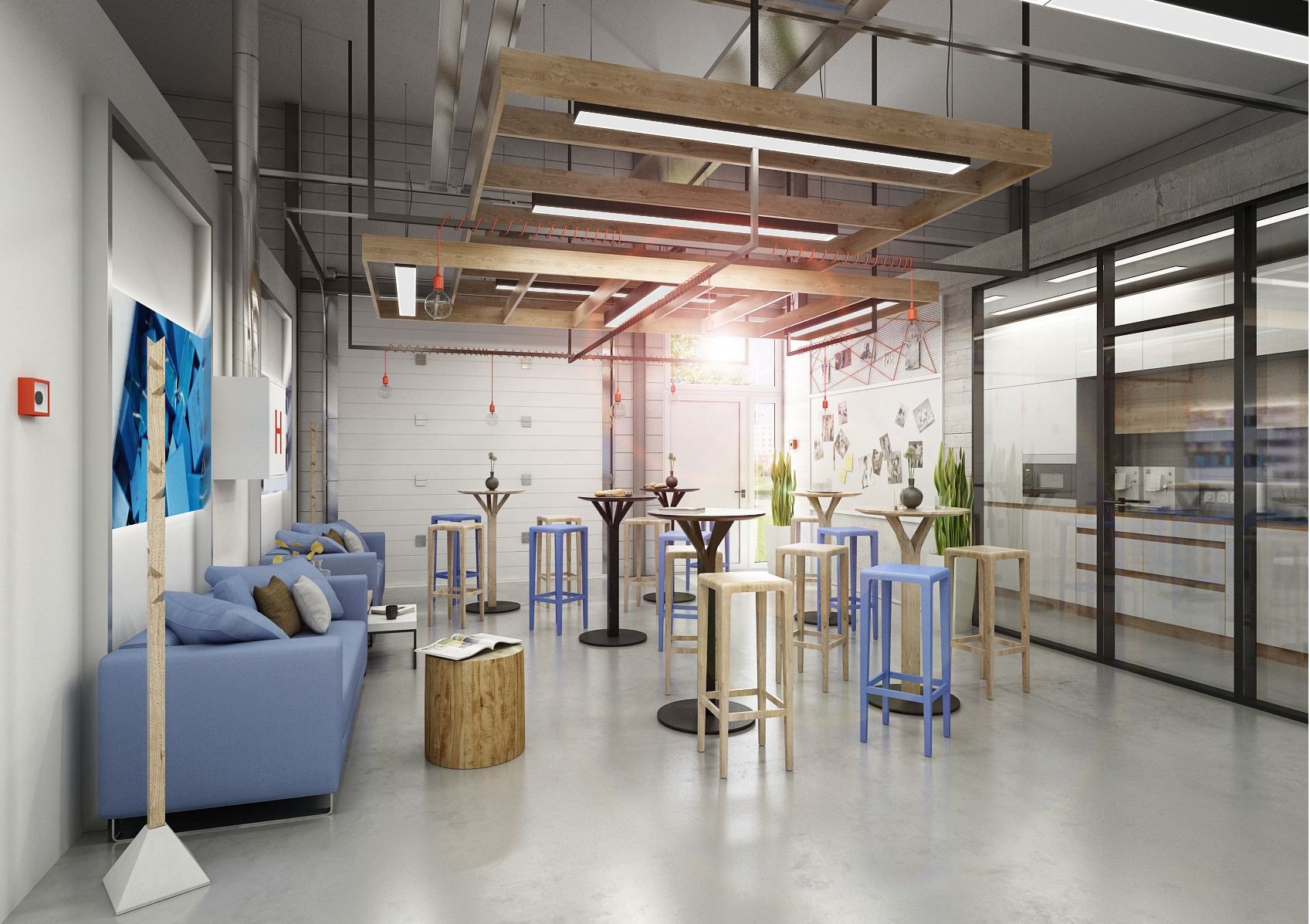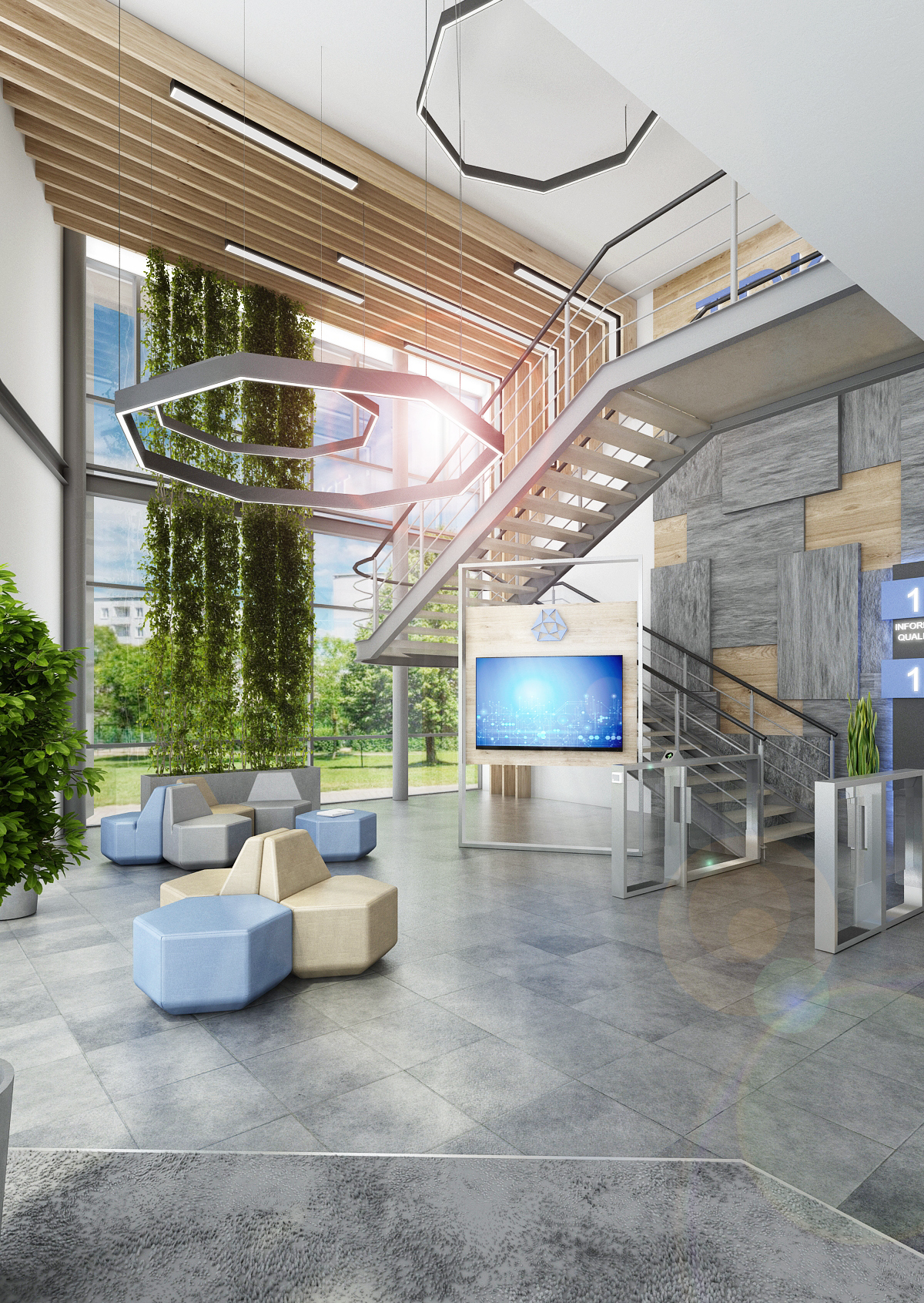 With the entrance hall and reception, we make the first impression. Materials such as black Lacobel, granite and wood paneling are sufficiently representative. The stools in the lobby have the shape of irregular hexagons, thus copying the shape of the company emblem. The glazed meeting room above the staircase is more like a living room. The kitchen with seating for employees, built in an unused technical space, is equally tastefully furnished.