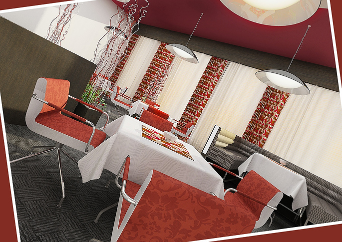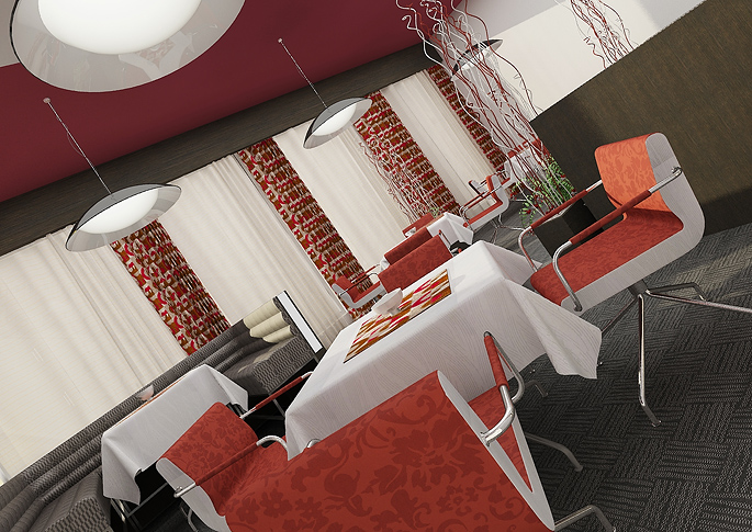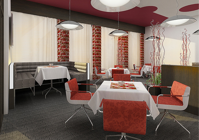 The space of the hotel restaurant is decorated in red-gray. The upholstery and carpet are matched into one pattern. Tables chrome legs and chairs complete the clean and modern interior of the restaurant. An interesting element are the storey lamps and colorfully patterned wallpaper on the columns between the windows. Decorations and paintings on the ceiling are also tuned to red.