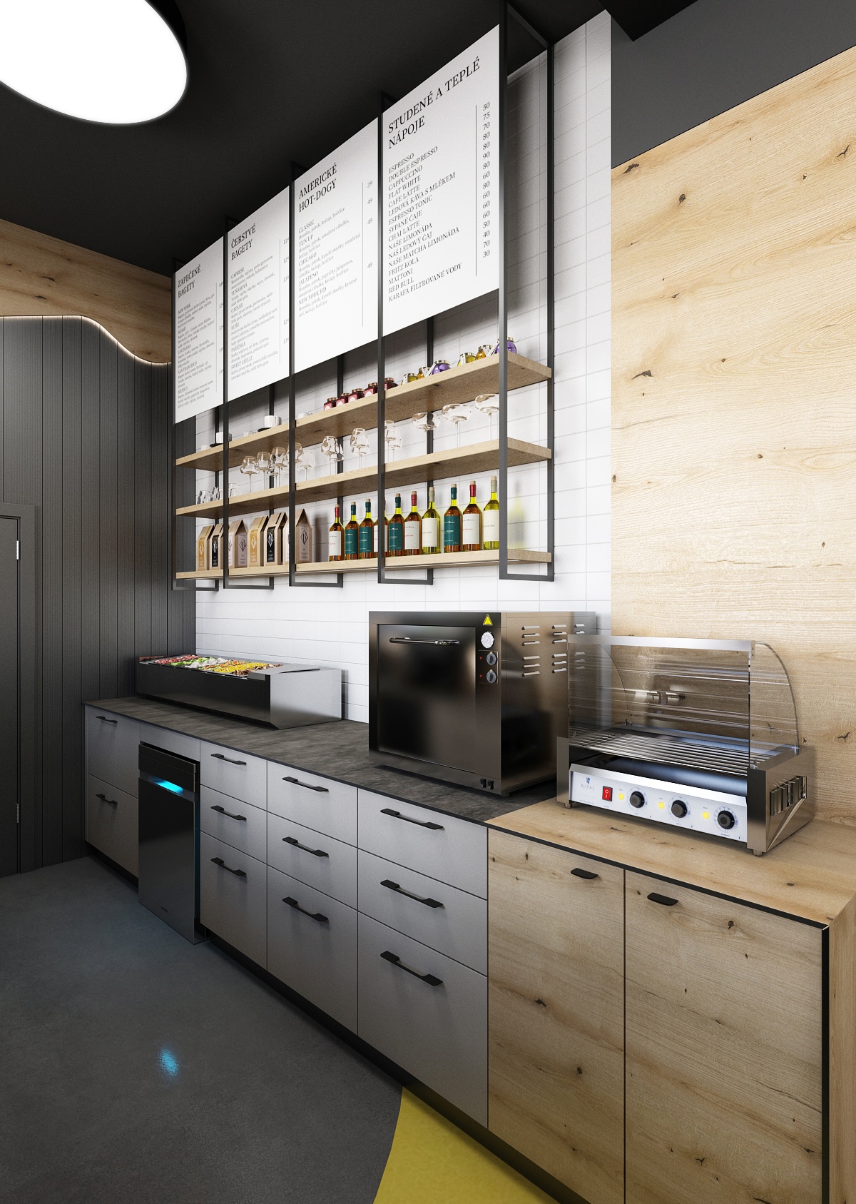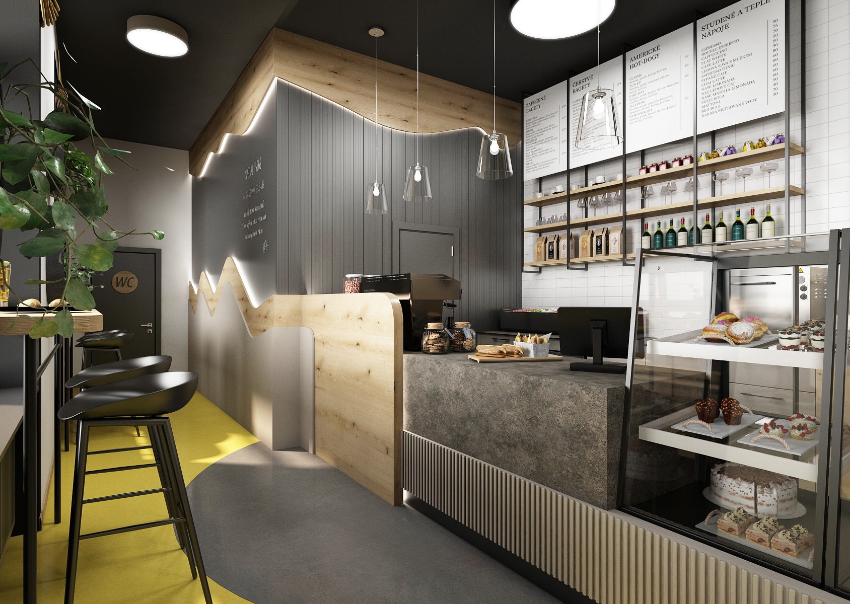 A large part of the attention is also taken by the sales pulse with a window, which is complemented by 3D cut-outs of wood decor with LED backlighting around the perimeter. At the same time, attention was paid to every detail, including the choice of lighting. The counter is complemented by translucent glass lamps, while the seating area is decorated with minimalist hanging lamps. Ambient lighting is also present in the atypical ceiling slope, which was cleverly integrated into the interior.