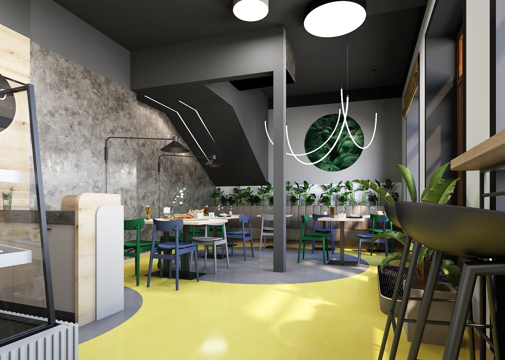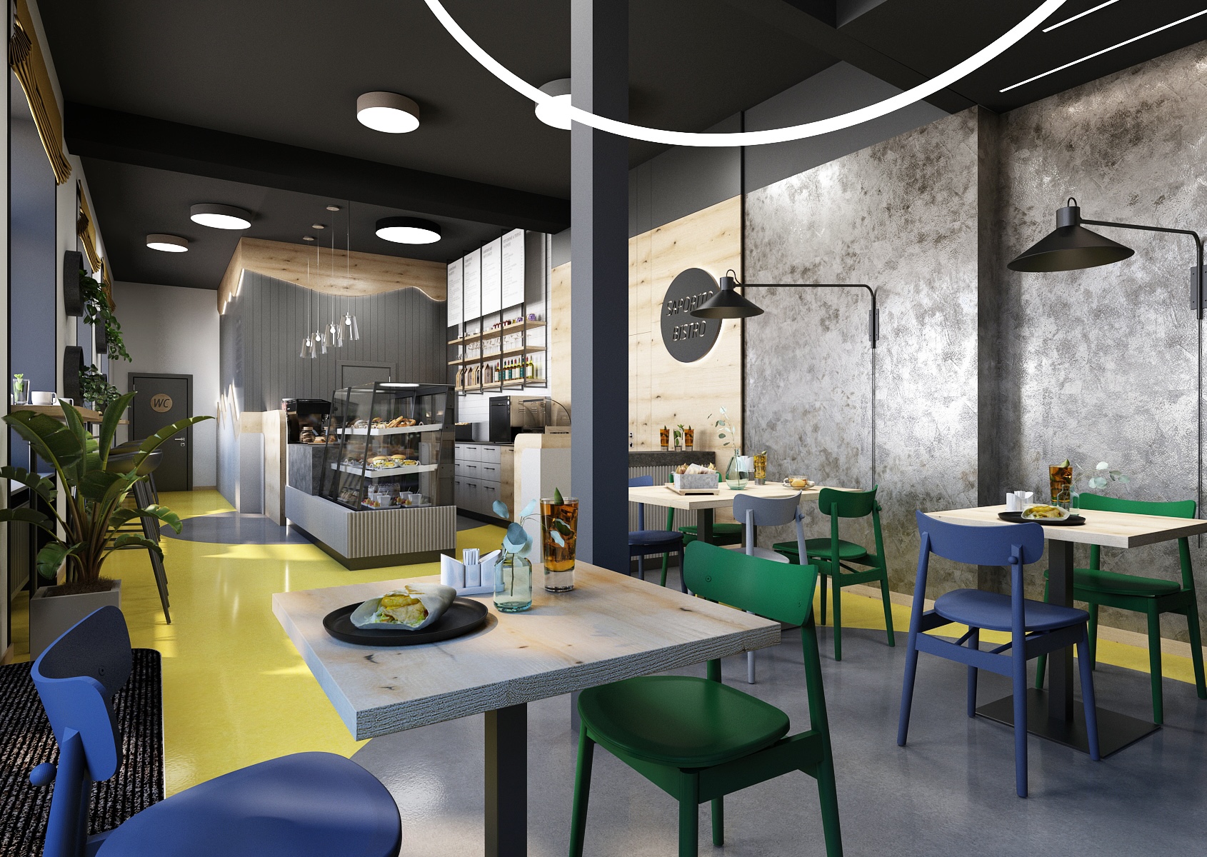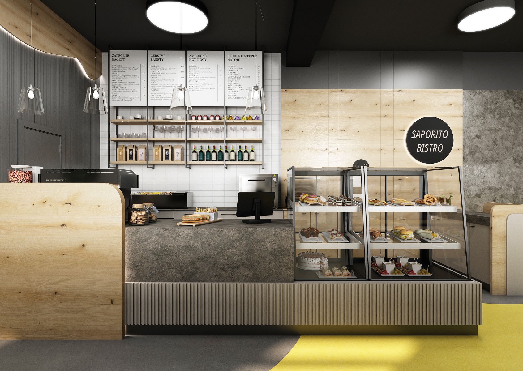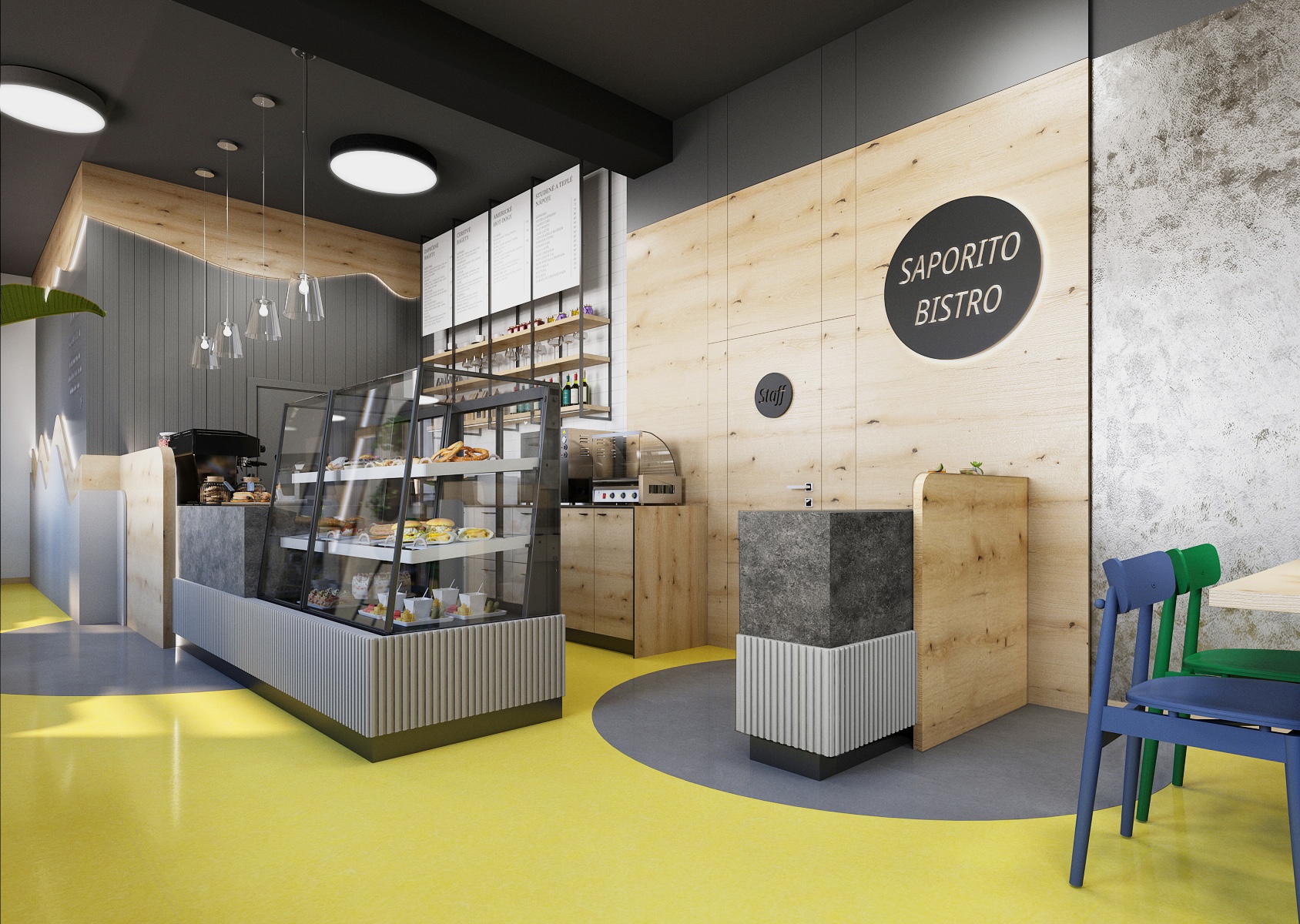 Bistro Saporito is tuned to dark shades of colors, which are combined with oak wood decor and accents of yellow, blue and green.