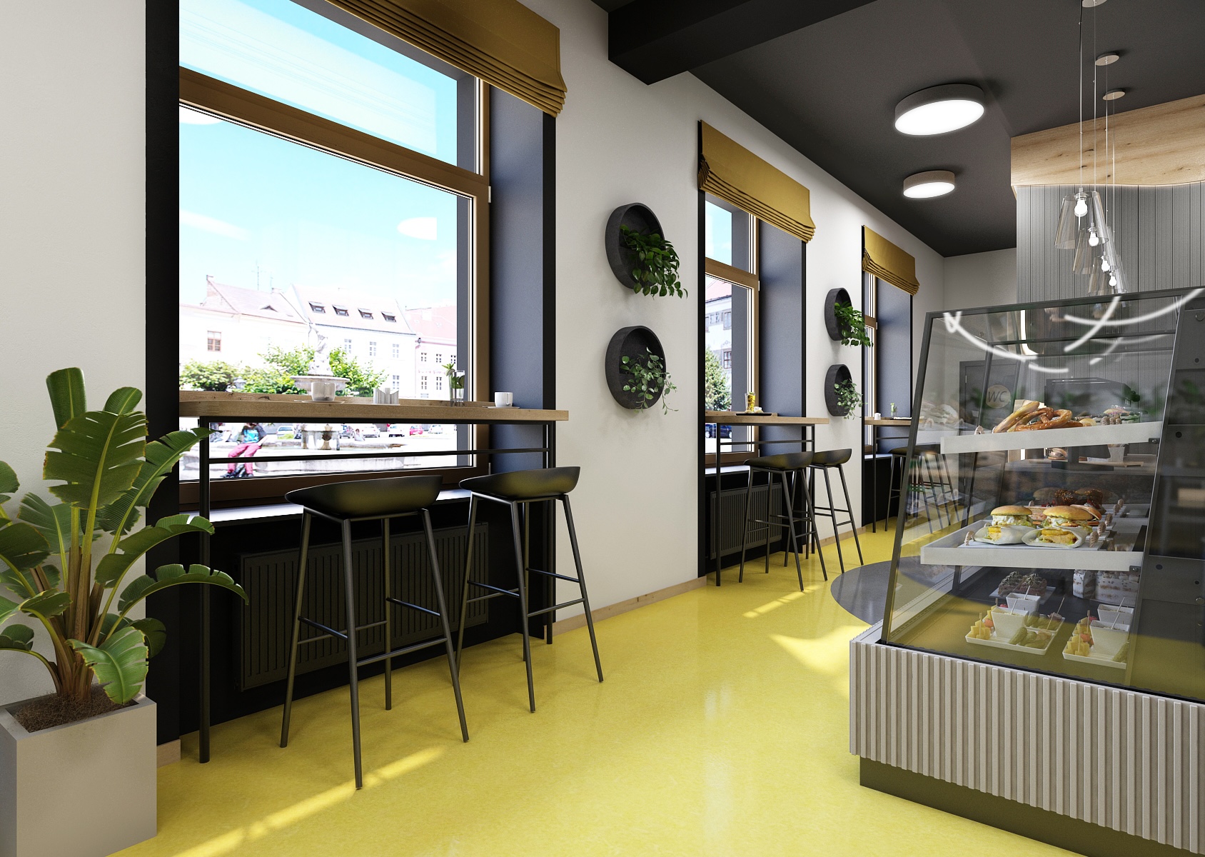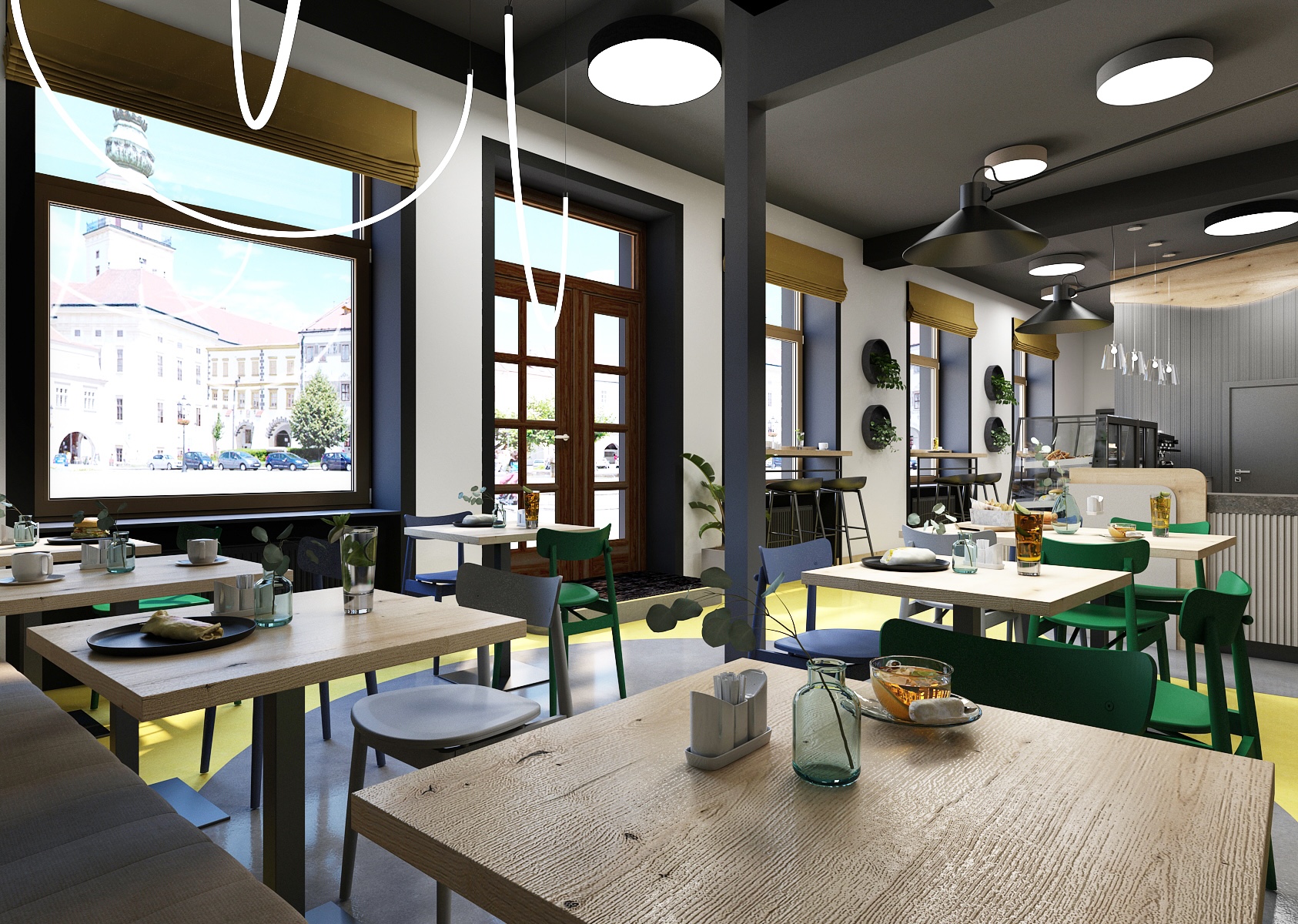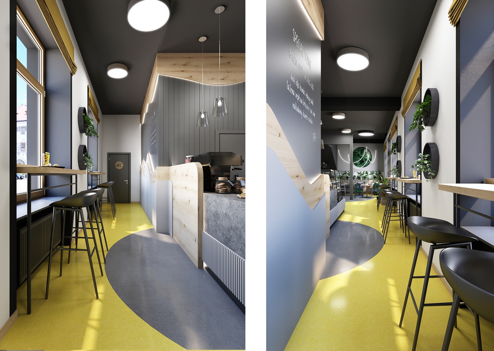 When you enter the interior, you are greeted by the open space of the bistro, where there is something worth a bit of attention at every corner. The connection with nature is also reflected here in the choice of decorations and color accents. The premises are complemented by greenery, whether in the presentation of plants, the choice of colors of the equipment or the graphics on the wall.